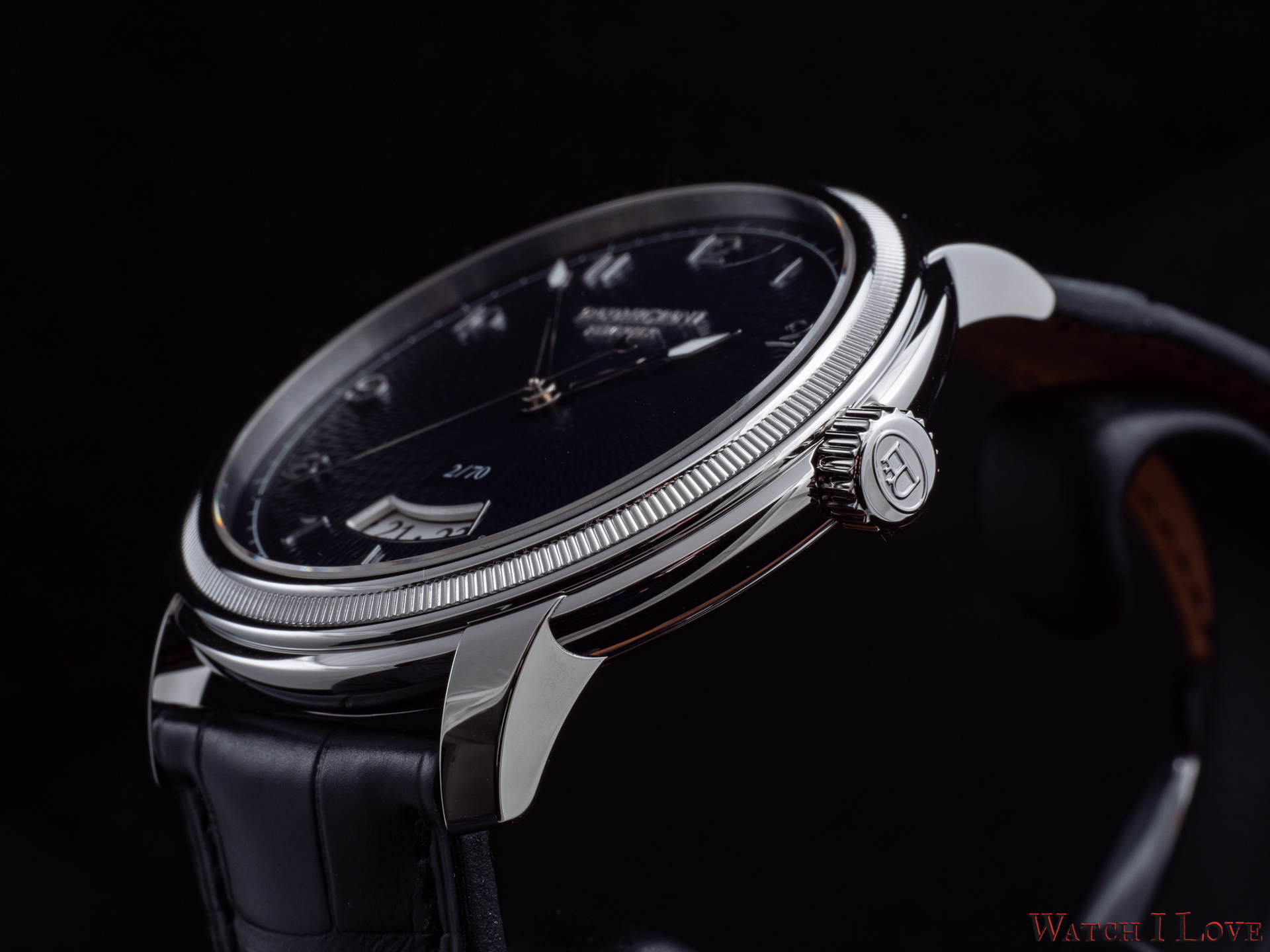 Parmigiani Toric Héritage case, in polished steel, takes its inspiration from ancient Greek columns and from a pointed shell Michel found on a beach in Malaysia, with hand-done knurling and doubly alternating gadroons embellishing its curved contours, creating an optical illusion of great delicacy. Every aspect of the watch design is rooted in this ancient rule- the relationship between the hands, the fluted angles in the crown, the length to width ratios, the rate of curvature of the lugs as they taper away from the case, even the case-back design and placement of the sapphire crystal. – excerpt from the official press release