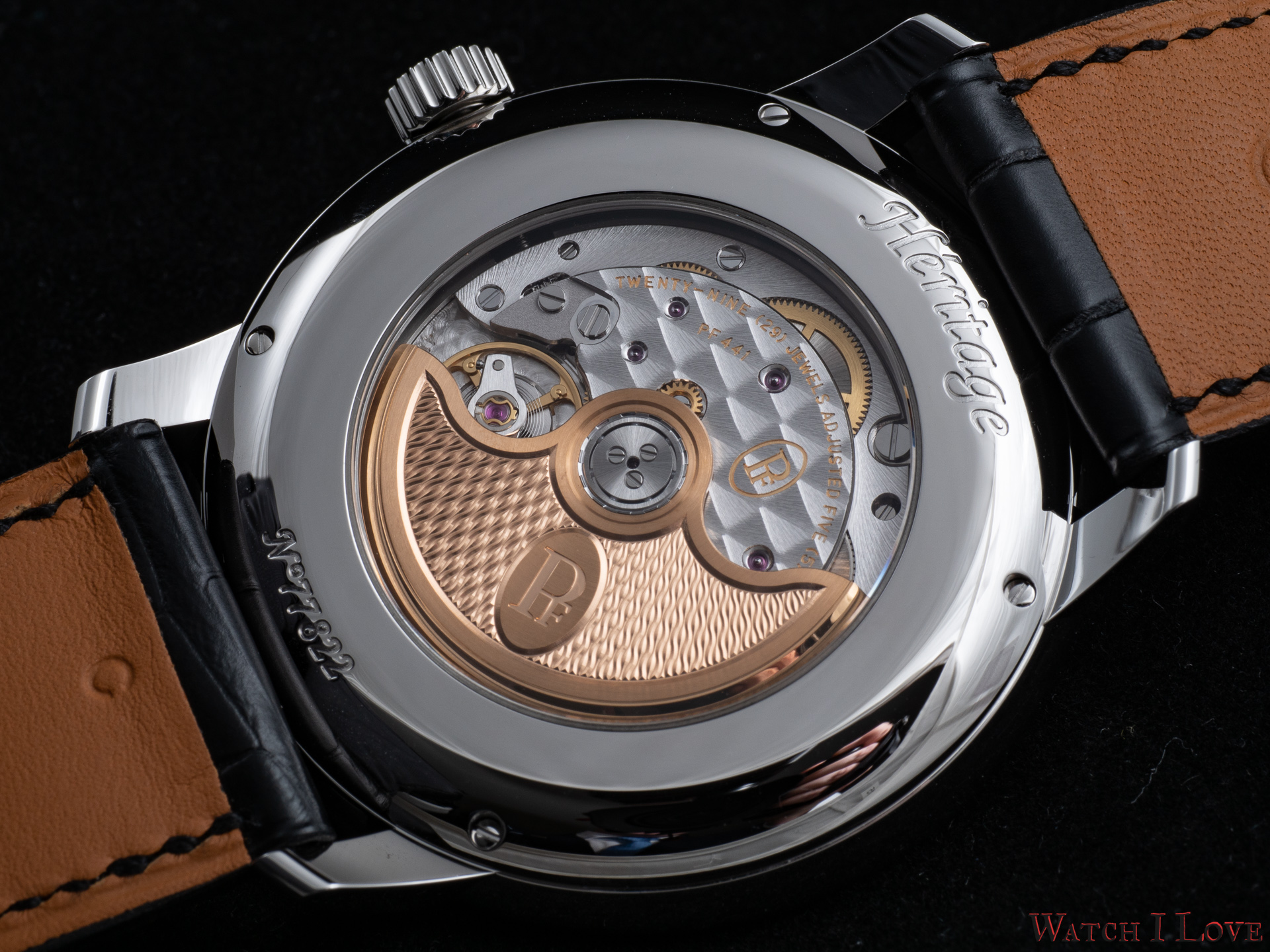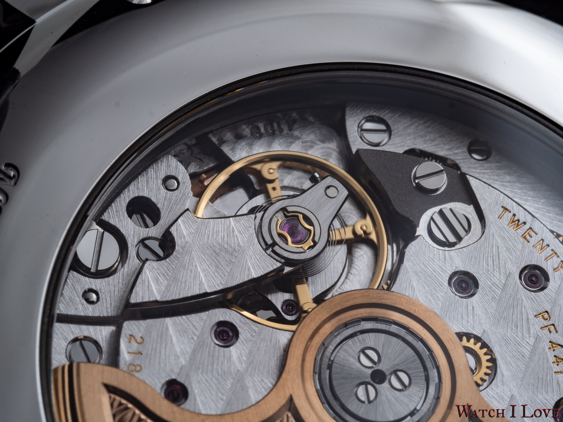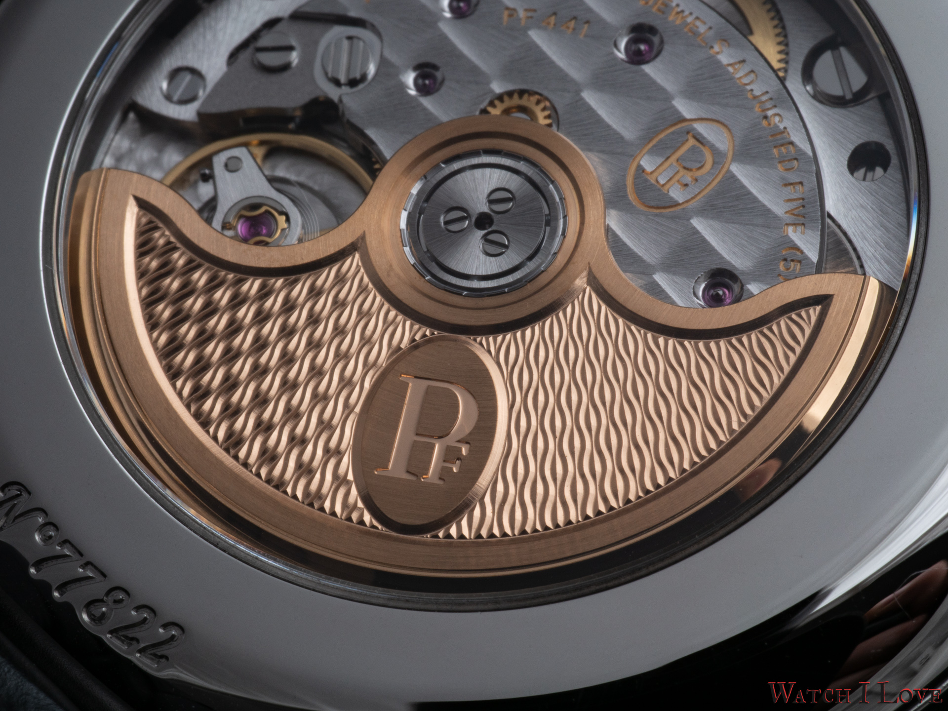 This movement uses a variable inertia balance wheel. The escapement is tacted at 4Hz. The calibre PF441 has long term stability, greater shock resistance, and much less sensitivity to the watch wearing position for optimal isochronism.