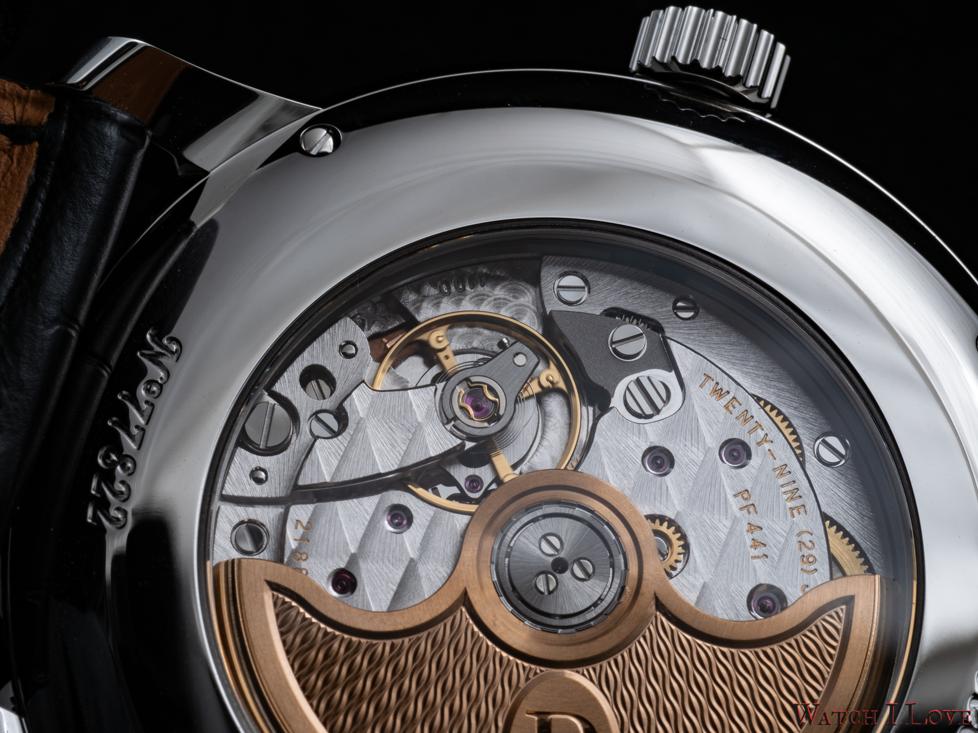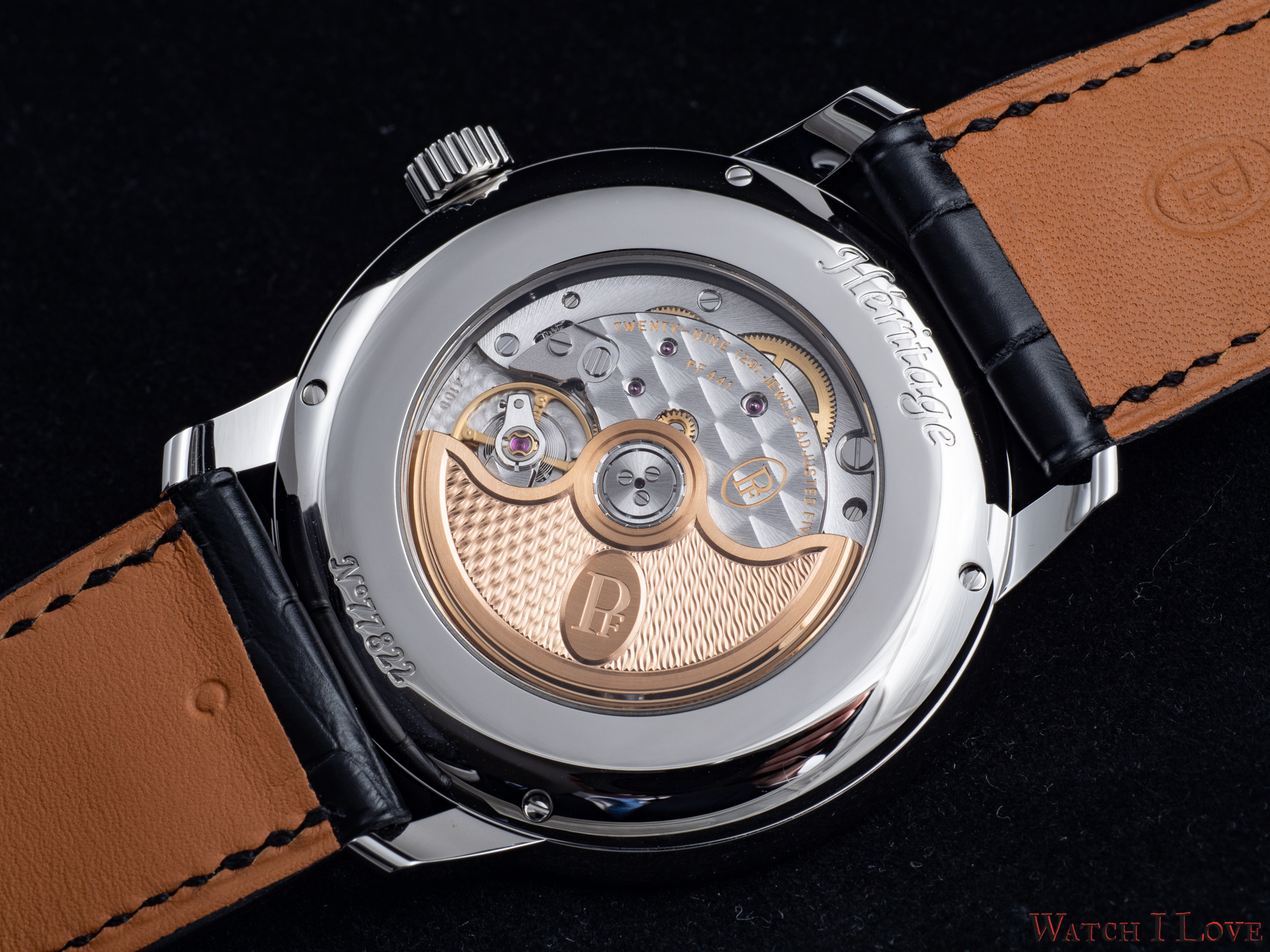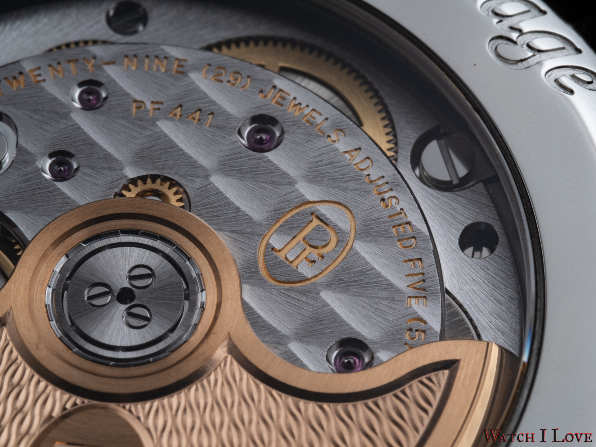 This movement uses a variable inertia balance wheel. The escapement is tacted at 4Hz. The calibre PF441 has long term stability, greater shock resistance, and much less sensitivity to the watch wearing position for optimal isochronism.