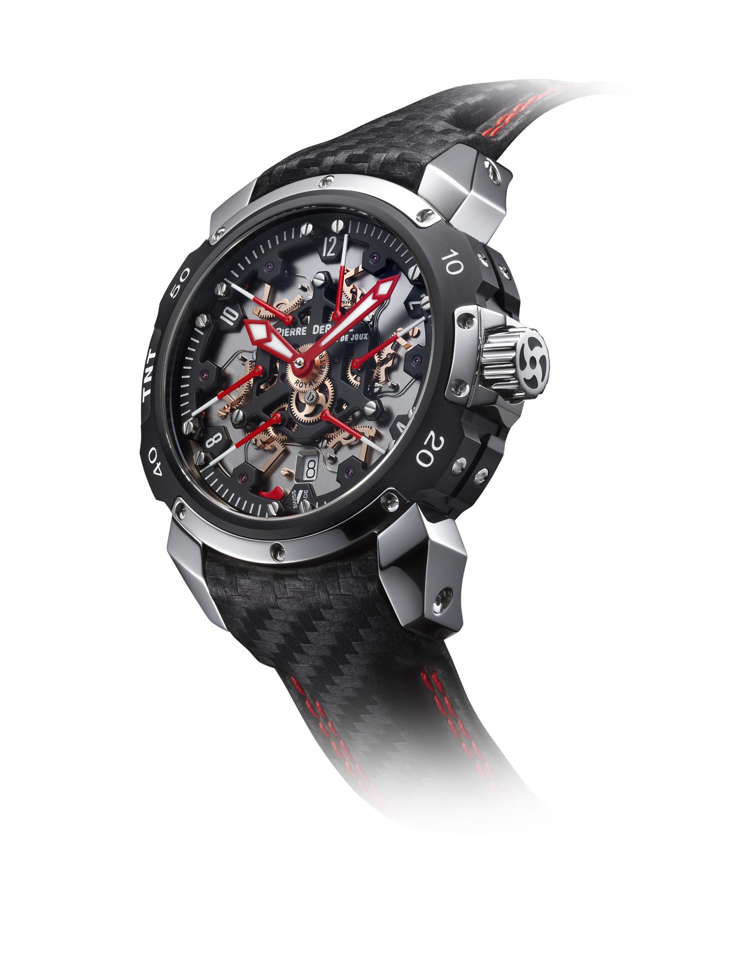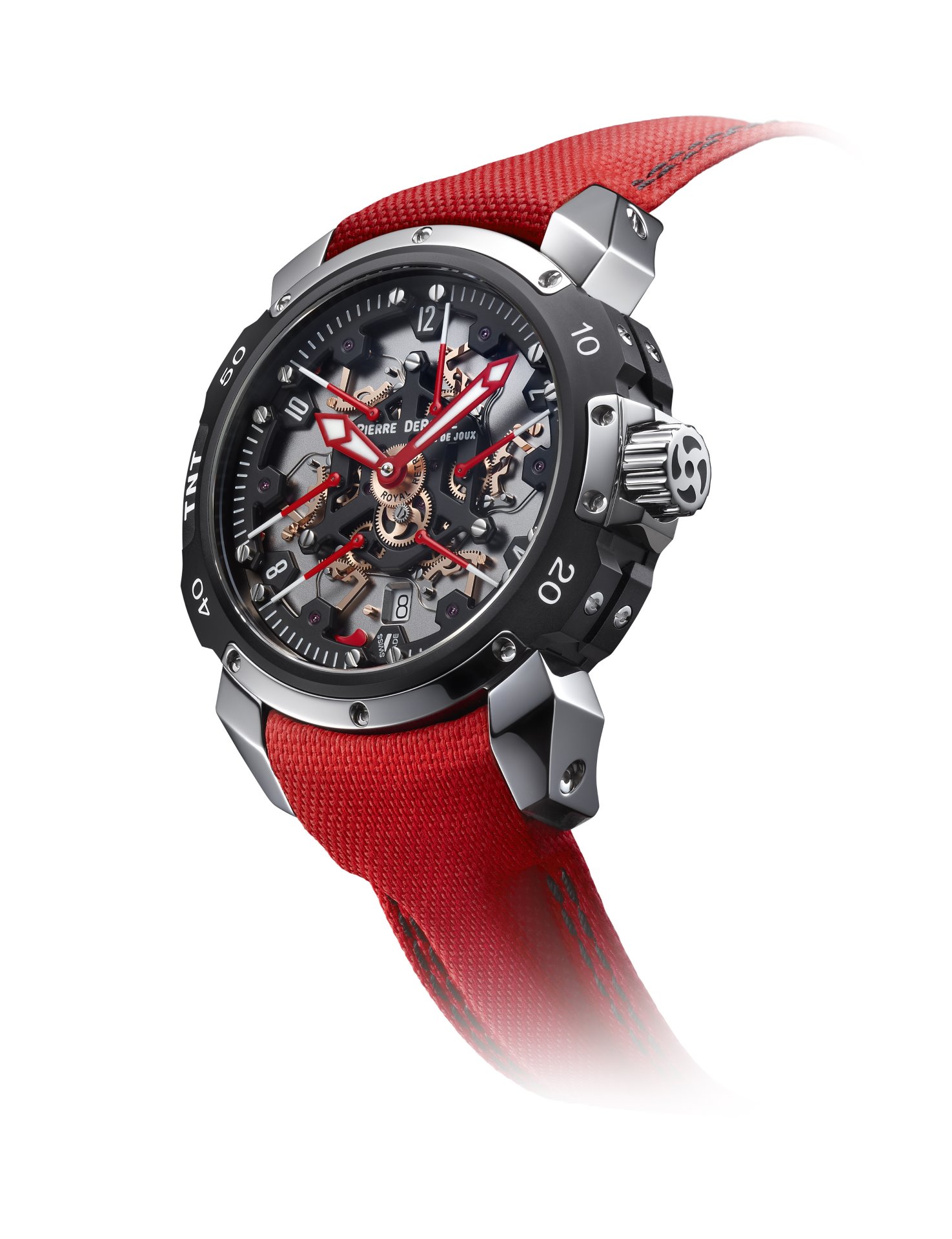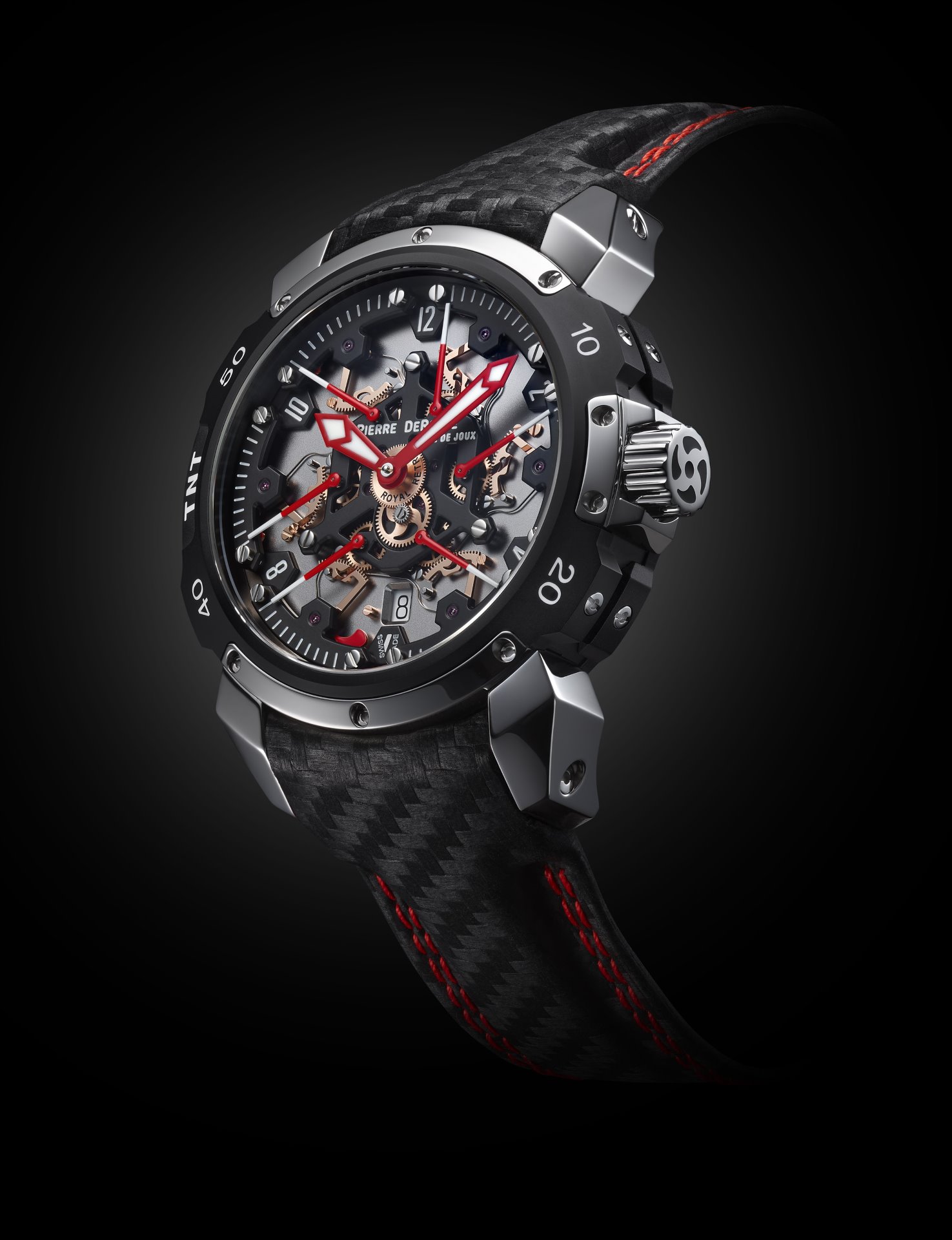 A marvel of originality, technicality and sportiness, the Pierre DeRoche TNT Royal Retro and the balletic dance of its six retrograde second hands have fascinated watch lovers for more than a decade. The latest incarnation of this unique complication, the TNT Royal Retro 43 Diablo, pushes the limits of watchmaking expertise even further and reveals a fiery temperament.