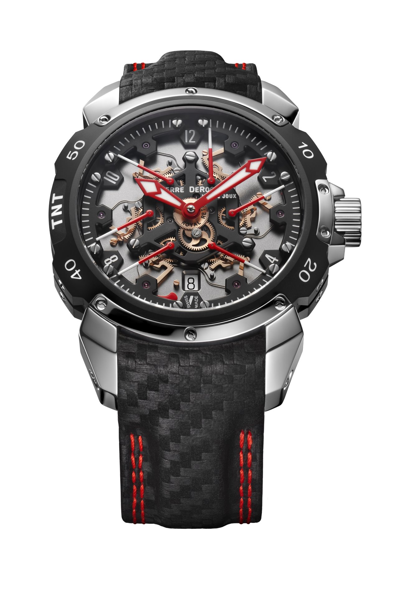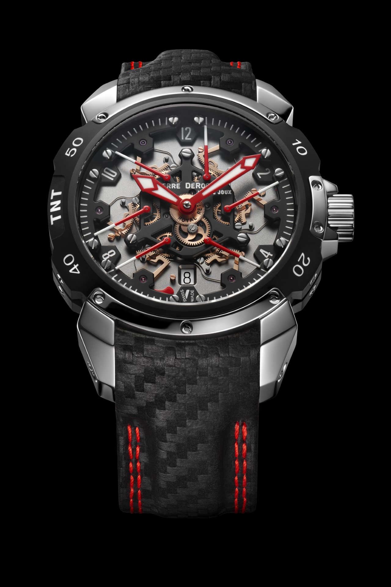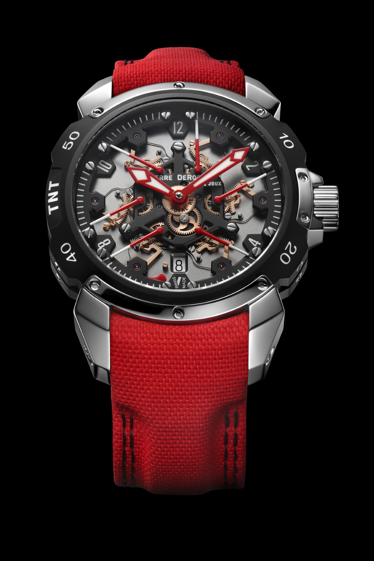 A marvel of originality, technicality and sportiness, the Pierre DeRoche TNT Royal Retro and the balletic dance of its six retrograde second hands have fascinated watch lovers for more than a decade. The latest incarnation of this unique complication, the TNT Royal Retro 43 Diablo, pushes the limits of watchmaking expertise even further and reveals a fiery temperament.