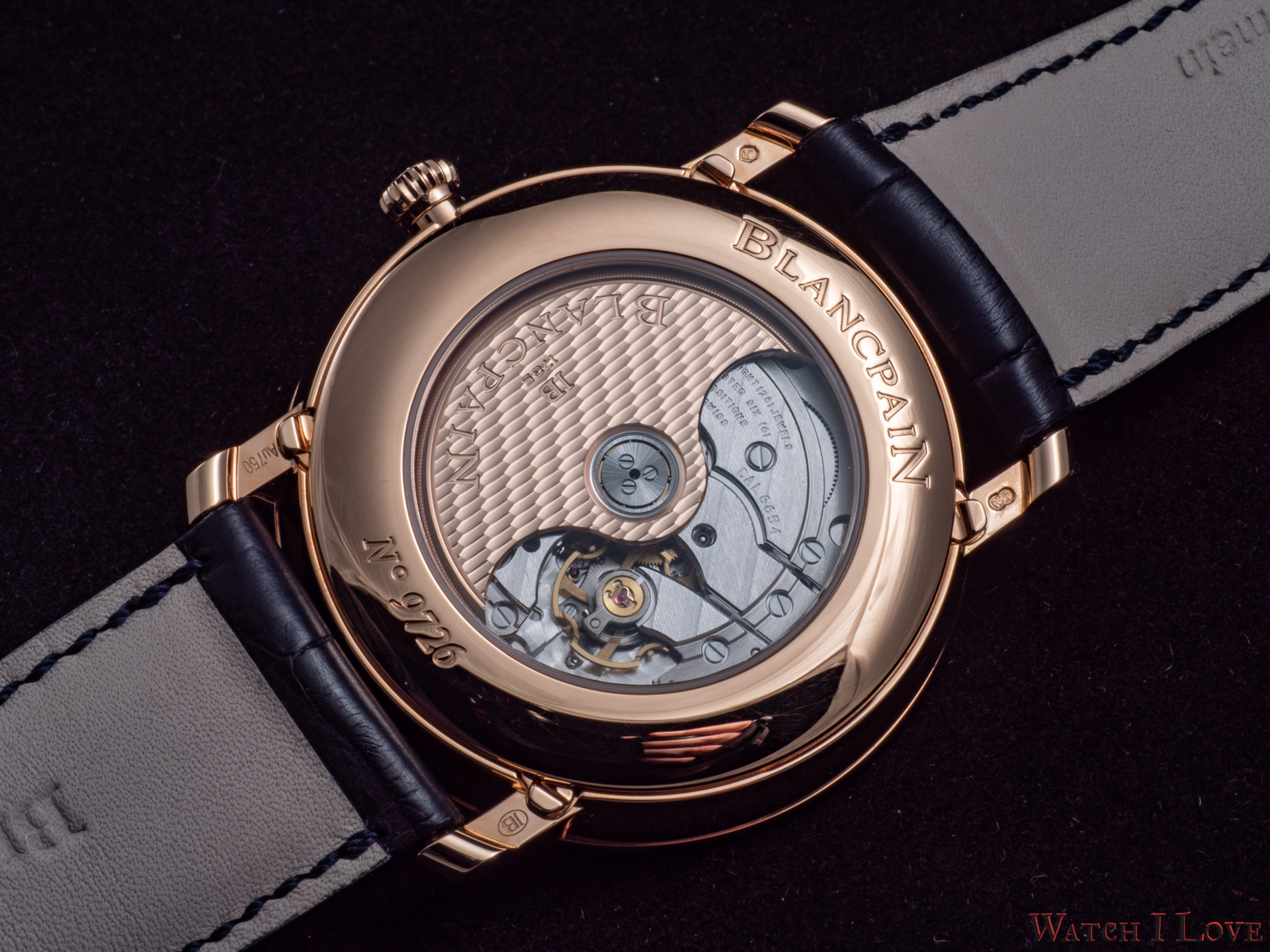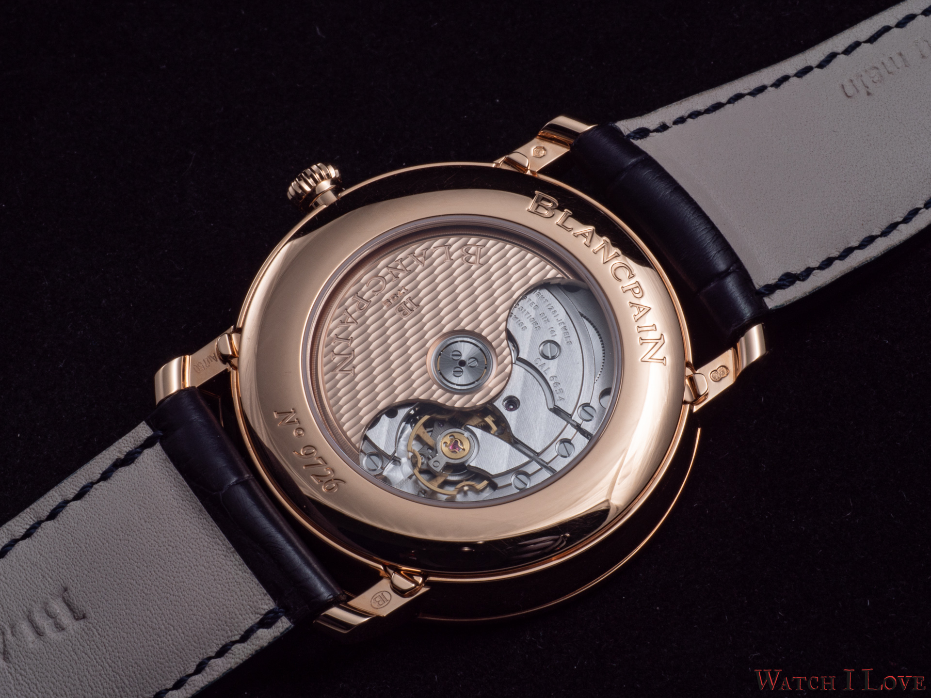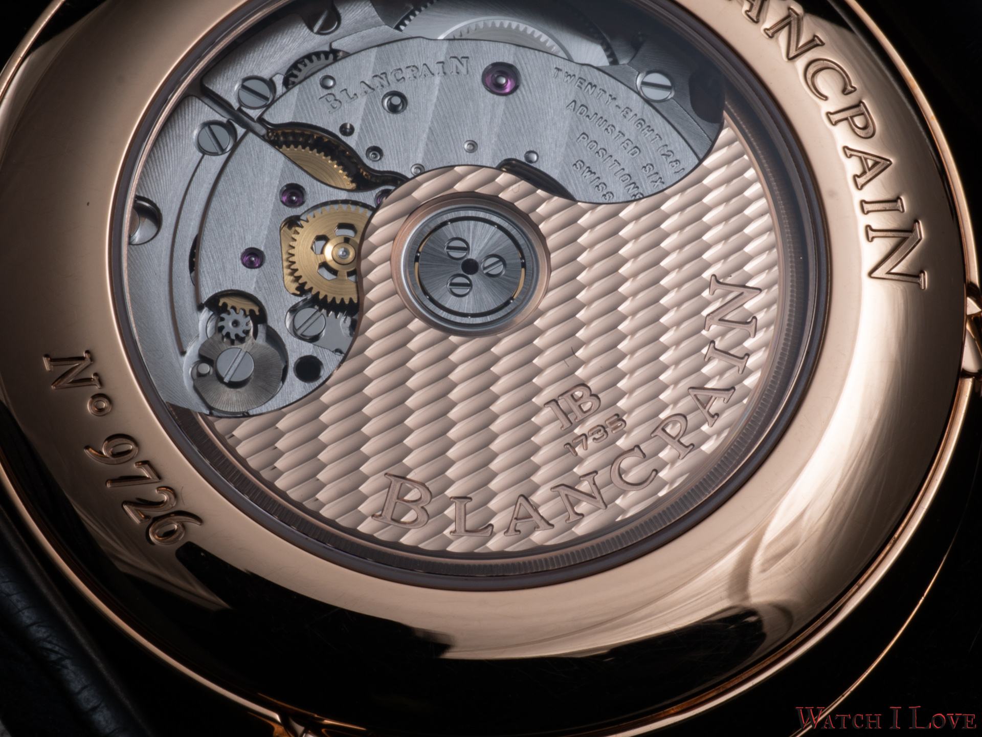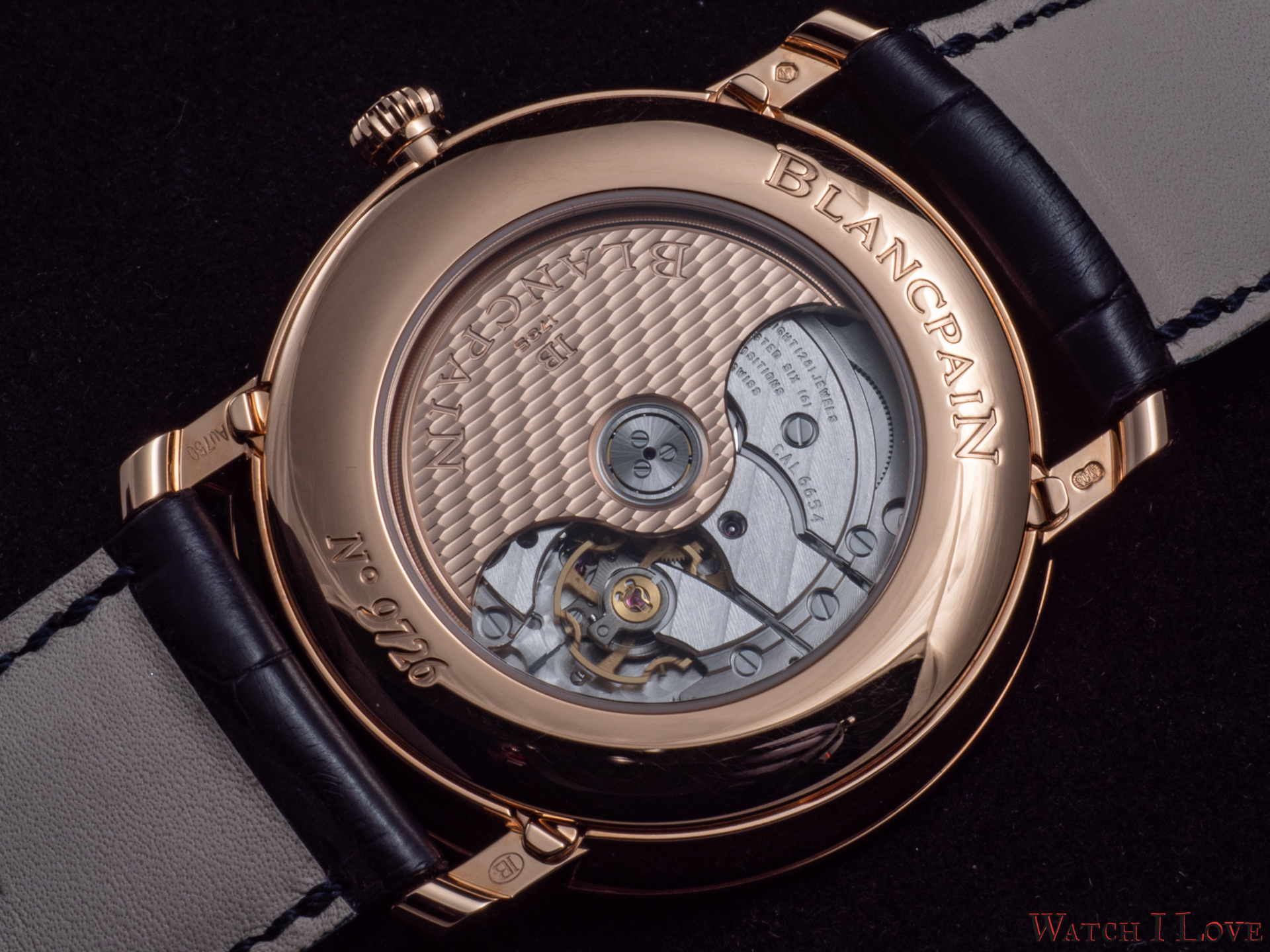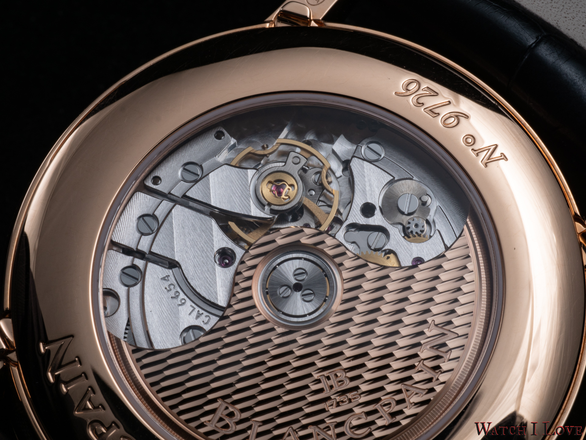 Blancpain Villeret Quantième Complet is put into motion by the Calibre 6654. At only 5.5mm thickness and a diameter of 32 mm, the movement packs a complete calendar with moon phase and an impressive 72 hours of power reserve.