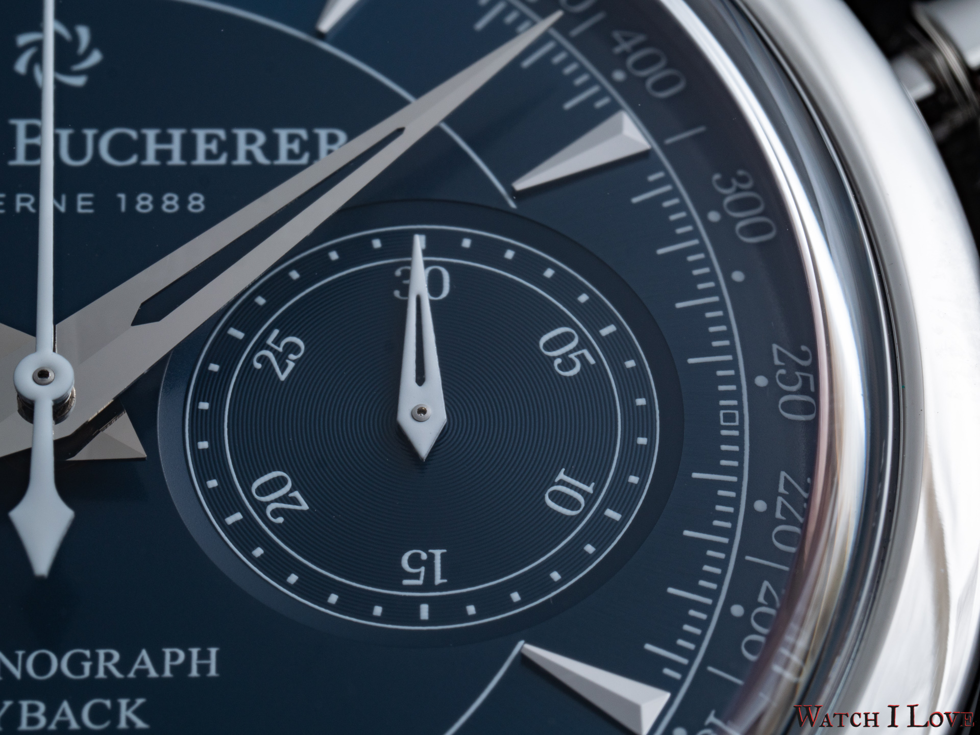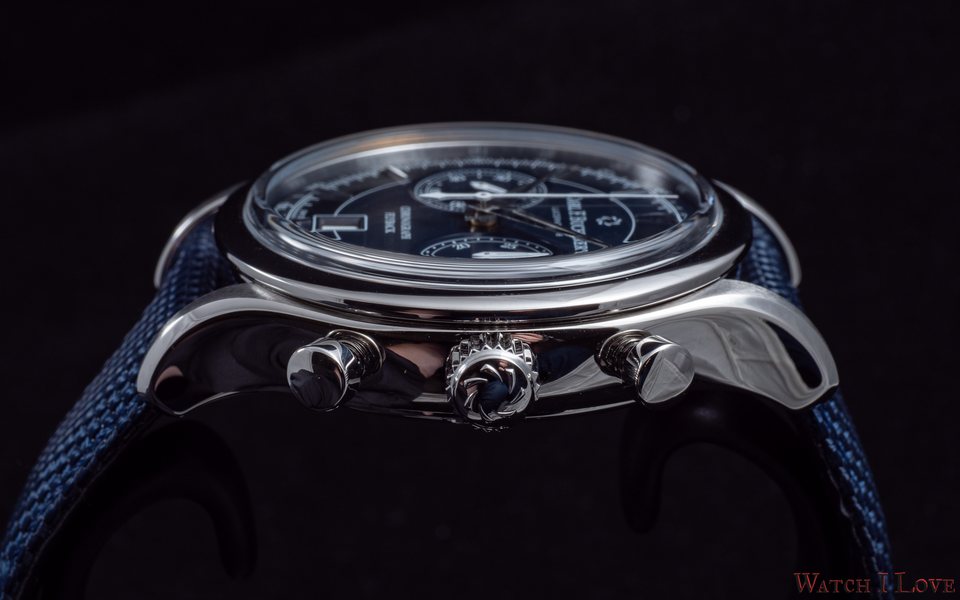 The Manero Flyback pieces presented today are part of a twelve, on-growing, series line launched in 2016. The variations consist of case and dial materials, dial colours and fitted strap/bracelet. This year’s piece comes with a nice dark blue dial, having as a choice the blue textile strap or the nine link Bucherer bracelet.