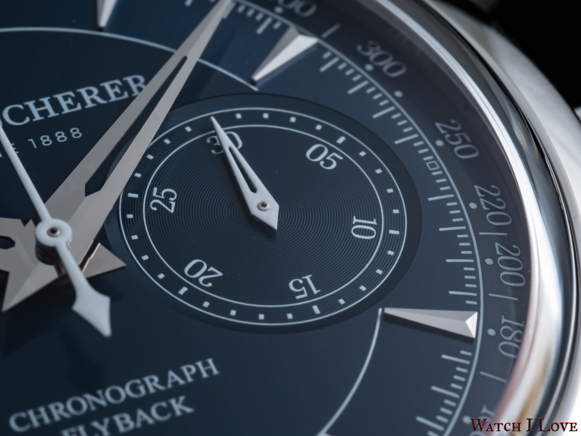 On the left side can be found the running seconds indication. The sub-dial features a circular pattern in a recessed area. The dauphine hand is hoovering over two registers: one with baton indices only and one featuring Arabic numerals for the tens of seconds.