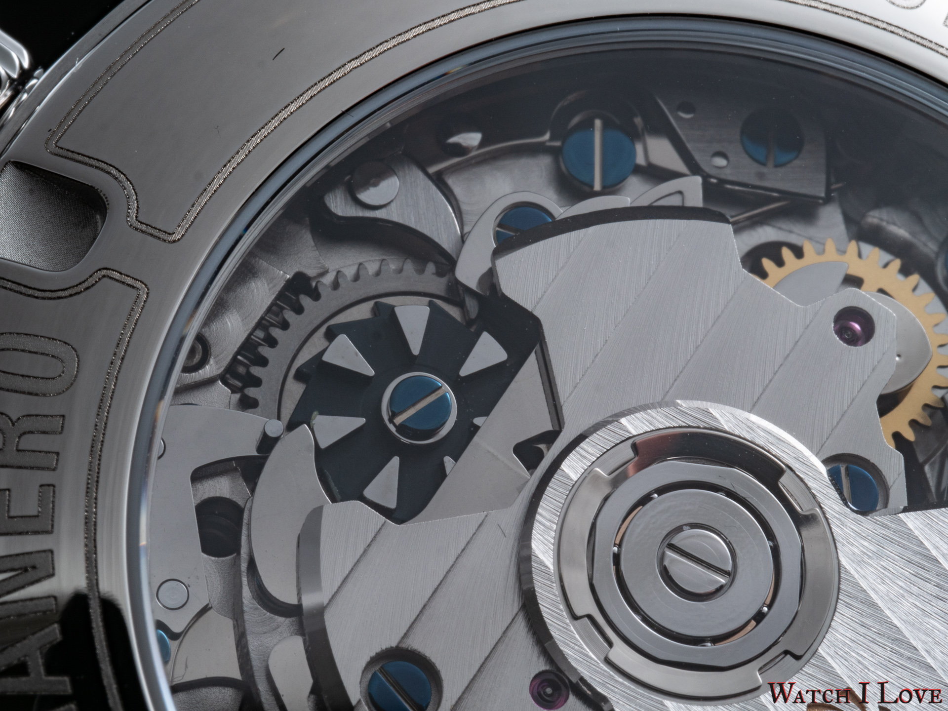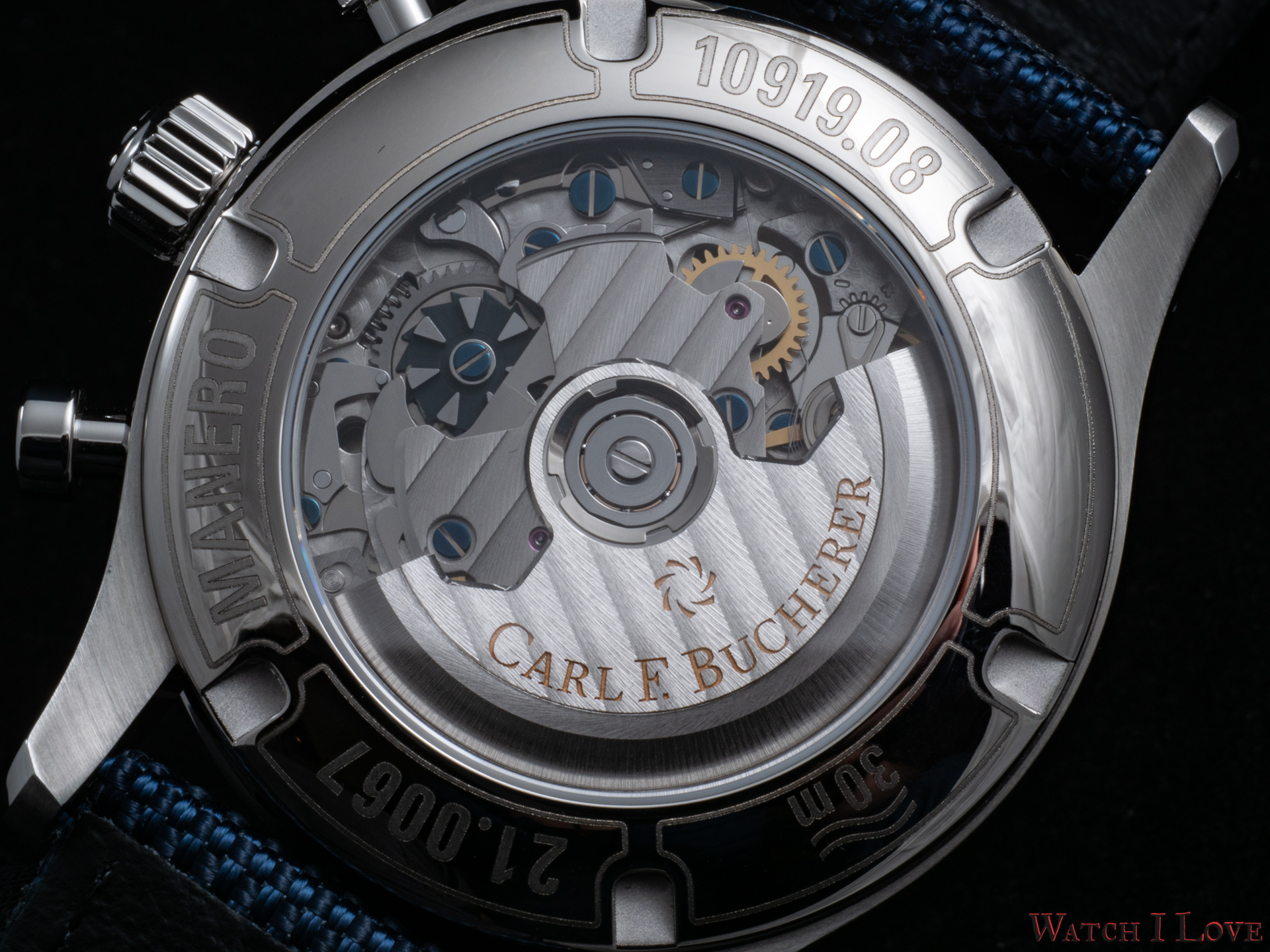 Manero Flyback features the calibre CFB1970 based on a heavily modified 7750. The movement features a flyback chrono with column-wheel configuration and offers 42 hours of power reserve.