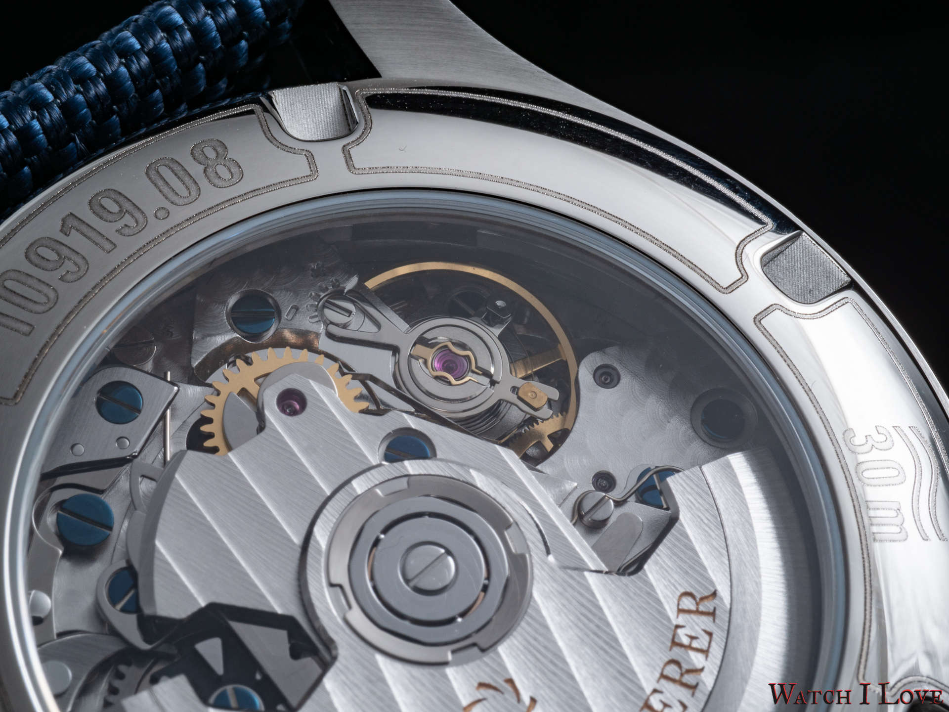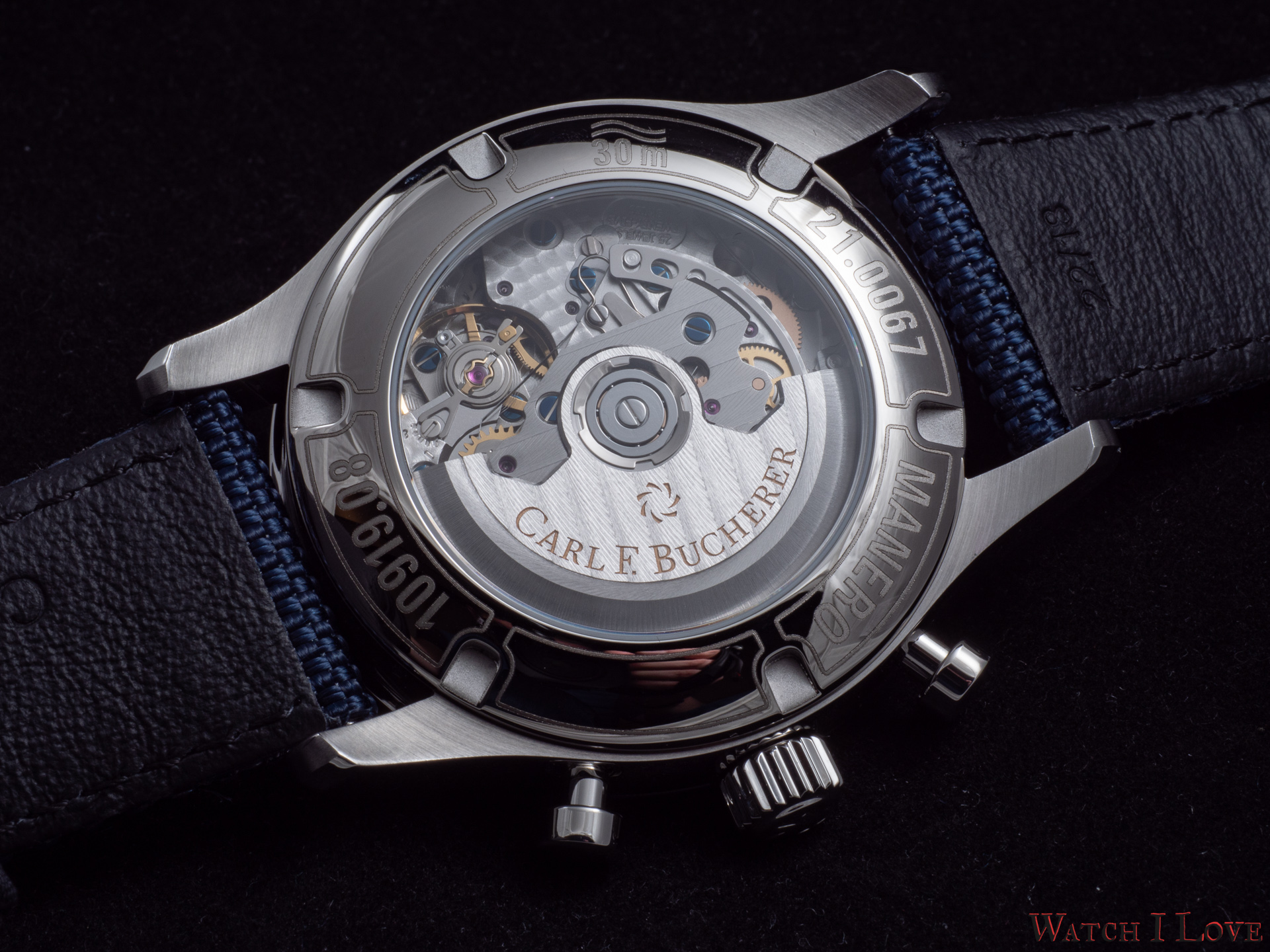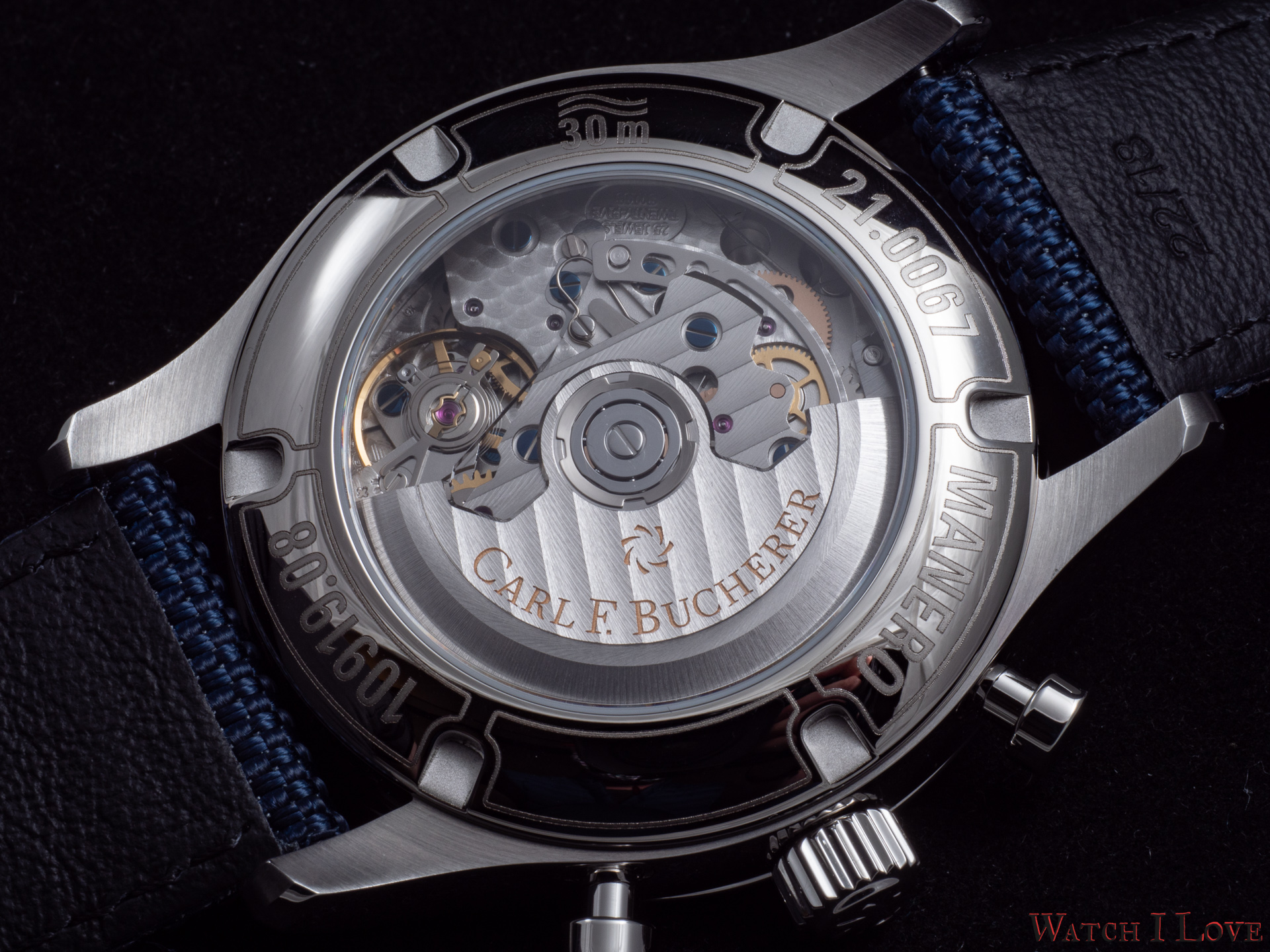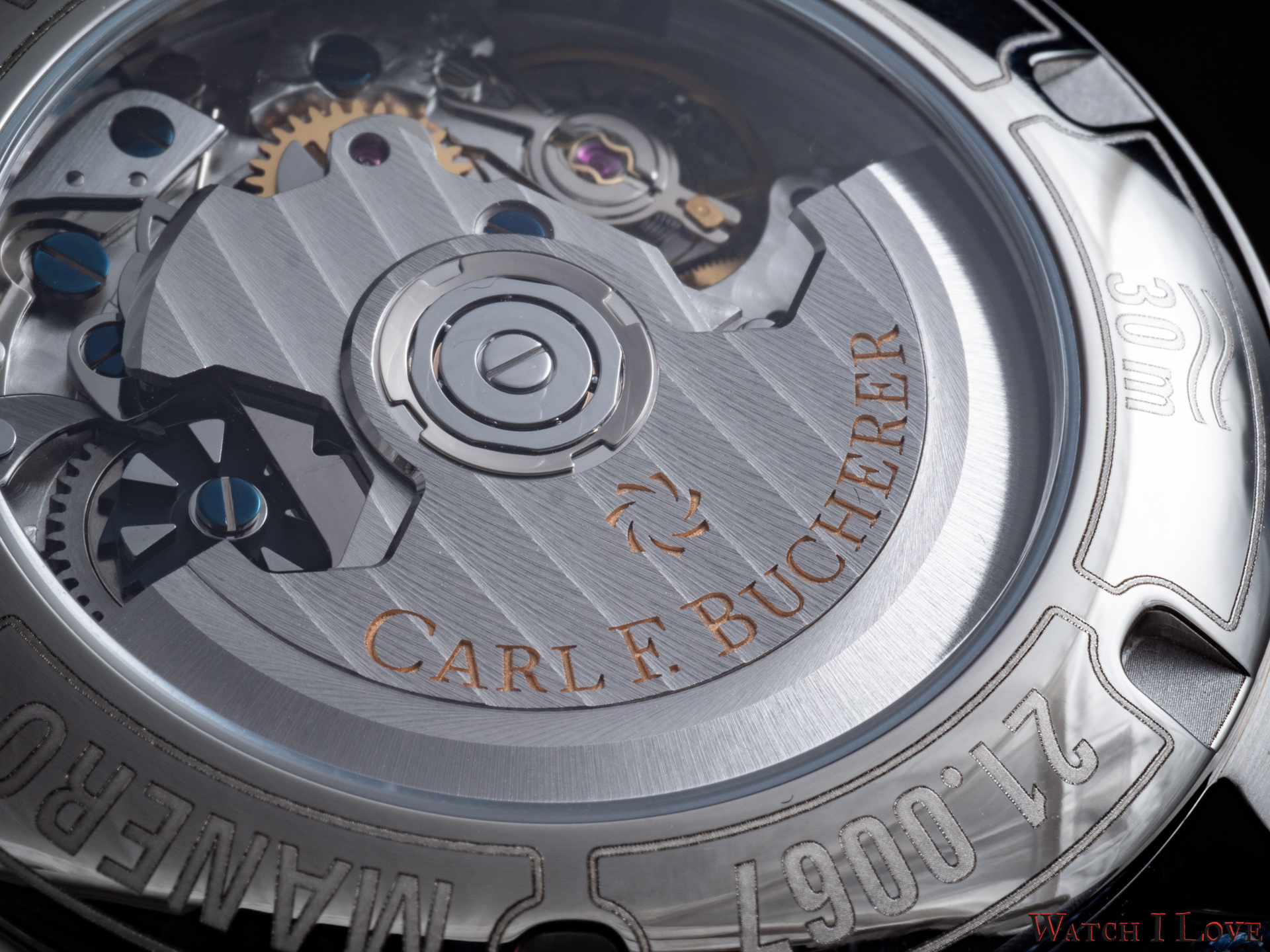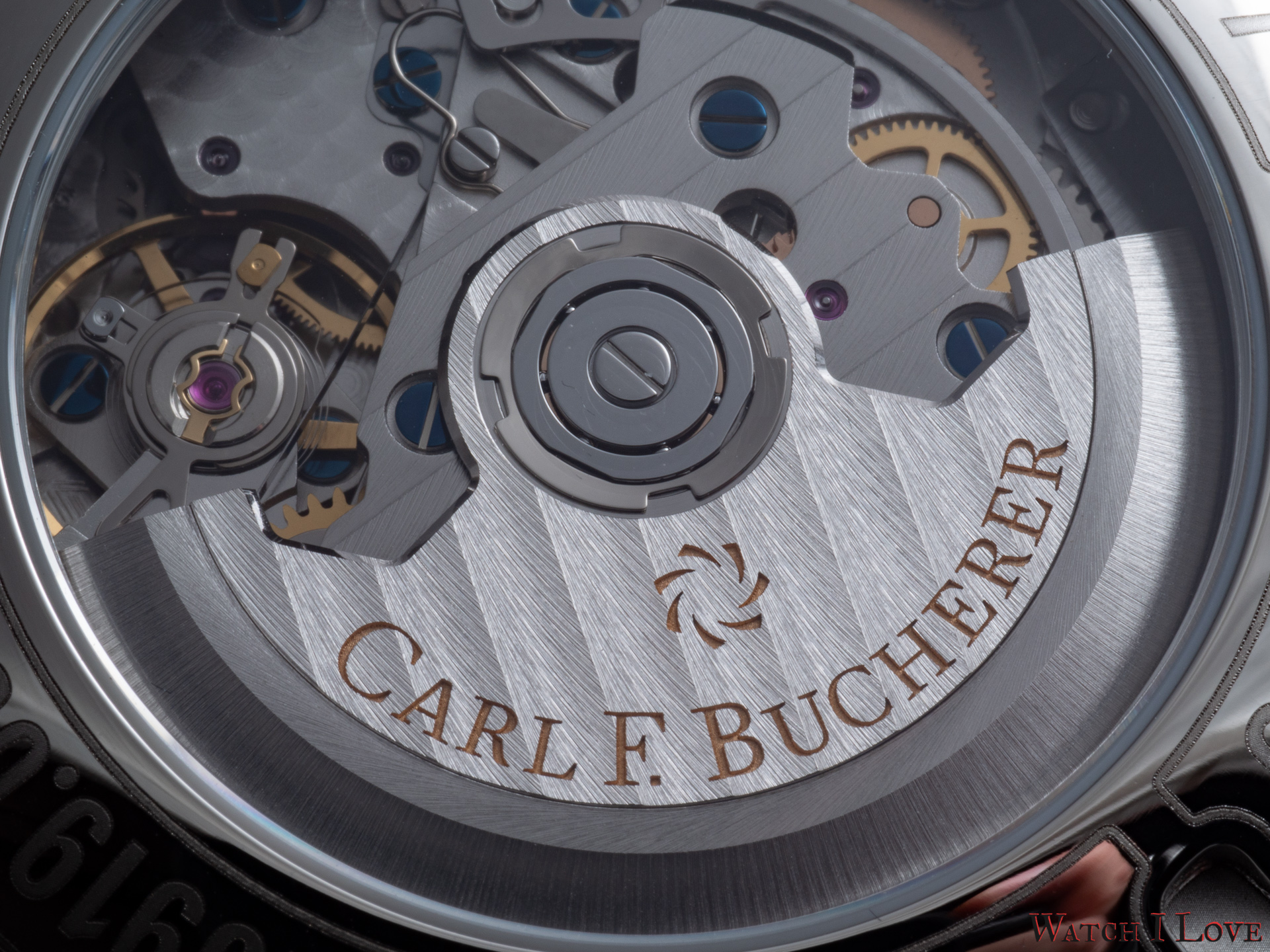 The finishes are quite compelling. Decorations are something on which Carl F. Bucherer excels. The visible movement is rich in details that can be individually observed. Note the blue accents of the column wheel.