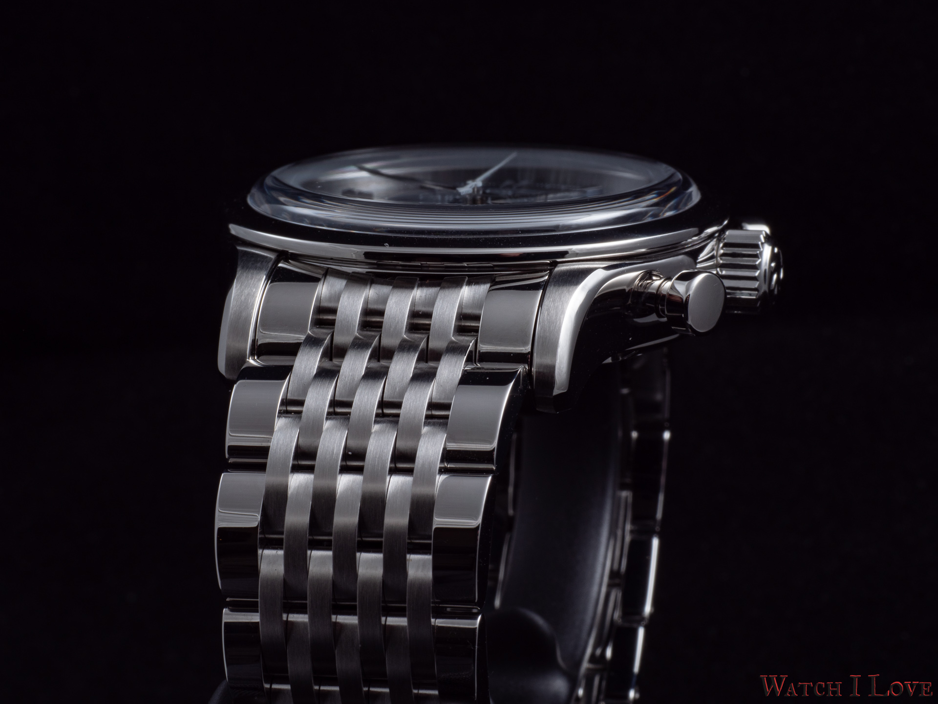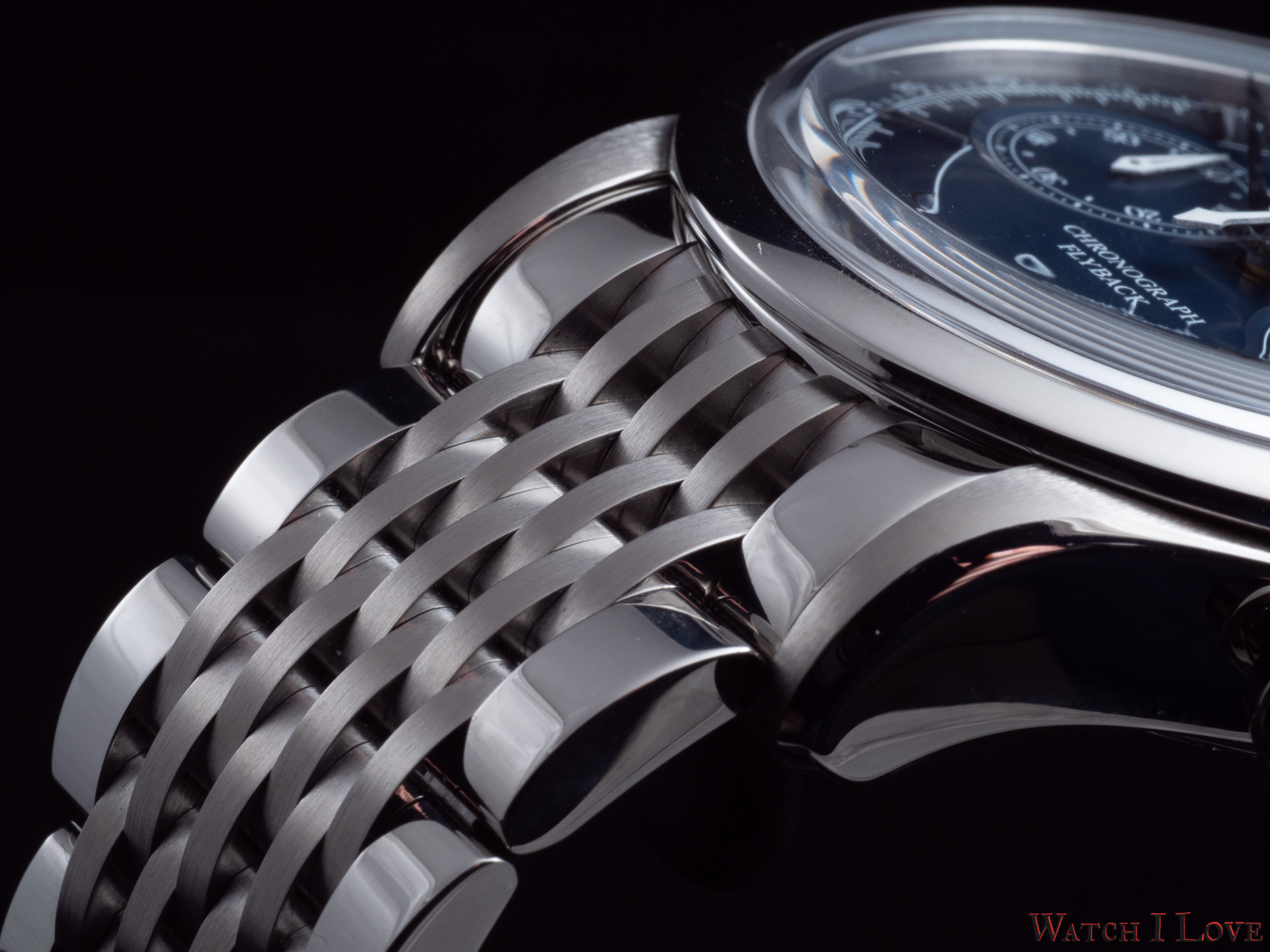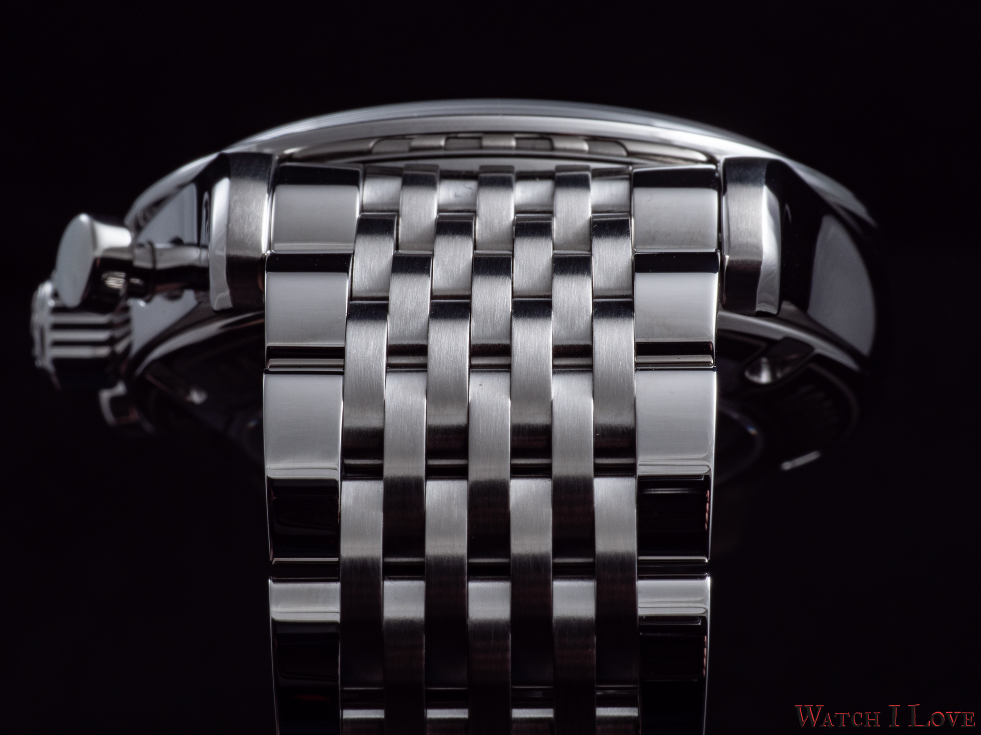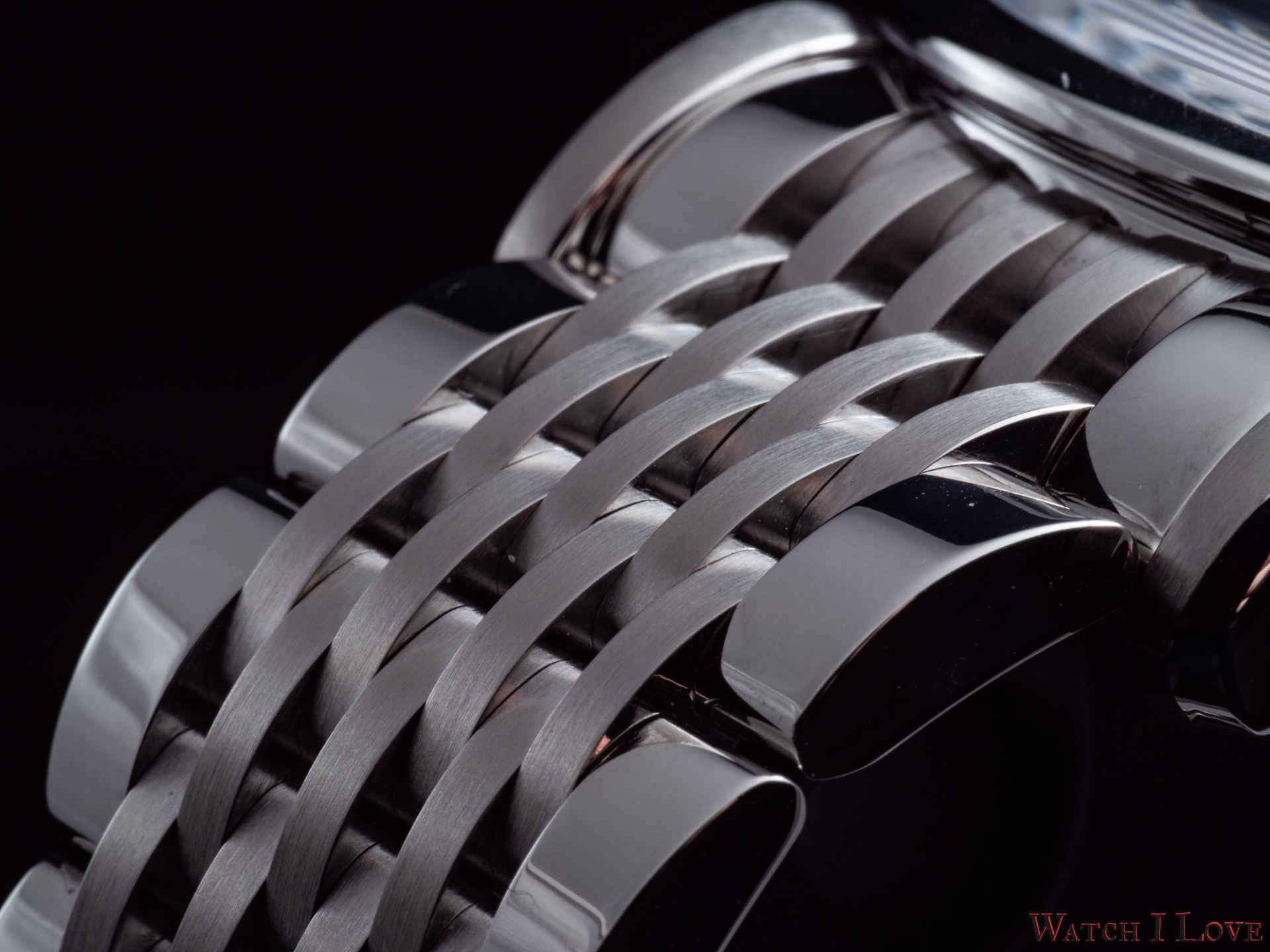 The nine links bracelet is excellently executed: polished external links and brushed internal links. The watch is well balanced on the wrist and offers comfortable wear.