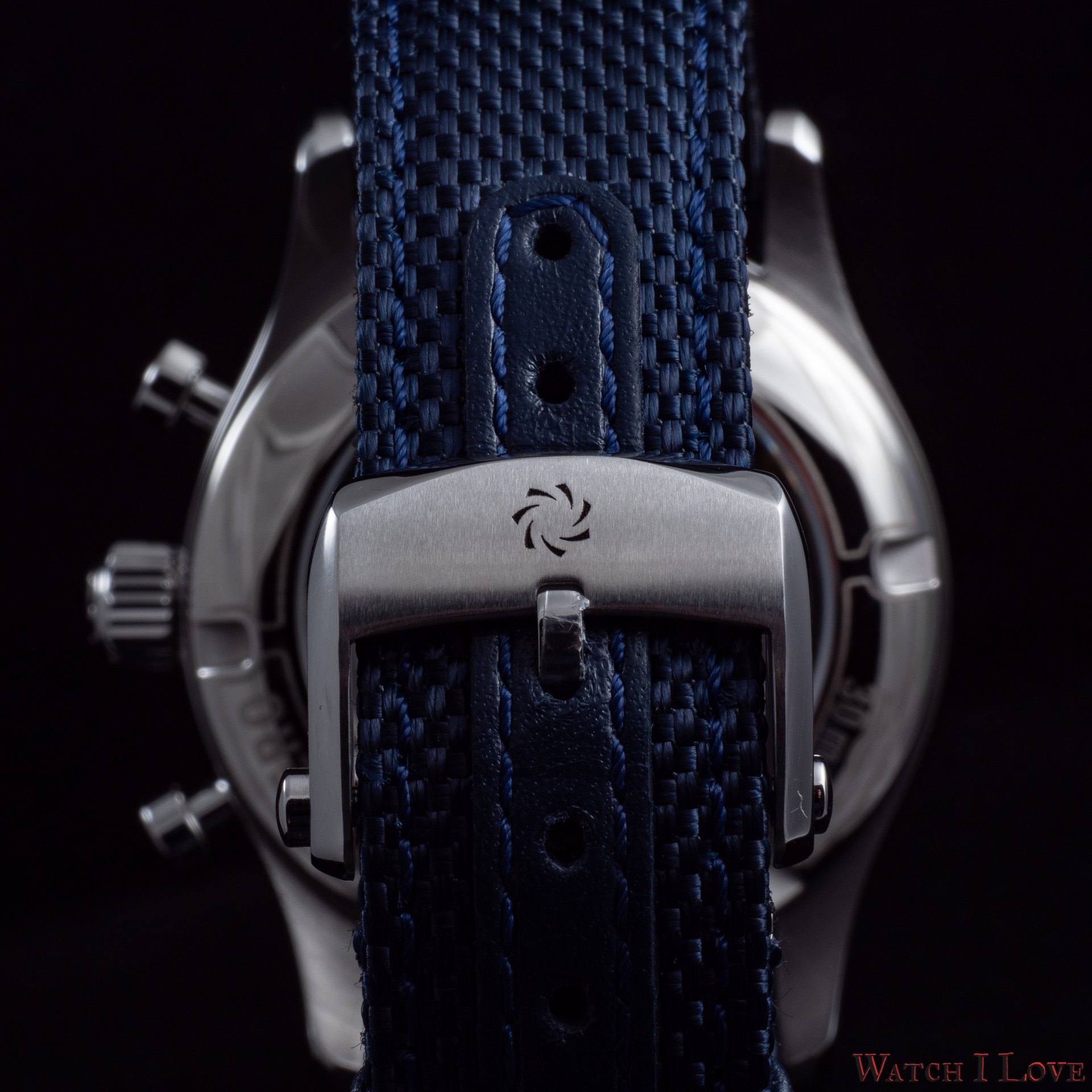 The very conservative look of the case is brought into the contemporary by a textile and leather strap in blue. I was immediately enchanted by this strap. Together with the blue dial, the entire watch is a “made in heaven” combination for the ones with a weakness for that colour.