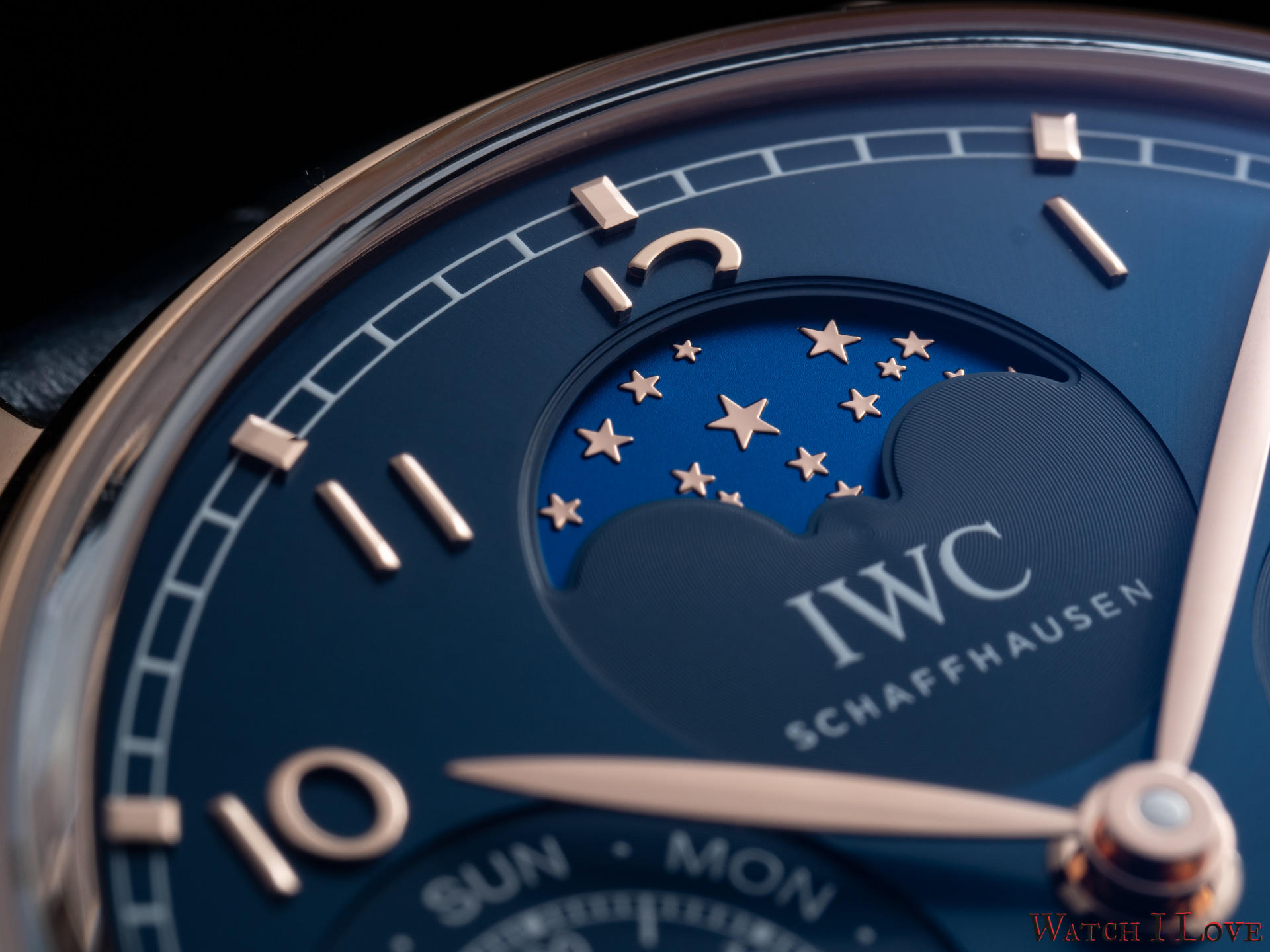 IWC Portugieser Perpetual Calendar Boutique Edition Ref. IW503312 comes with a gorgeous sunburst blue dial with gold accents. We find the familiar Portuguese details like the hands and applied numerals. The perpetual calendar is spread on the dial in an IWC specific: moon phase on top, date and power reserve on the right, months on the bottom, the years between 7 and 8 and small seconds and date of the week on the left. More about the calendar in the movement section of the article.