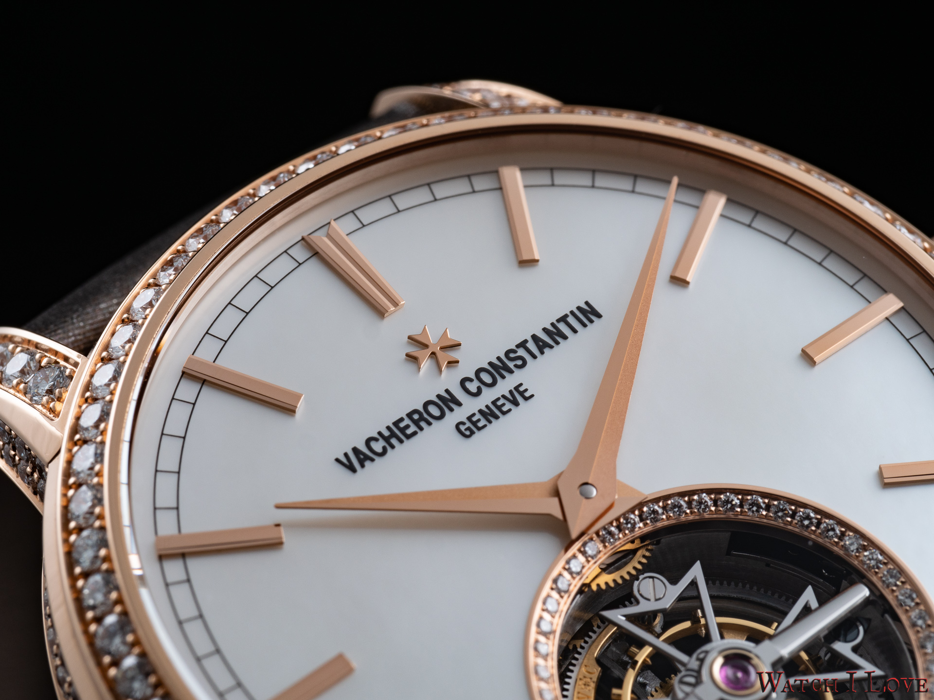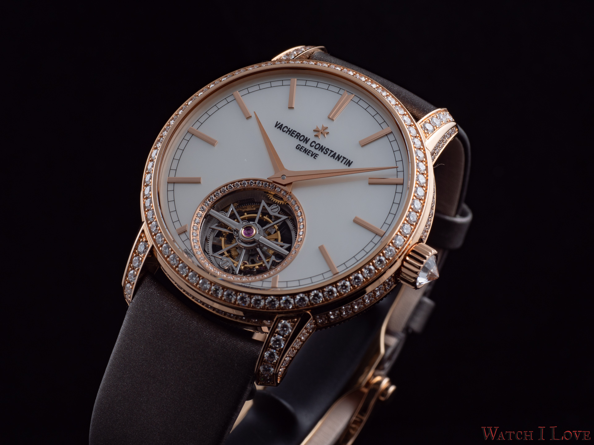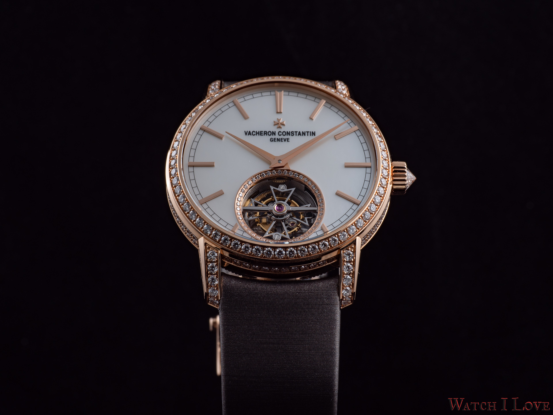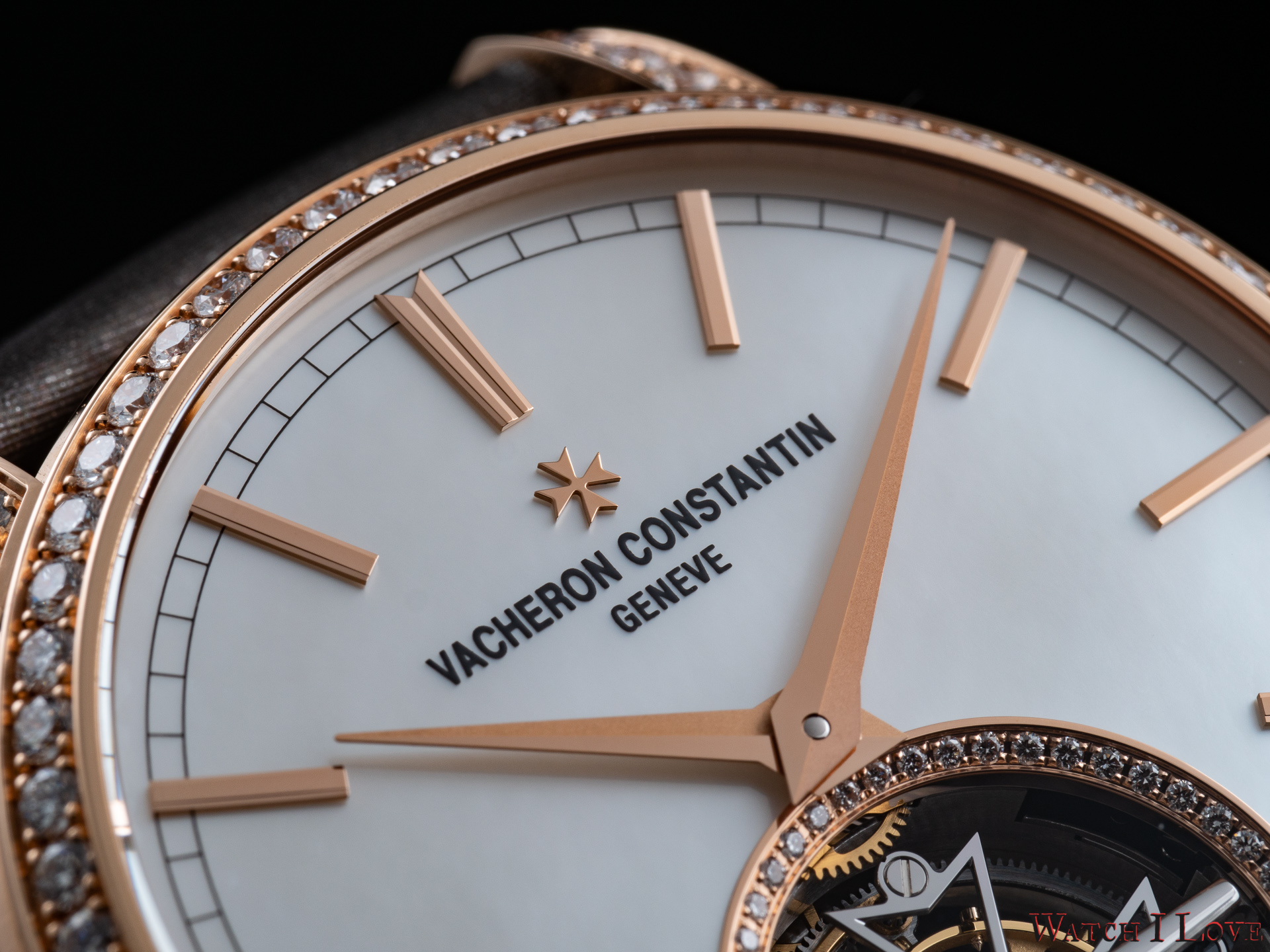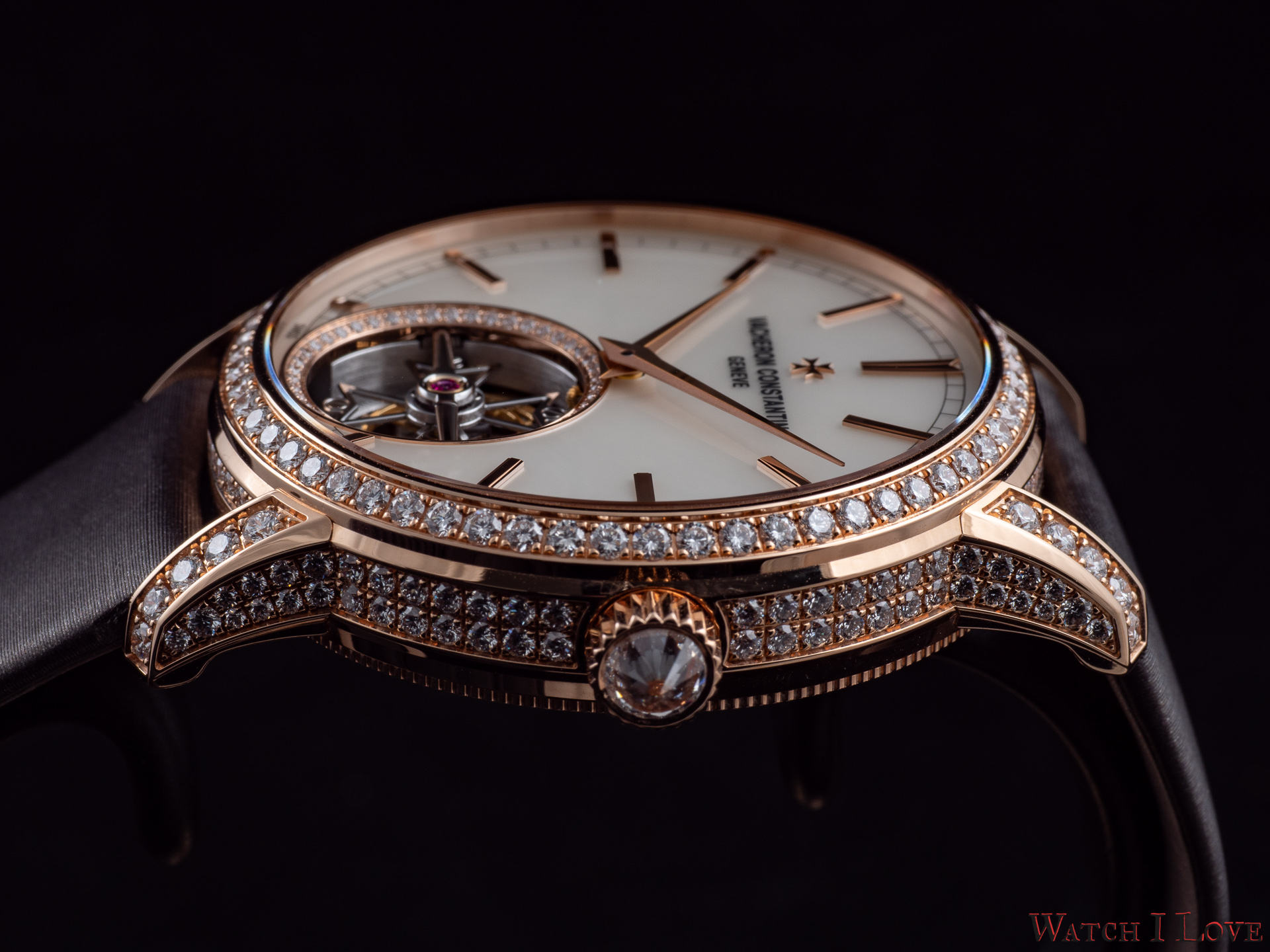 Vacheron Constantin Traditionnelle Tourbillon comes in a beautiful 39mm 18K 5N pink gold case. The case band, the lugs and the bezel were superbly set with 208 round-cut diamonds.