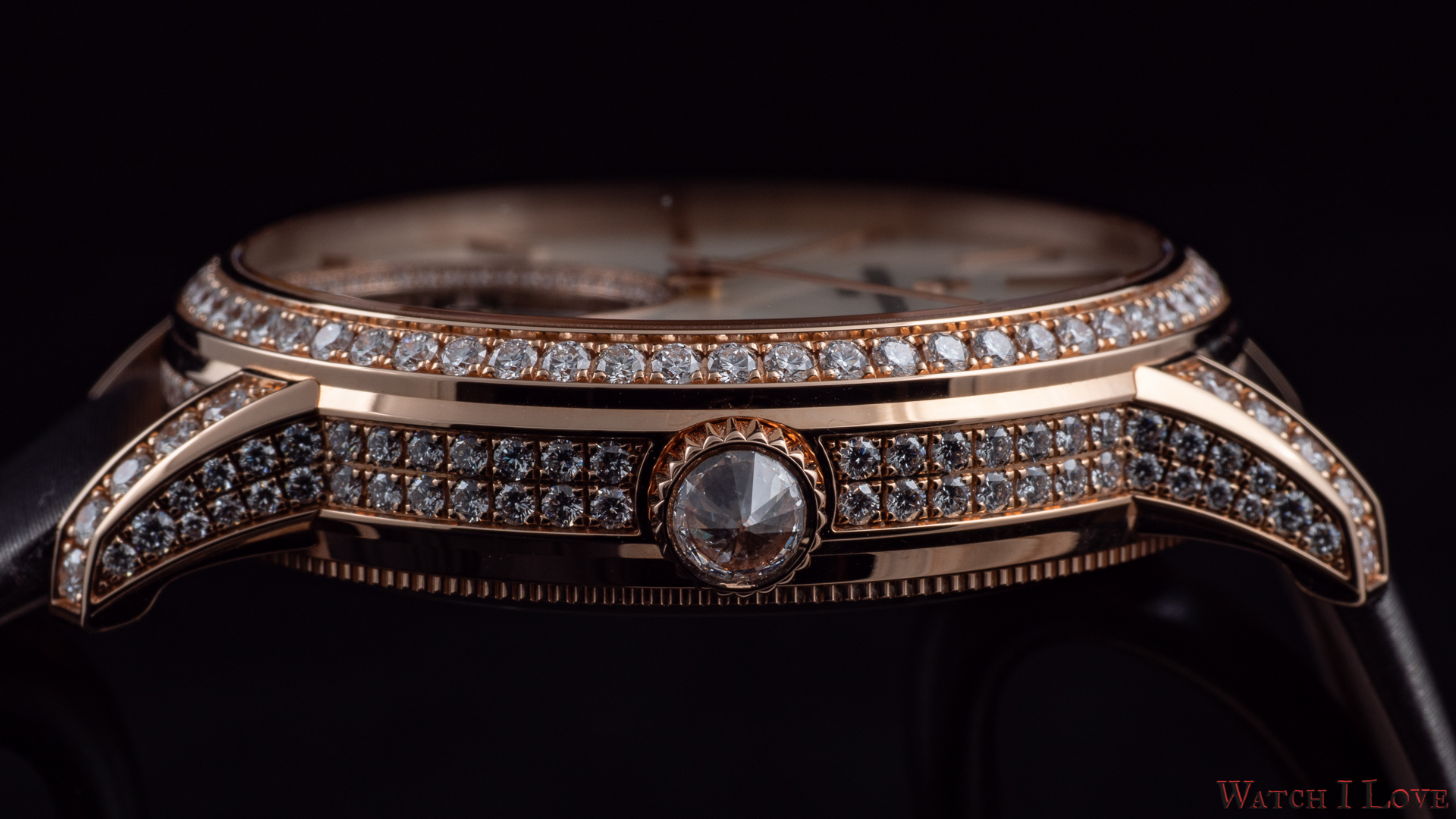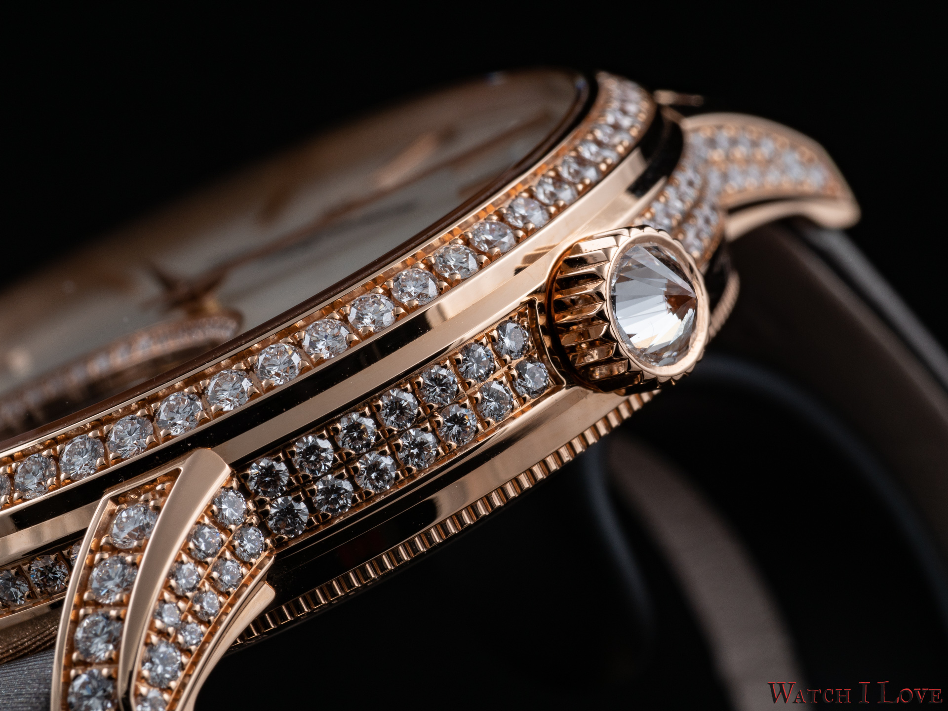 The most spectacular exterior detail is given by the crown and its brilliant-cut diamond. It is not unusual to see various cabochons or diamonds set in the crown, but this stone pointing to the wrist increase exponentially the appeal of the watch.