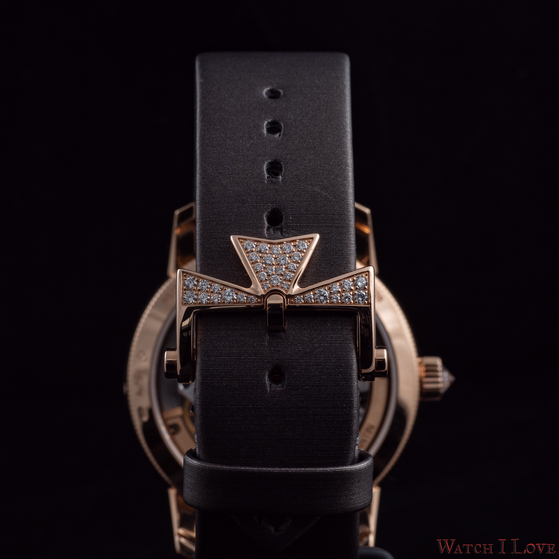 The time is shown by gold hands with matt and polished faceted hands. The entire look transpires finesse, attention to details and unquestionable femininity. More details can be observed on the pictures in the gallery at the end of the article.