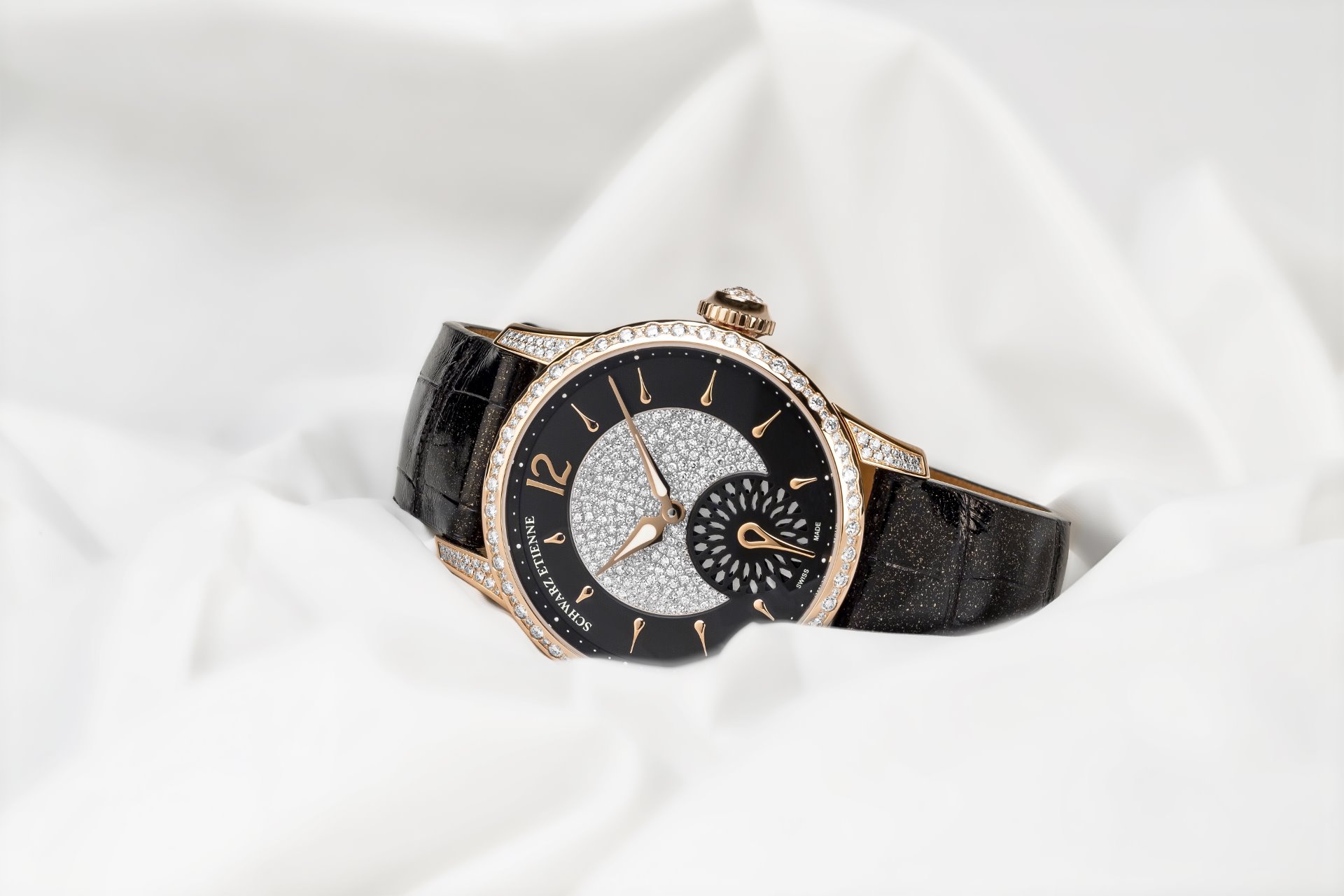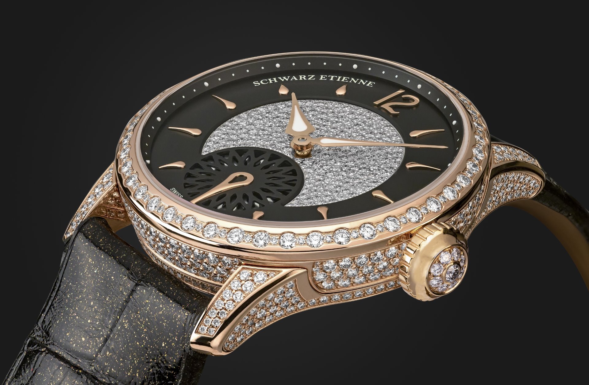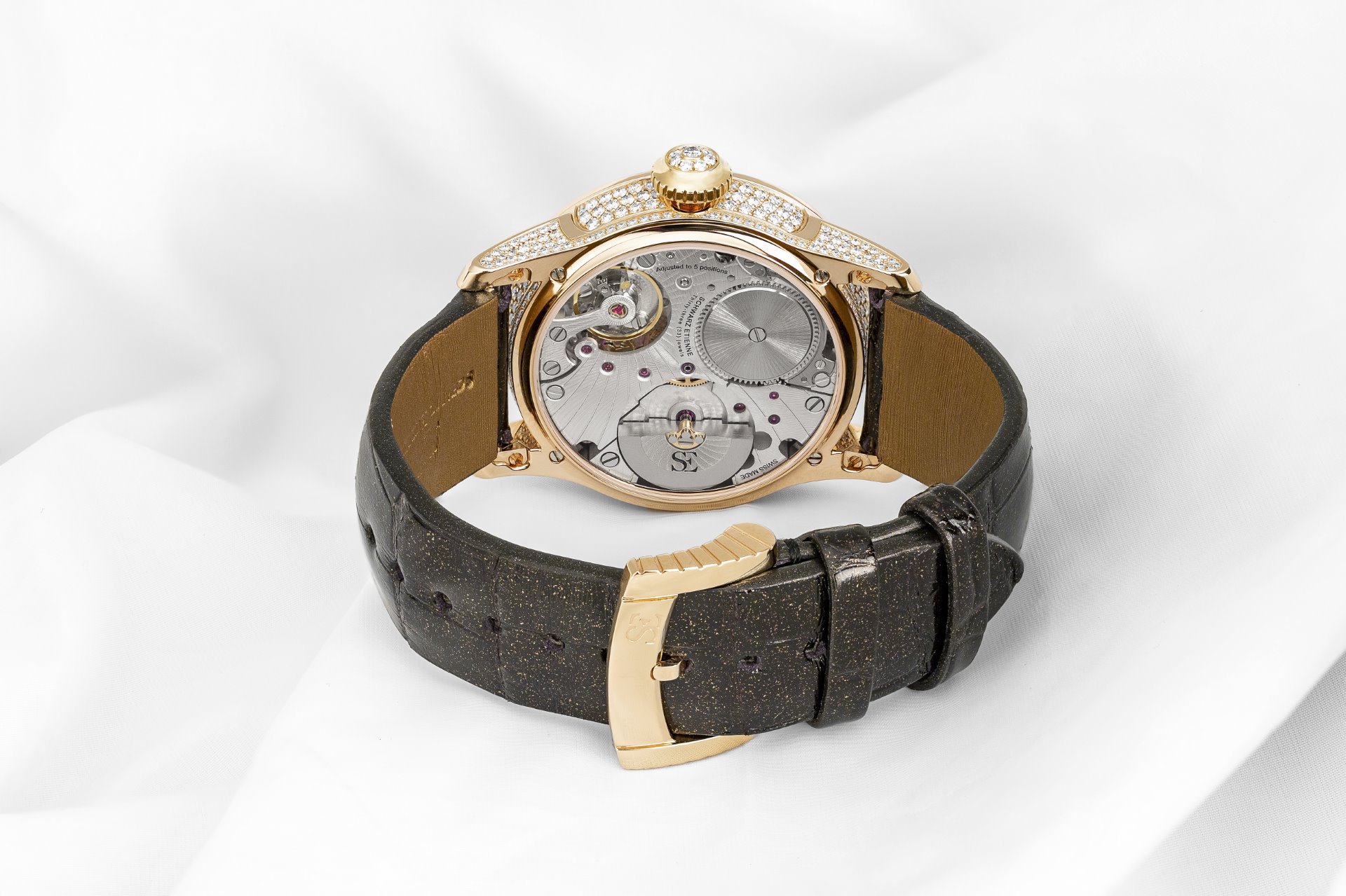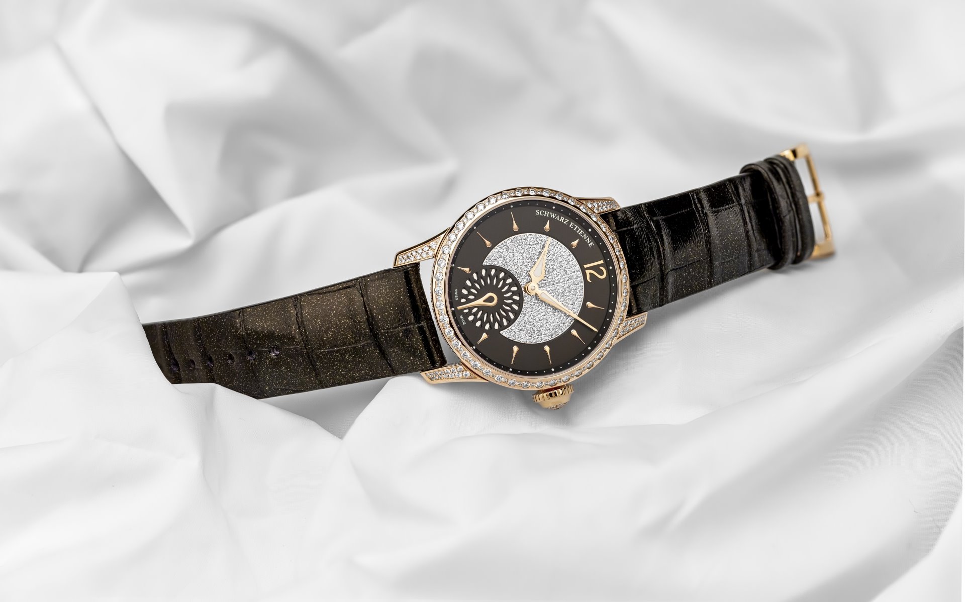 The Schwarz Etienne FIJI Floral Seconds Joaillerie is supplied with two straps, one in gold glittering black alligator and the other in metallized chocolate coloured leather. Each strap is sumptuously lined in a contrasting shade of bronze. The model is thoughtfully presented in a luxurious Noleti® handbag, executed in burgundy-coloured python.