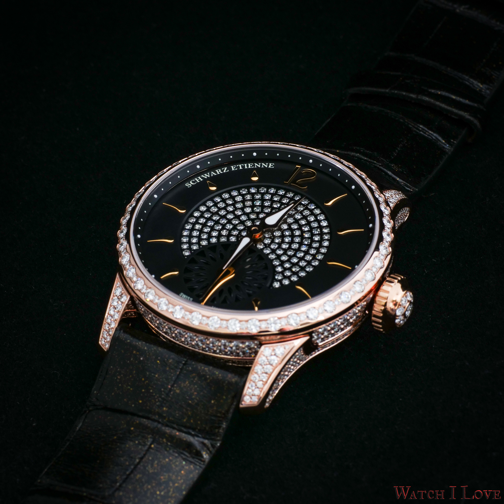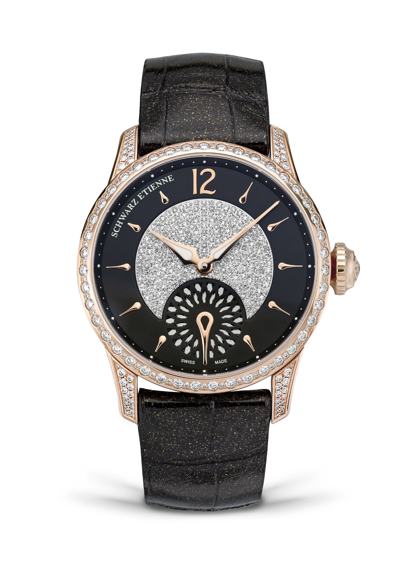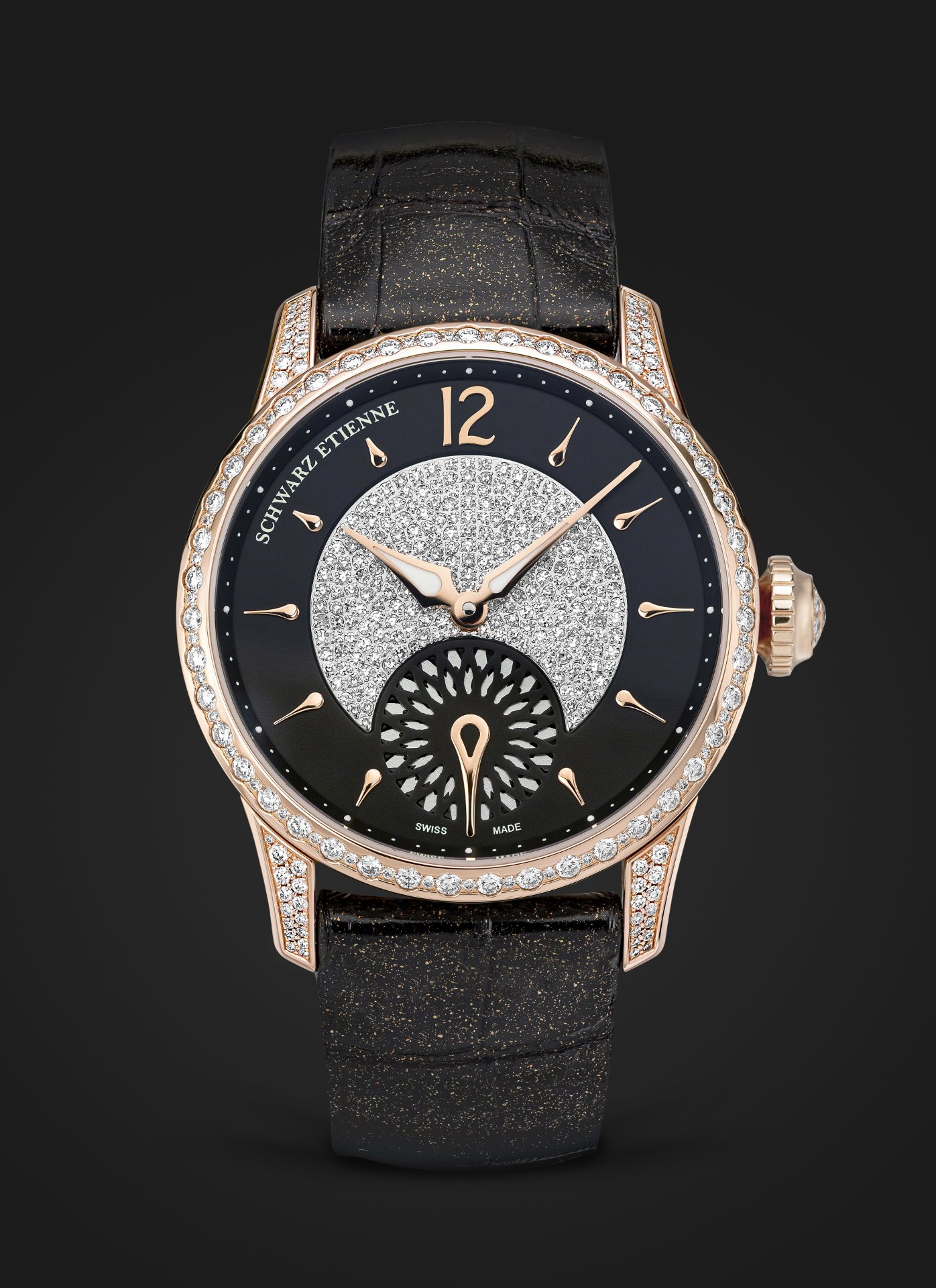 The dial is dressed in a sultry shade of black. Sinuous golden hands, lined with Super-LumiNova, express meaning with clear tone. At the centre of the dial, a bewitching sea of diamonds ensnares light and seduces onlookers. The black hour track is adorned with golden drop-shaped indexes, save for noon where Arabic numerals are employed.