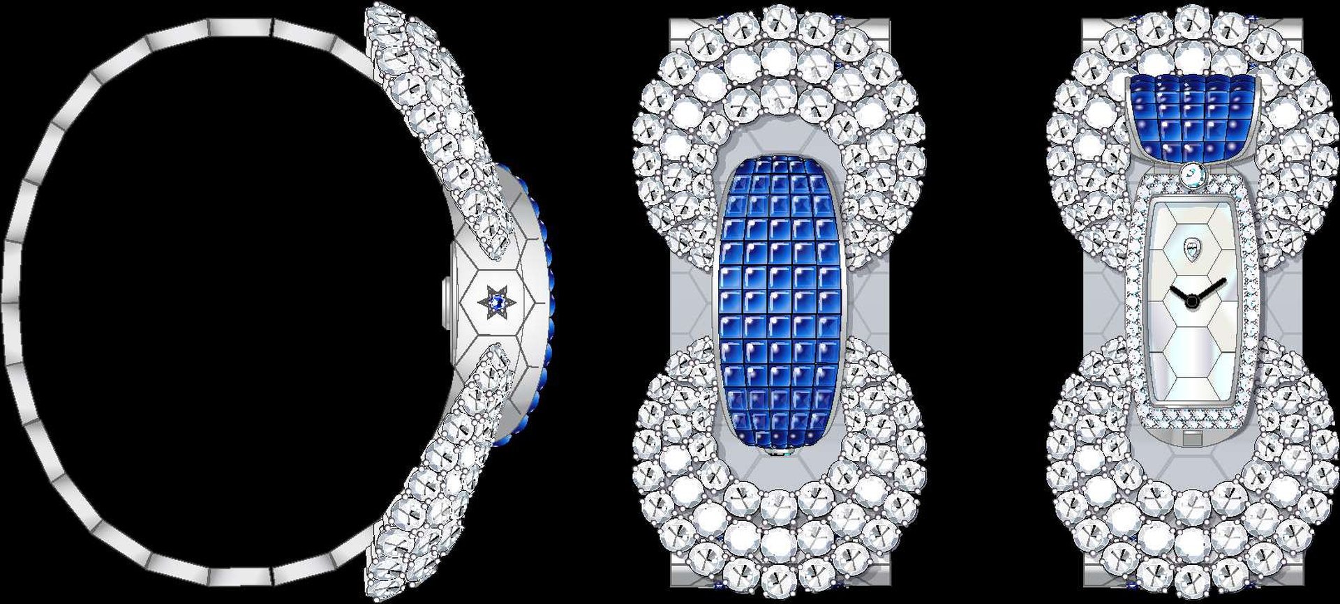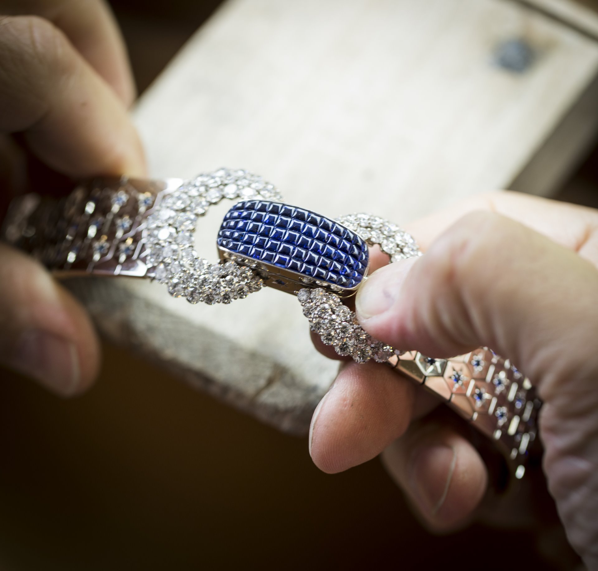 The unique watches are illuminated by one of the Maison’s emblematic techniques: the Mystery Set. A genuine feat of jewelry-making, it consists in inserting specially intricately cut precious stones onto gold rails. Once in place, the gems – sapphires and rubies in this case – perfectly cover the set surface, giving the piece a velvety sheen. Such is the degree of expertise required to create a piece in Mystery Set that it remains the exclusive preserve of a few rare lapidaries and master jewelers, known as the Mains d’Or.