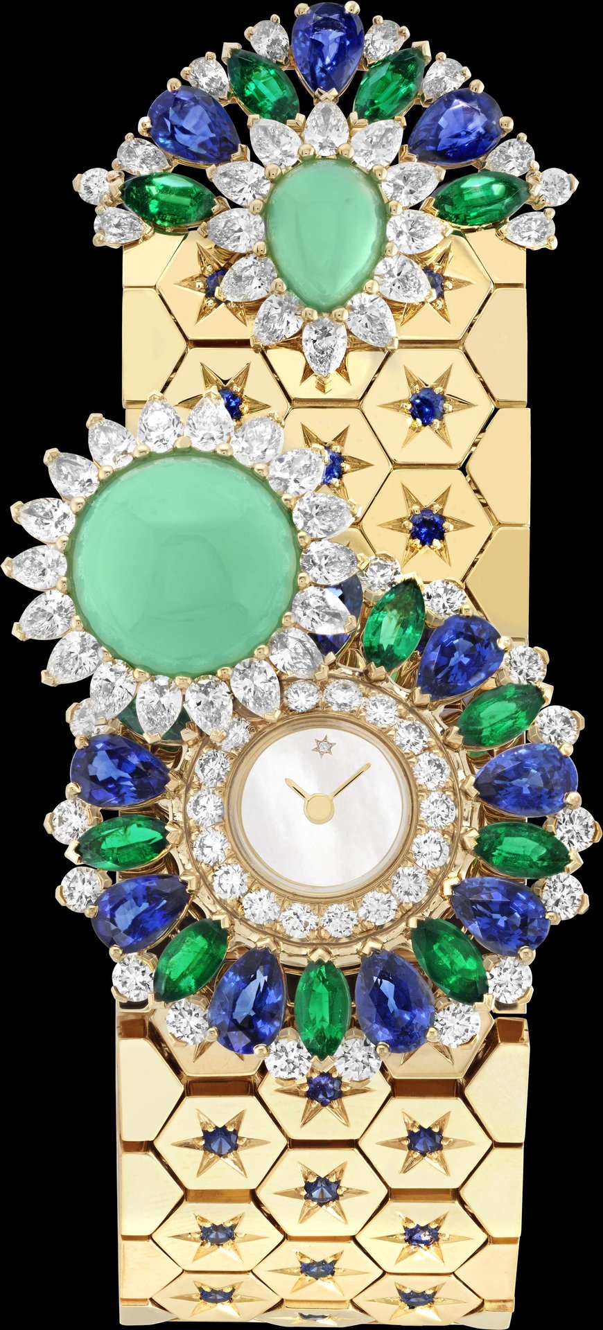 Yellow gold, sapphires, emeralds, chrysoprase, white mother-of-pearl, diamonds, quartz movement