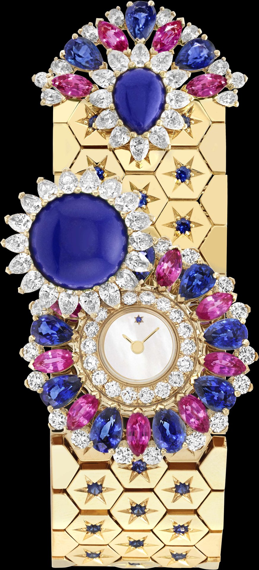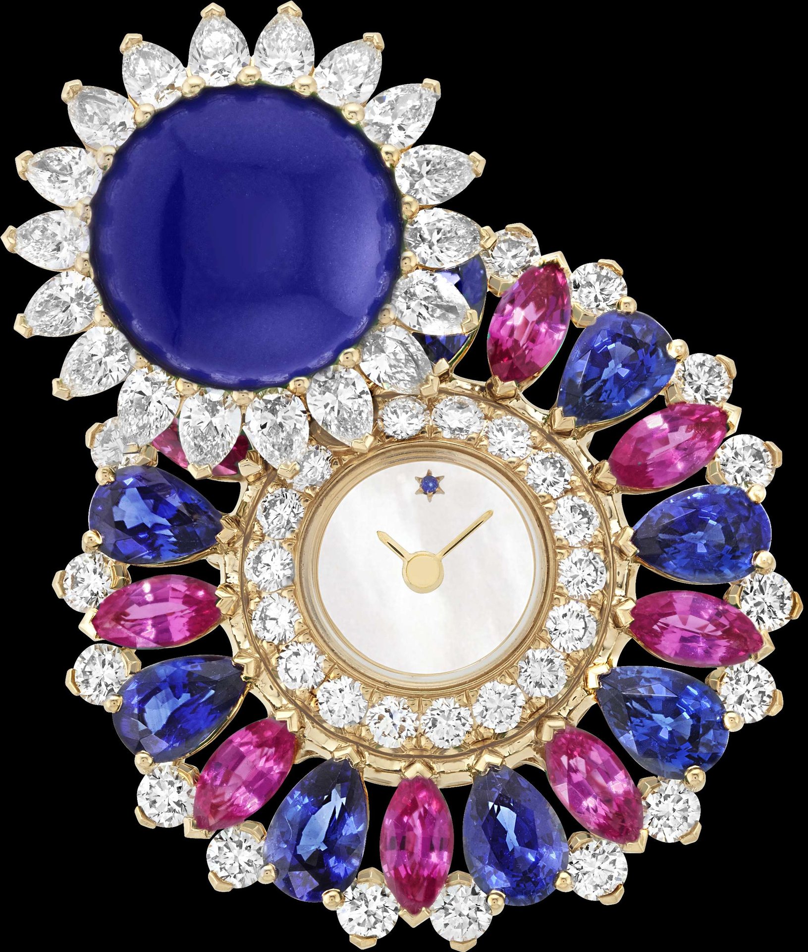 Yellow gold, blue and pink sapphires, lapis lazuli, white mother-of-pearl, diamonds, quartz movement