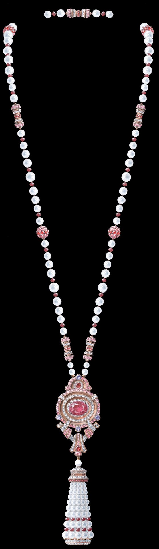 In the same style, the other long necklace reveals a flamboyant palette, in which pearls complement rubies and pink and mauve sapphires. These gems echo the pinky shade of an 8.99-carat spinel, set at the heart of a finely wrought motif.