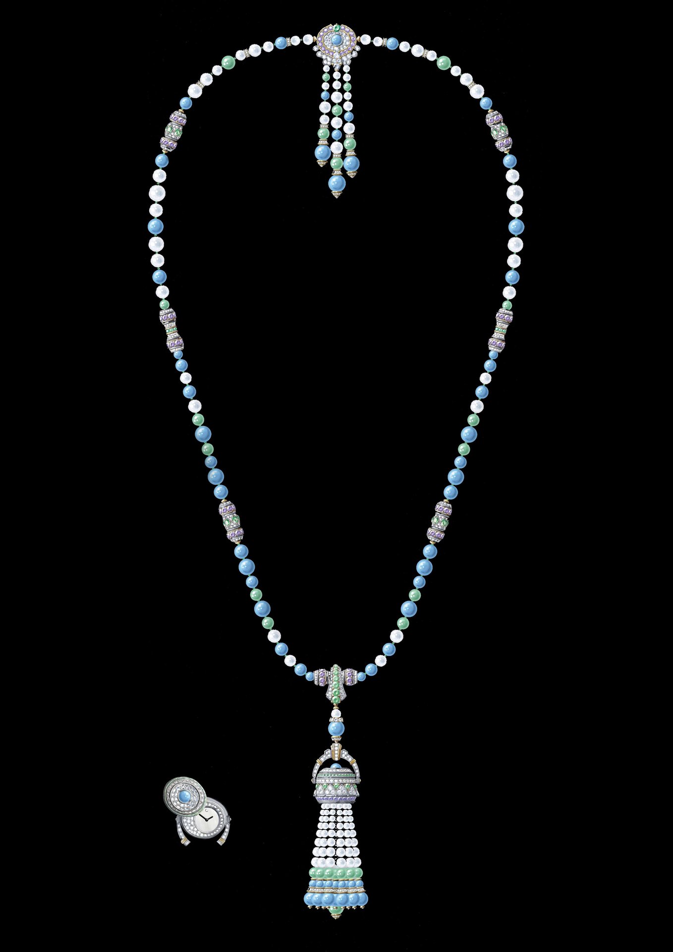 Pompon Gaia transformable long necklace watch White gold, yellow gold, purple sapphires, tsavorite garnets, turquoise, chrysoprase, white cultured pearls, white mother-of-pearl, diamonds, quartz movement
