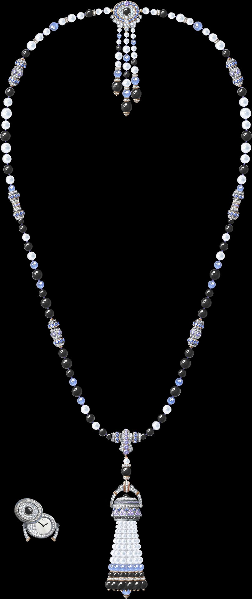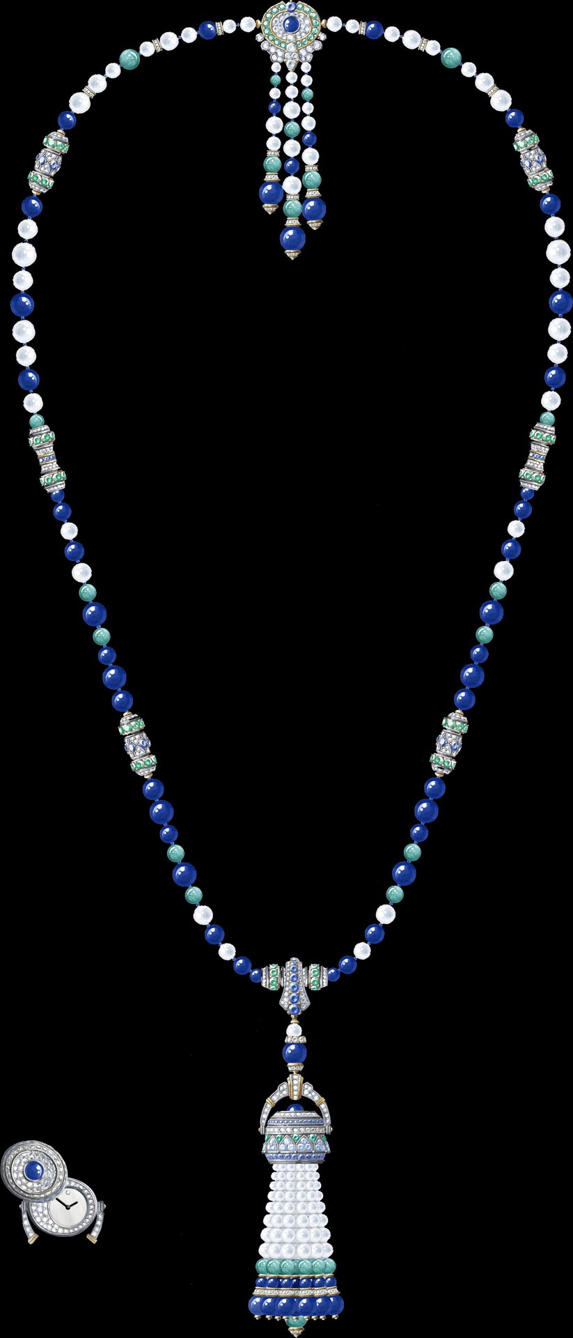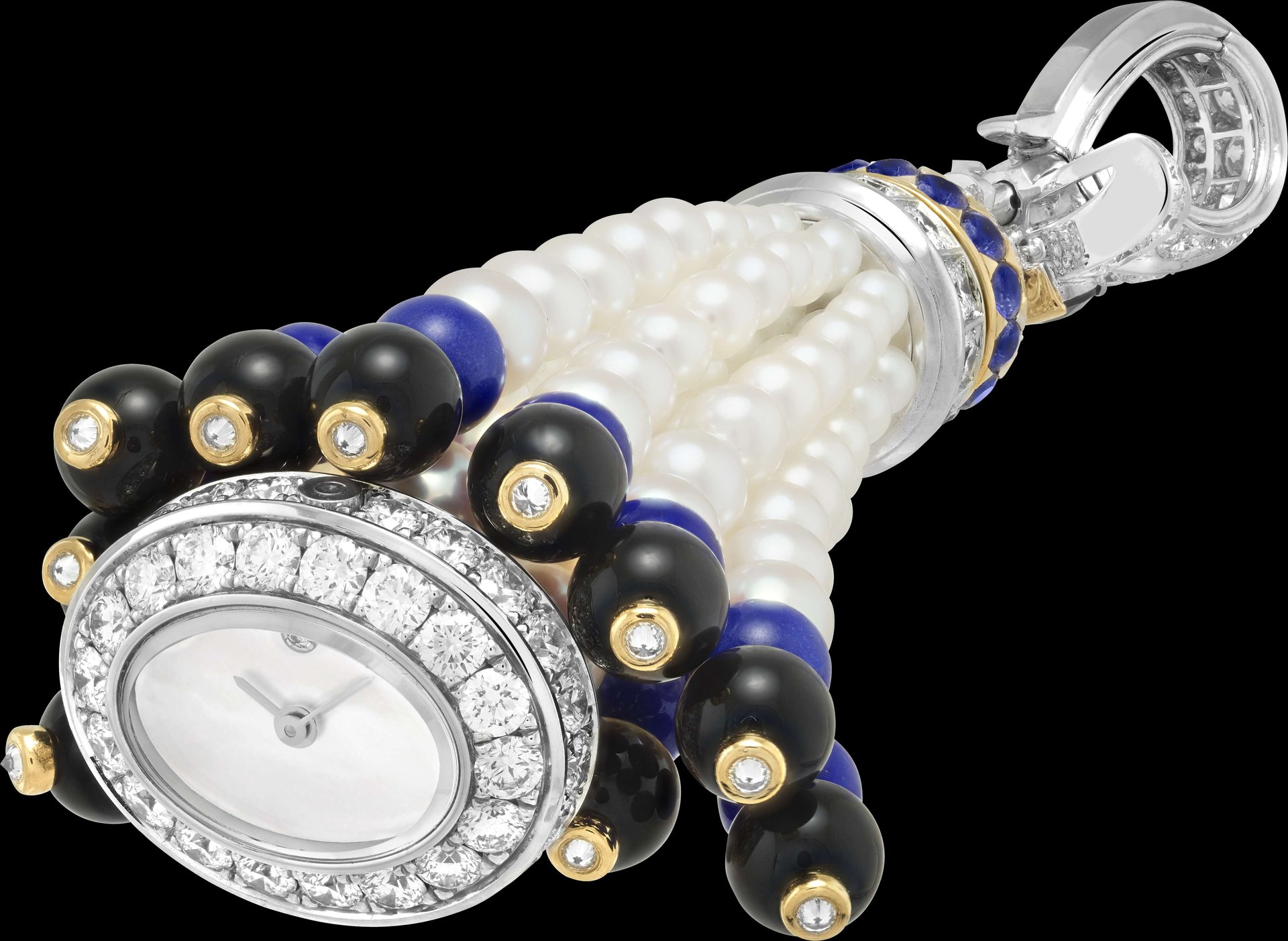 Pompon Leila transformable long necklace watch with detachable clip White gold, yellow gold, platinum, one green cushion-cut tourmaline of 11.87 carats, sapphires, black spinels, onyx, lapis lazuli, white cultured pearls, white mother-of-pearl, diamonds, quartz movement