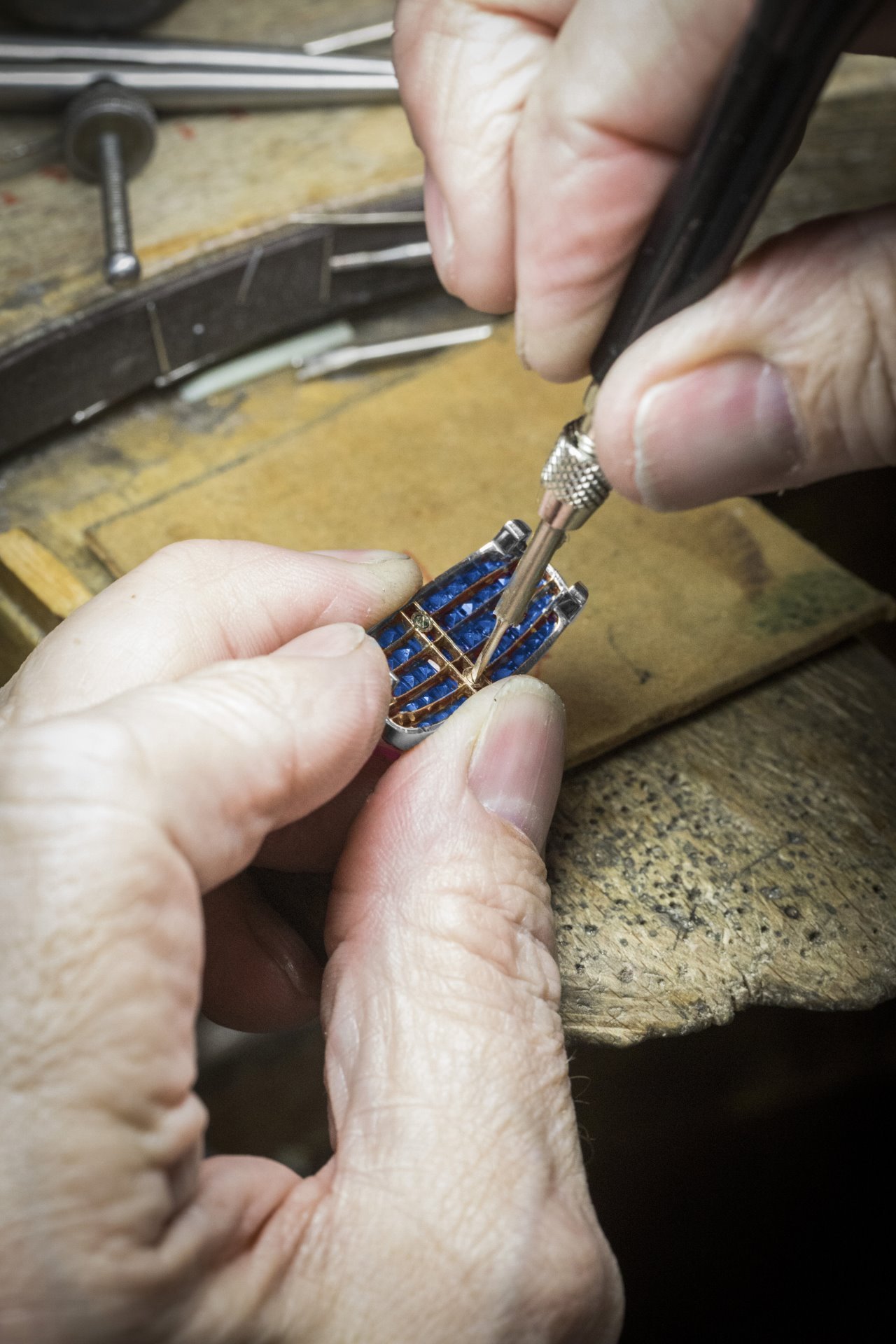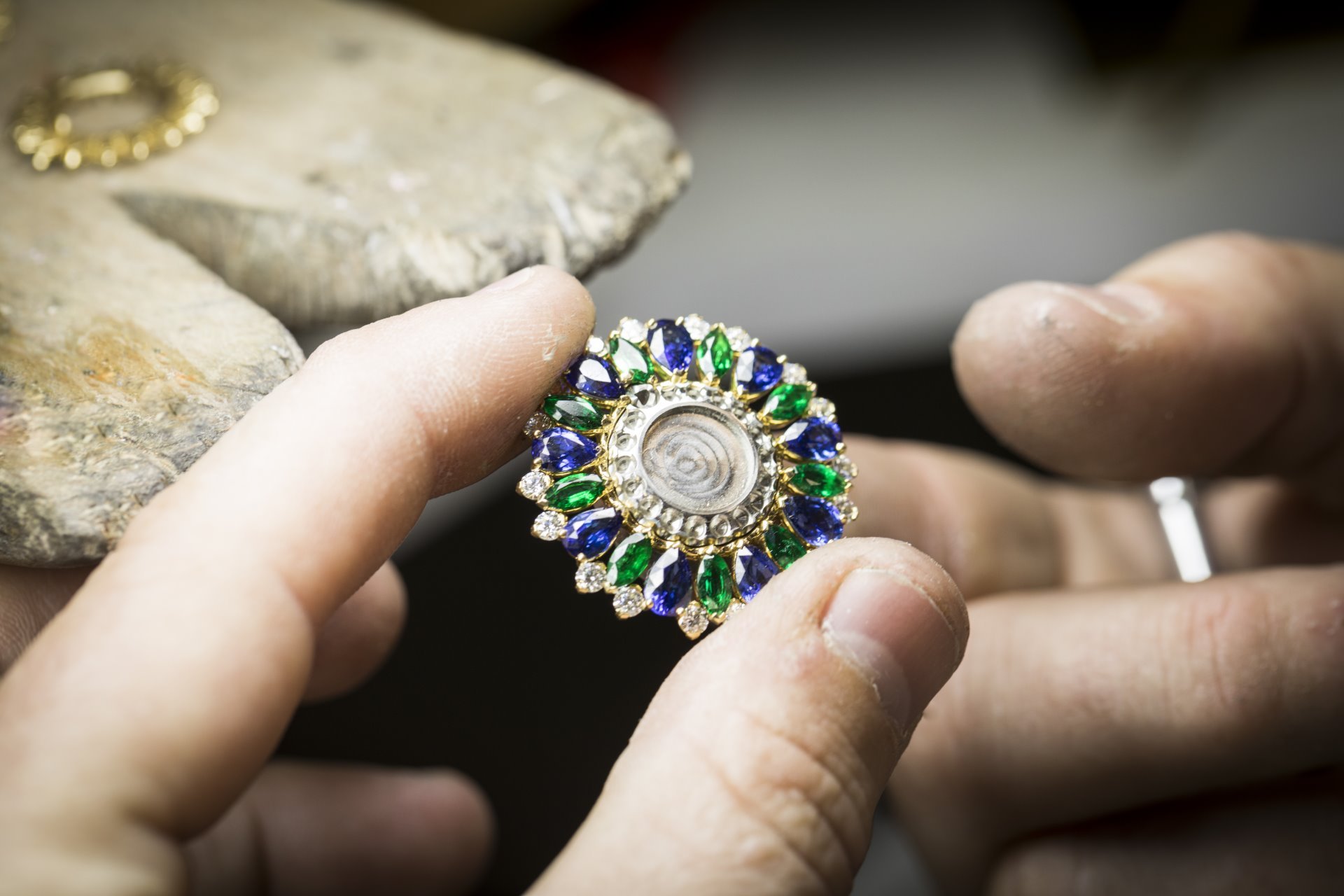The precious materials were chosen by the Maison’s expert gemologists according to the most stringent criteria: the lapis lazuli, coral and chrysoprase were selected for their intense and even color, while the dial’s mother-of-pearl combines harmonious shades, a regular surface and luster of the highest quality. Matching the hard and precious stones – revealed in a variety of cuts that includes cabochon, pear-shaped, navette and round – was an intricate task.