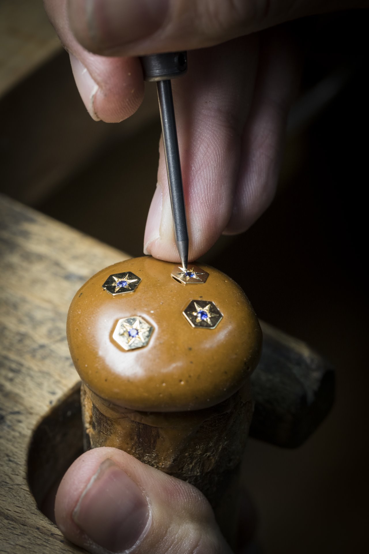 Bringing together different materials and colours of gold, the creations are made up of hexagonal links. Adorned with a precious stone – a ruby or sapphire – in star setting at their centres, they form a glittering constellation around the wrist.