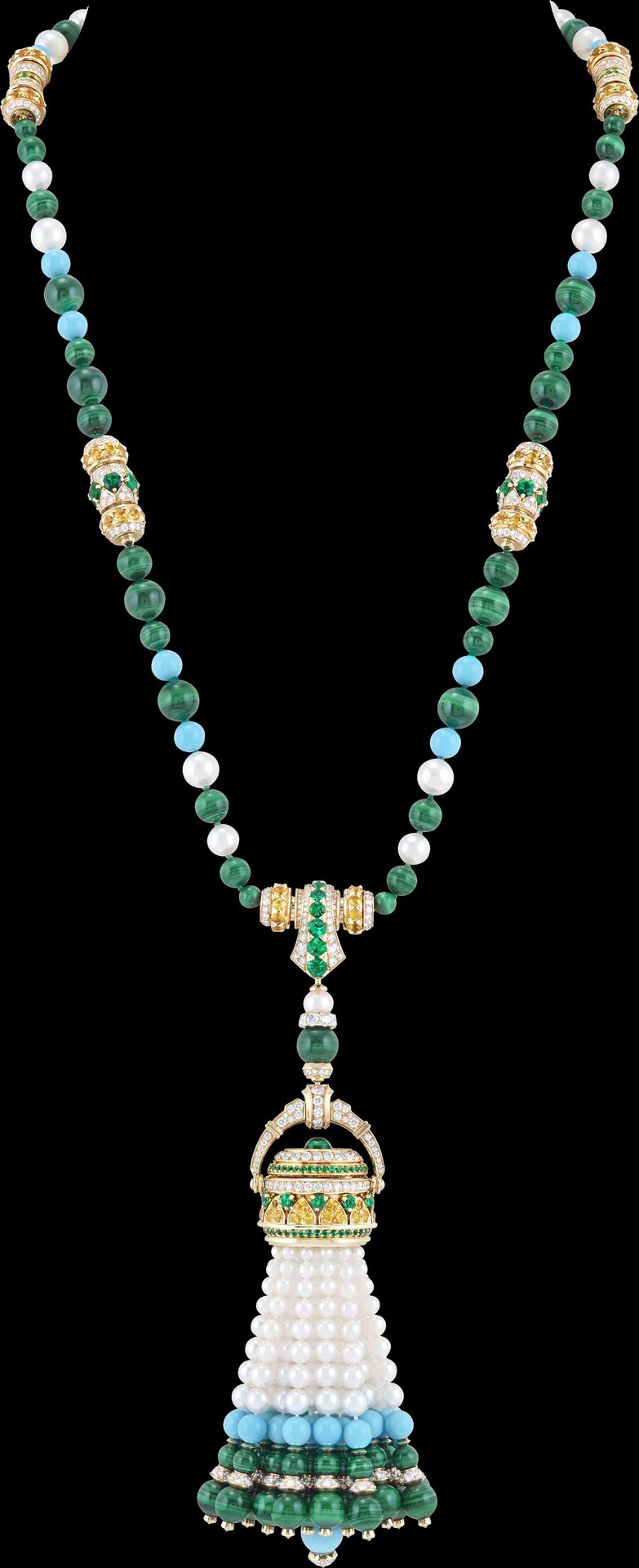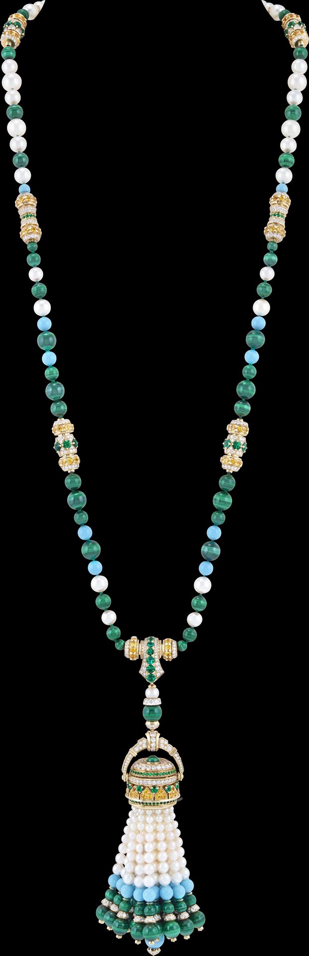 Yellow gold, yellow sapphires, emeralds, malachite, turquoise, white cultured pearls, white mother-of-pearl, diamonds, quartz movement