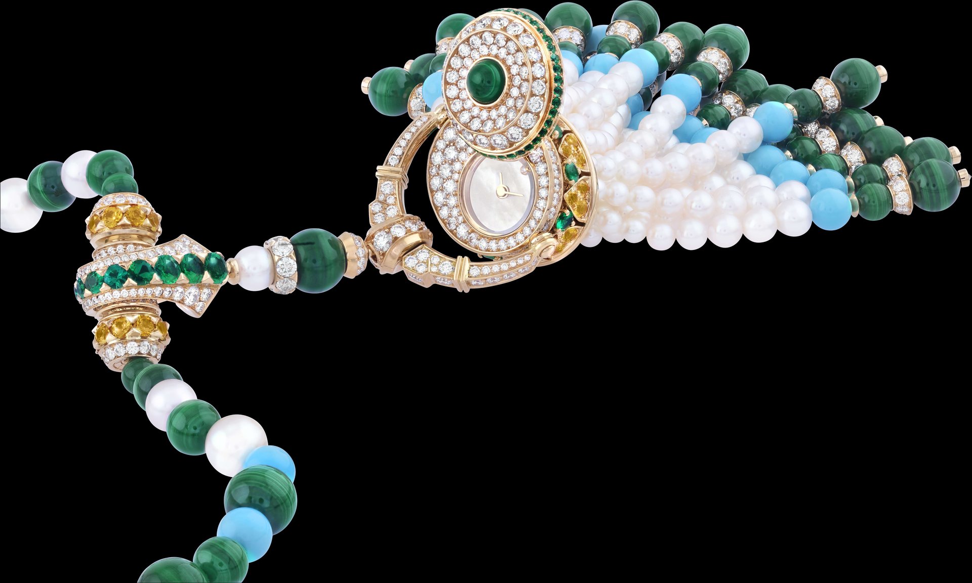 Pompon Gaia transformable long necklace watch Yellow gold, yellow sapphires, emeralds, malachite, turquoise, white cultured pearls, white mother-of-pearl, diamonds, quartz movement