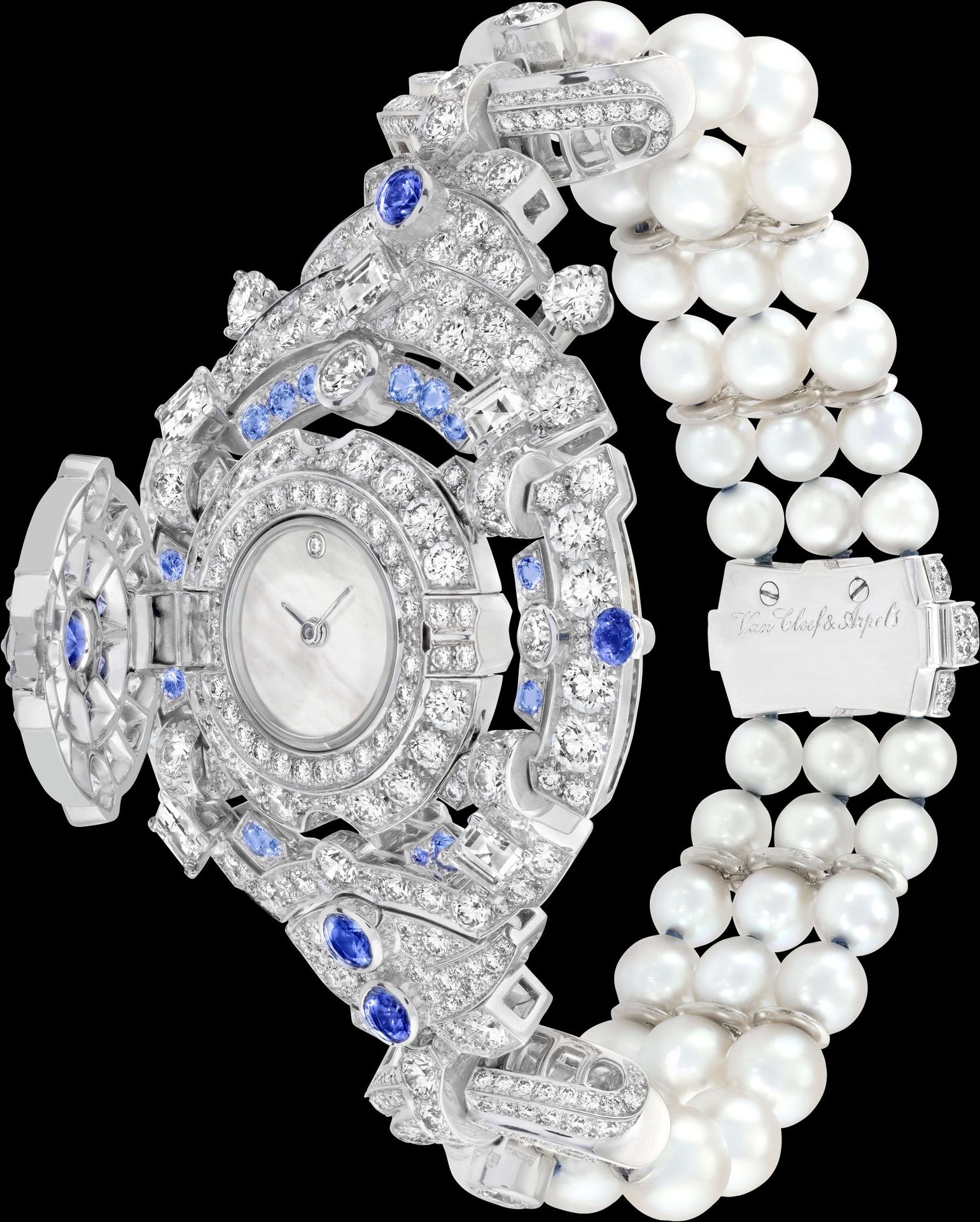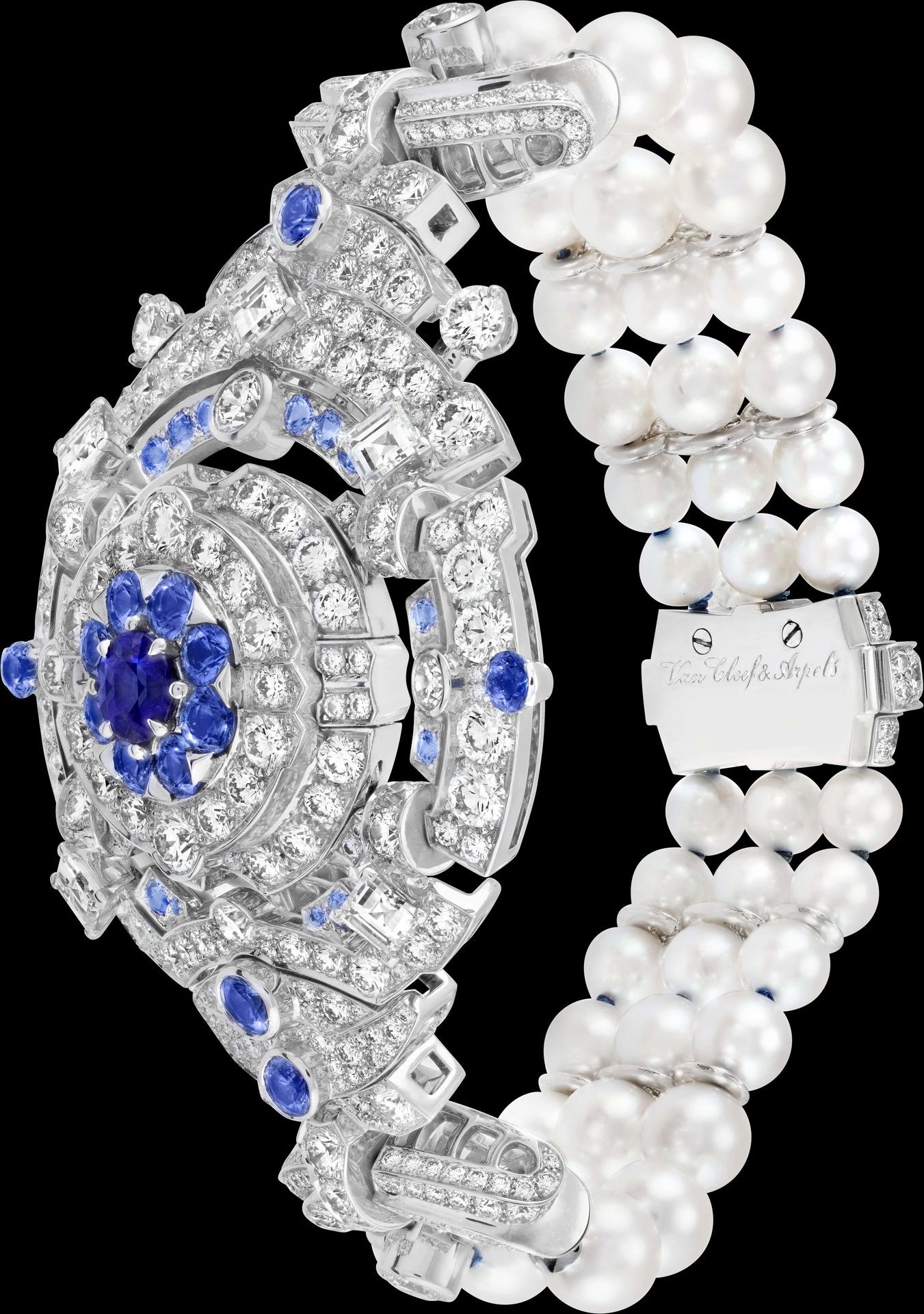 Extremely transformable, this creation is simultaneously unique and graced with a multiplicity of functions: the secret watch and tassel can be removed to vary the length of the long necklace, which can be shortened even further thanks to removable strands of pearls. The latter metamorphose into two bracelets, while the secret watch can be attached to a third bracelet in diamonds, sapphires and cultured pearls.