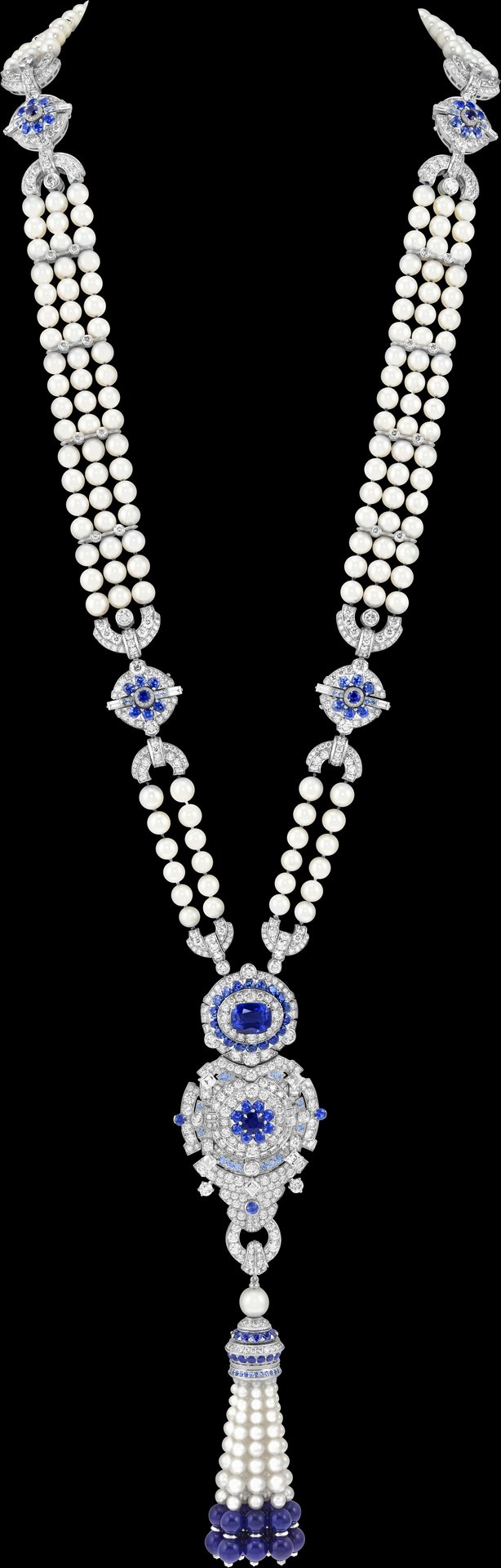 Made up of rows of cultured pearls, jewelry motifs and a fluid tassel, this long necklace reveals a 6.19-carat Sri Lankan sapphire at its heart, in a well-proportioned cushion cut. Its remarkably intense color contrasts with the whiteness of the pearls and establishes a dialogue with the sapphire details and lapis lazuli beads present on the piece. Hidden beneath the central motif, a secret dial is revealed by delicately pressing one of the diamonds