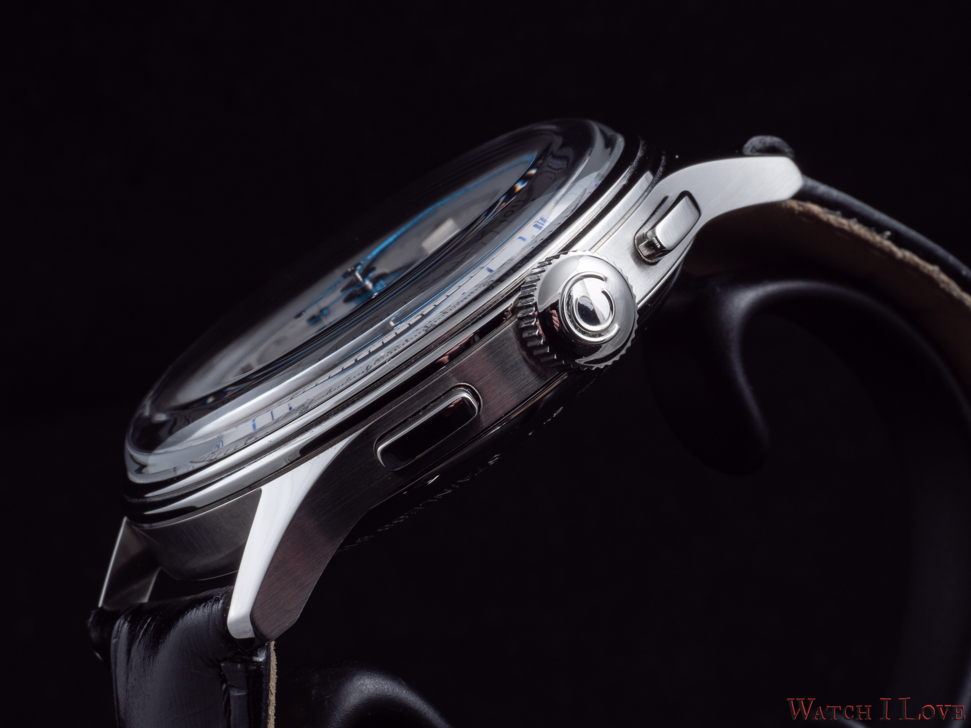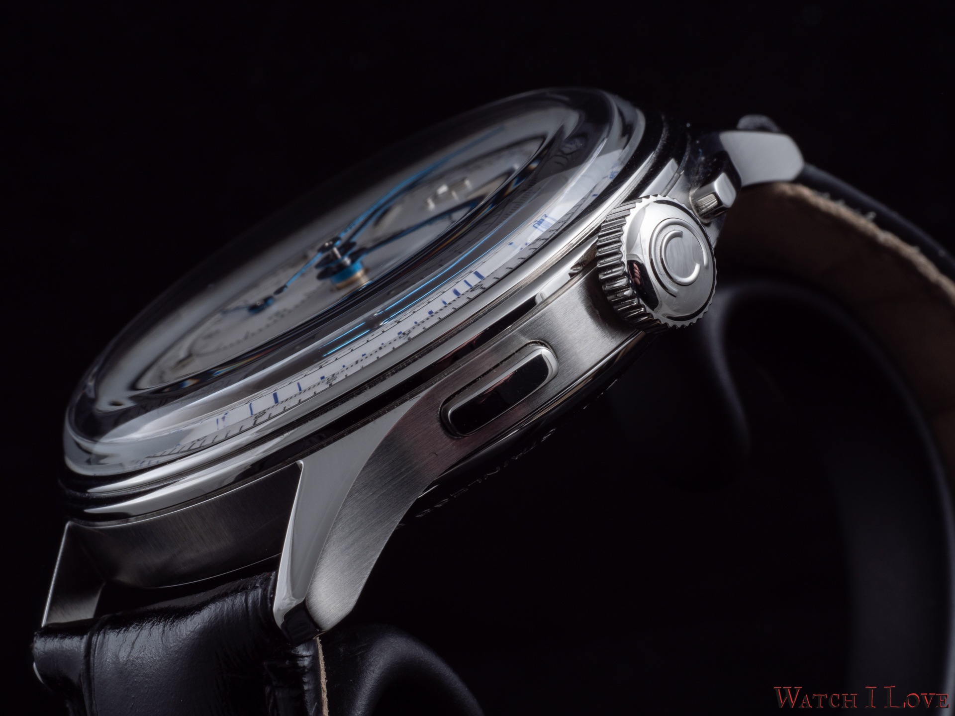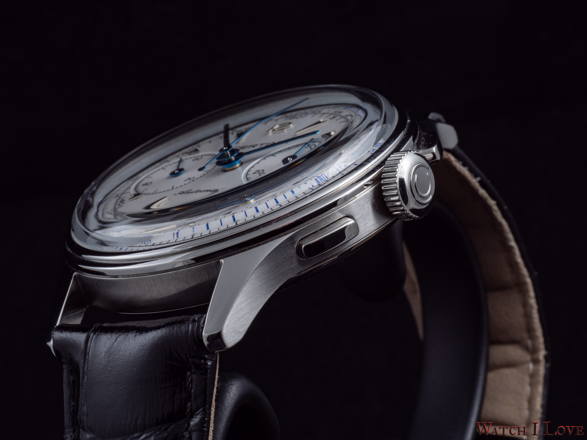 Note the blue accent os the tachymeter scale. The interior register is purposed for the chronographic function with the notation in seconds for great accuracy. The same register can be successfully used for the minute readout. The hours are not fogoten – 10 applied volumetric indices, from which two numerals, serve as indexes for the hours.
