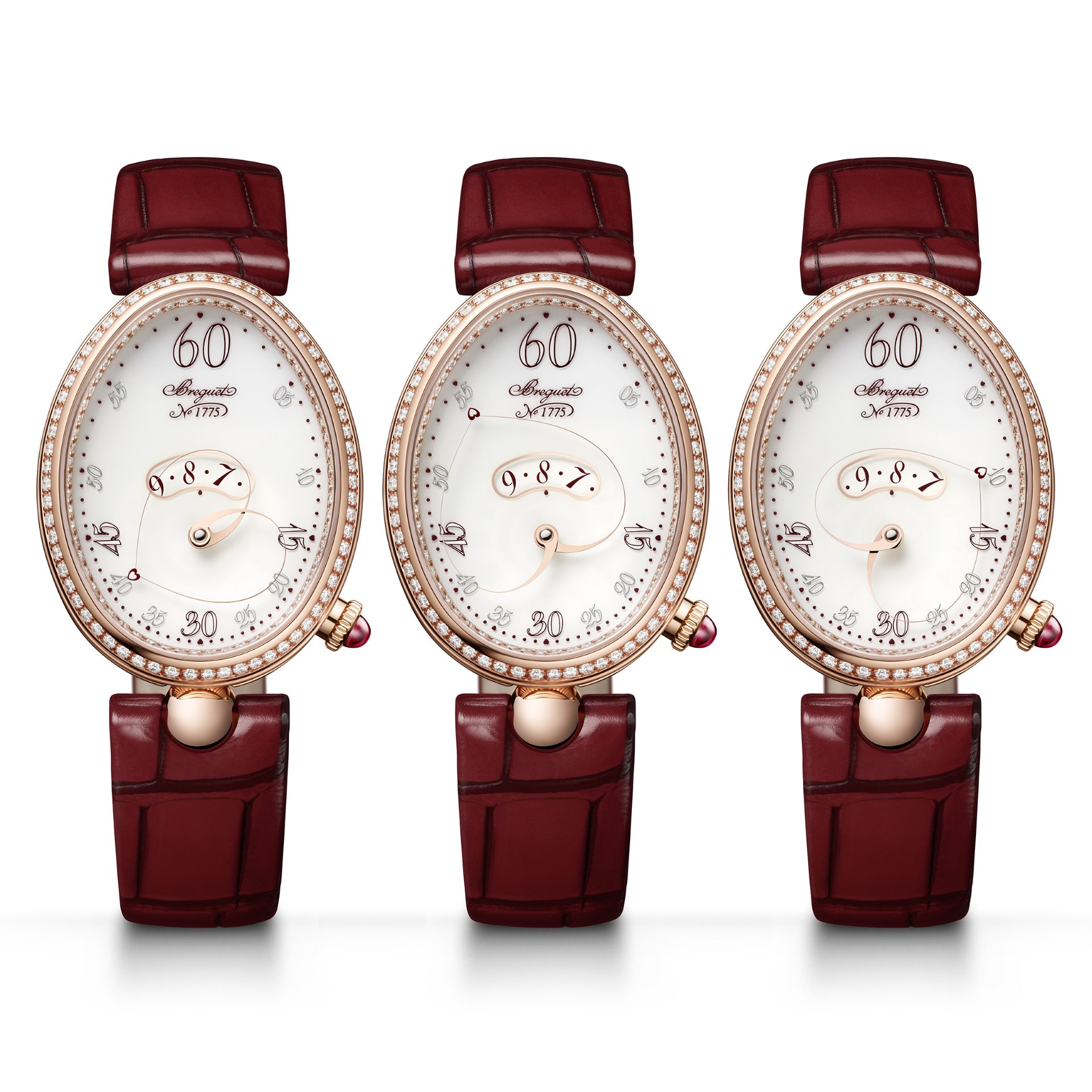 The latest invention of the House of Breguet is a minute hand composed of two independent arms, capable of twisting thanks to an ingenious set of gears to create a heart that is extended at 12 o’clock and more rounded at 6 o’clock. Equipped with an oval-shaped cam – mirroring the curves so characteristic of the Reine de Naples – the mechanism allows each of these arms to move at different speeds. This innovation, created exclusively for the Reine de Naples, is protected by four patents. The gears of this complication, like all the components of the calibre, are all carefully hand-finished in the Breguet tradition – whether visible or invisible to the eye. The sapphire-crystal caseback of the rose gold case reveals the movement of the calibre, the 78A0. On the gold rim, the individual number of the watch is engraved, recorded in the archives of the House of Breguet, which have been maintained since the end of the eighteenth century.