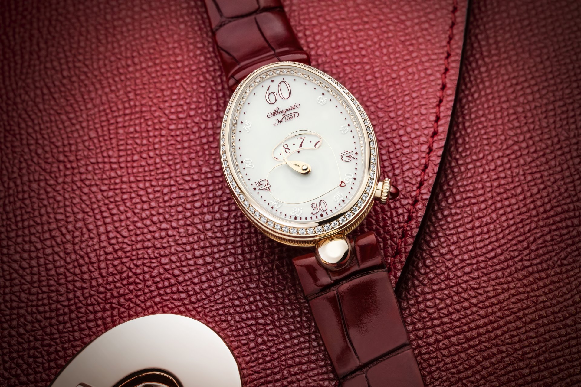 Today, for its new creation dedicated to women and to love, the House of Breguet has designed a new system protected by several patents. The magic of an innovative mechanism changes the heart shape of the minute hand – off-centre at 6 o’clock – depending on its position on the oval dial. Breguet, which has always developed special watches dedicated to women, is thus faithful to its history and its practice. For this new creation, its curves stretch as the hand moves across the top half of the dial, and become more rounded at the bottom. A real heart that beats… A pared-down dial highlights the delicate elegance and great romanticism of this piece. Touches of vermilion red add to the intensity of the lines of the hours chapter, the leather strap, and the crown, which is adorned with a ruby. This luxurious and exclusive composition is brought to perfection with rose gold and diamonds.