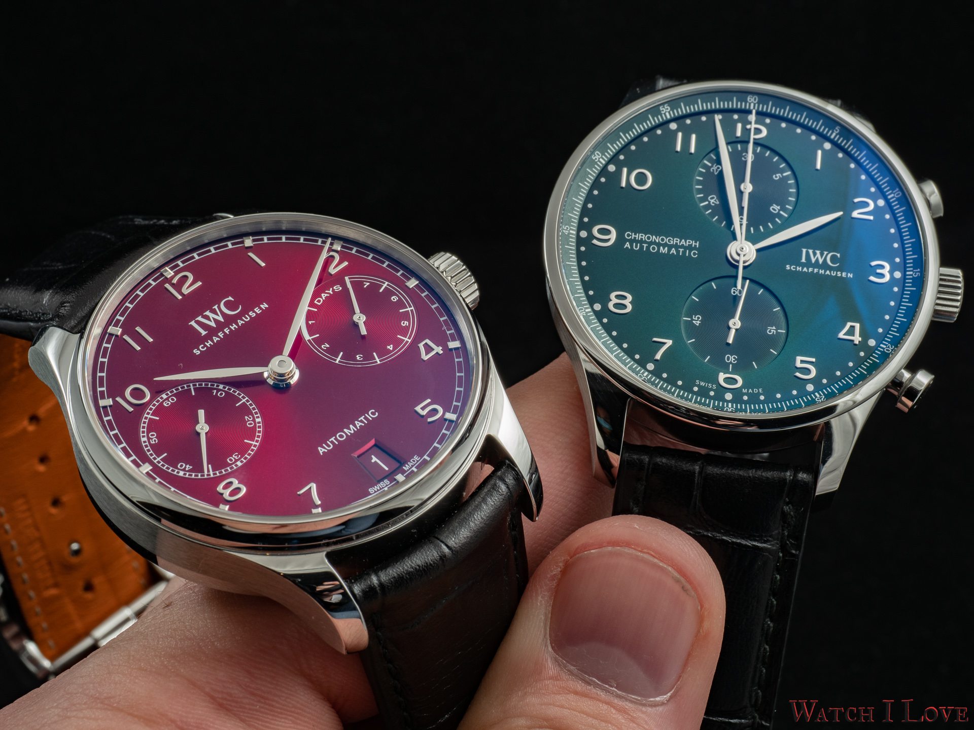 One offers the splendour of 7-days power reserve IWC movement in a strong colour, the other offers the classic chronograph in a rare statement. Both watches feels nice on the wrist and honour the Portugieser collection.