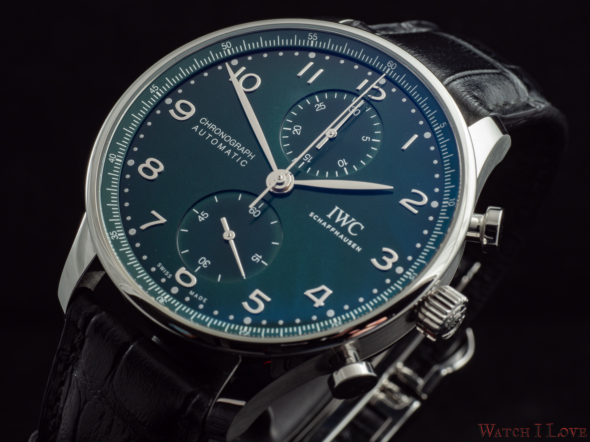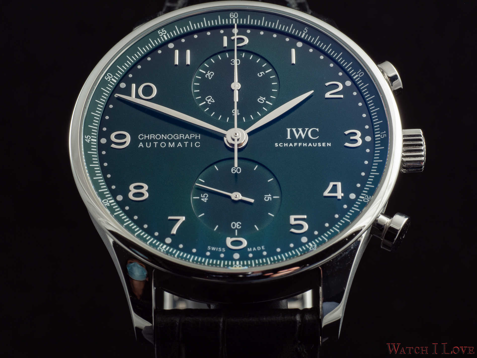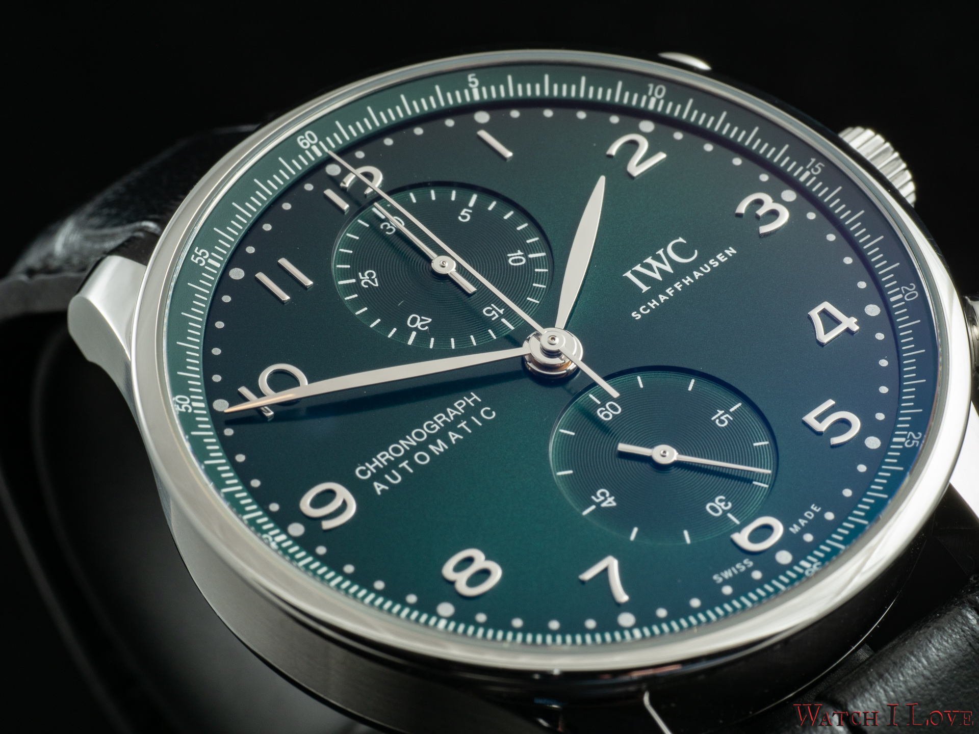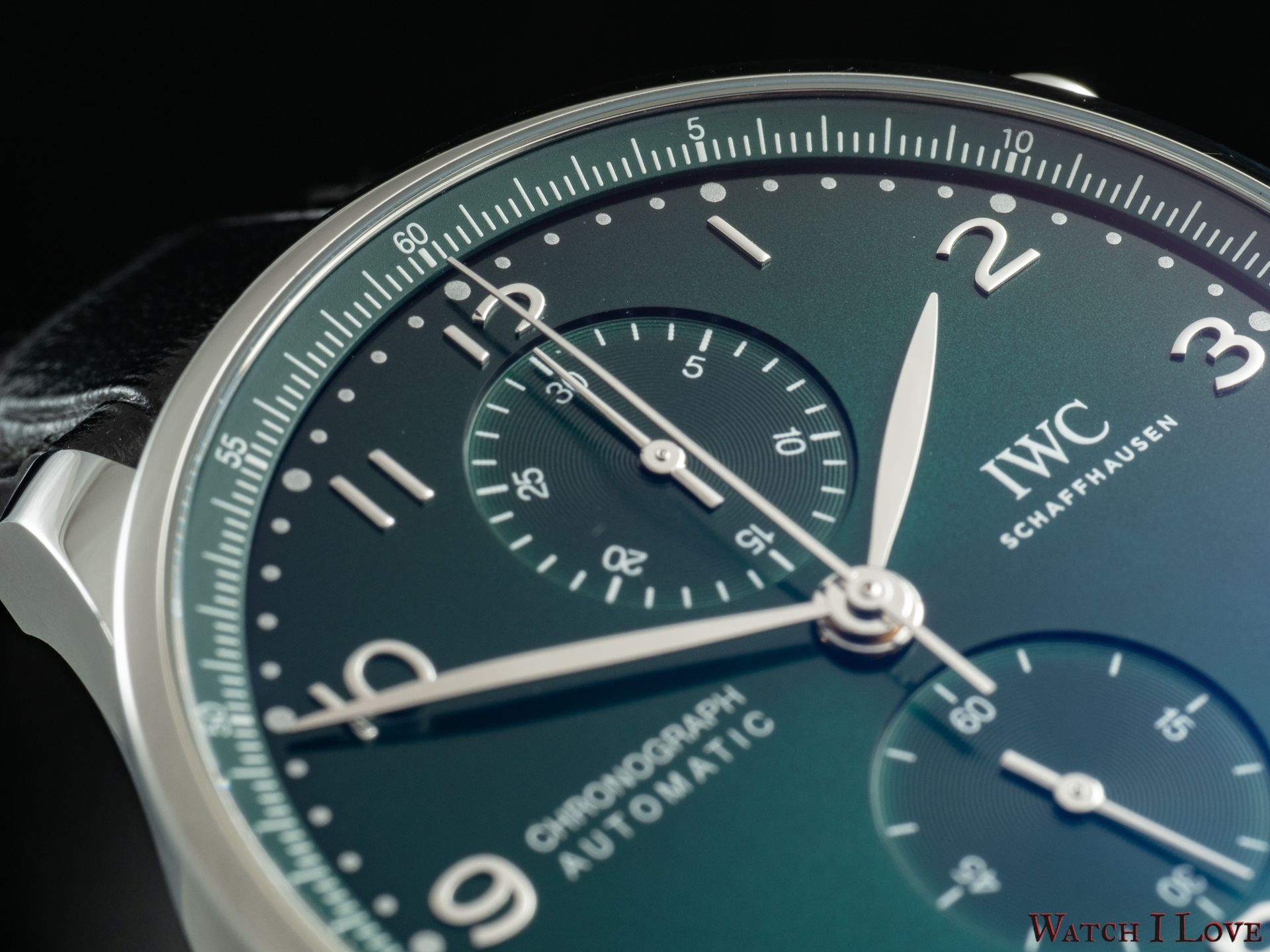 Ref. IW371615 is the modern in-house powered chronograph with a colour twist – green. The pictures do a disservice to a good looking sunray dial. We find again the brushed/polished Portugieser steel case with flat headed pushers.