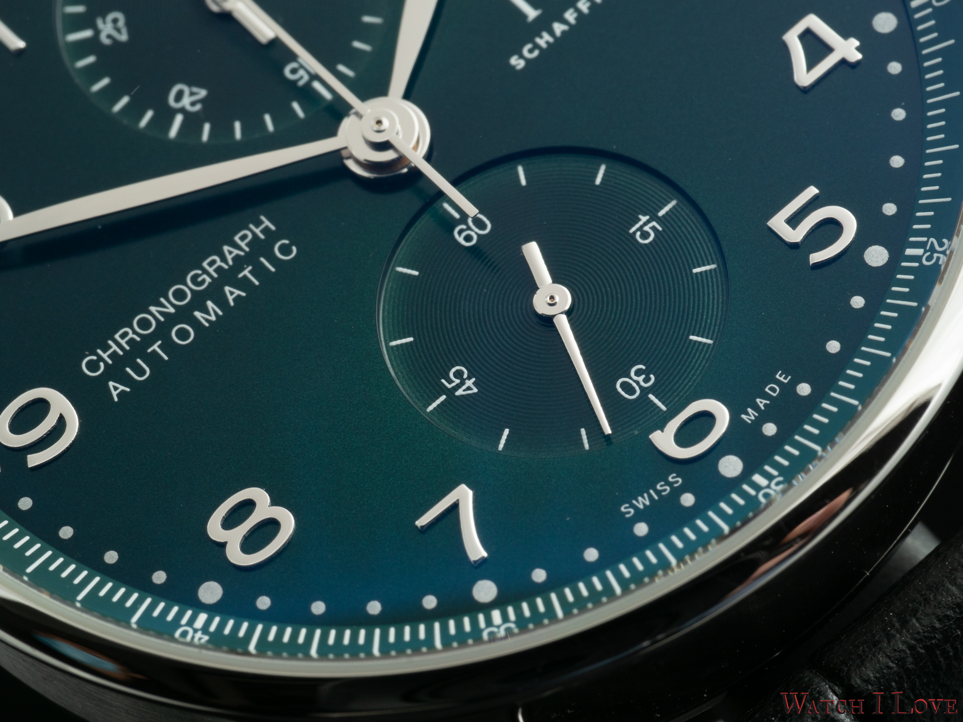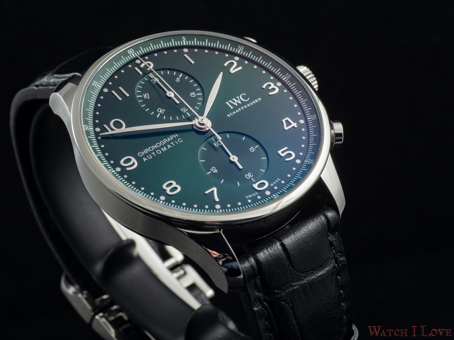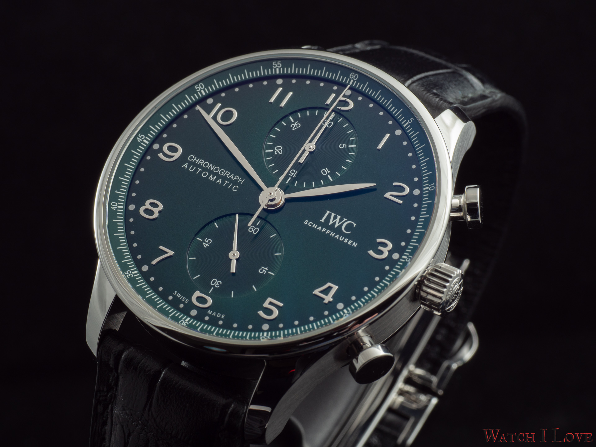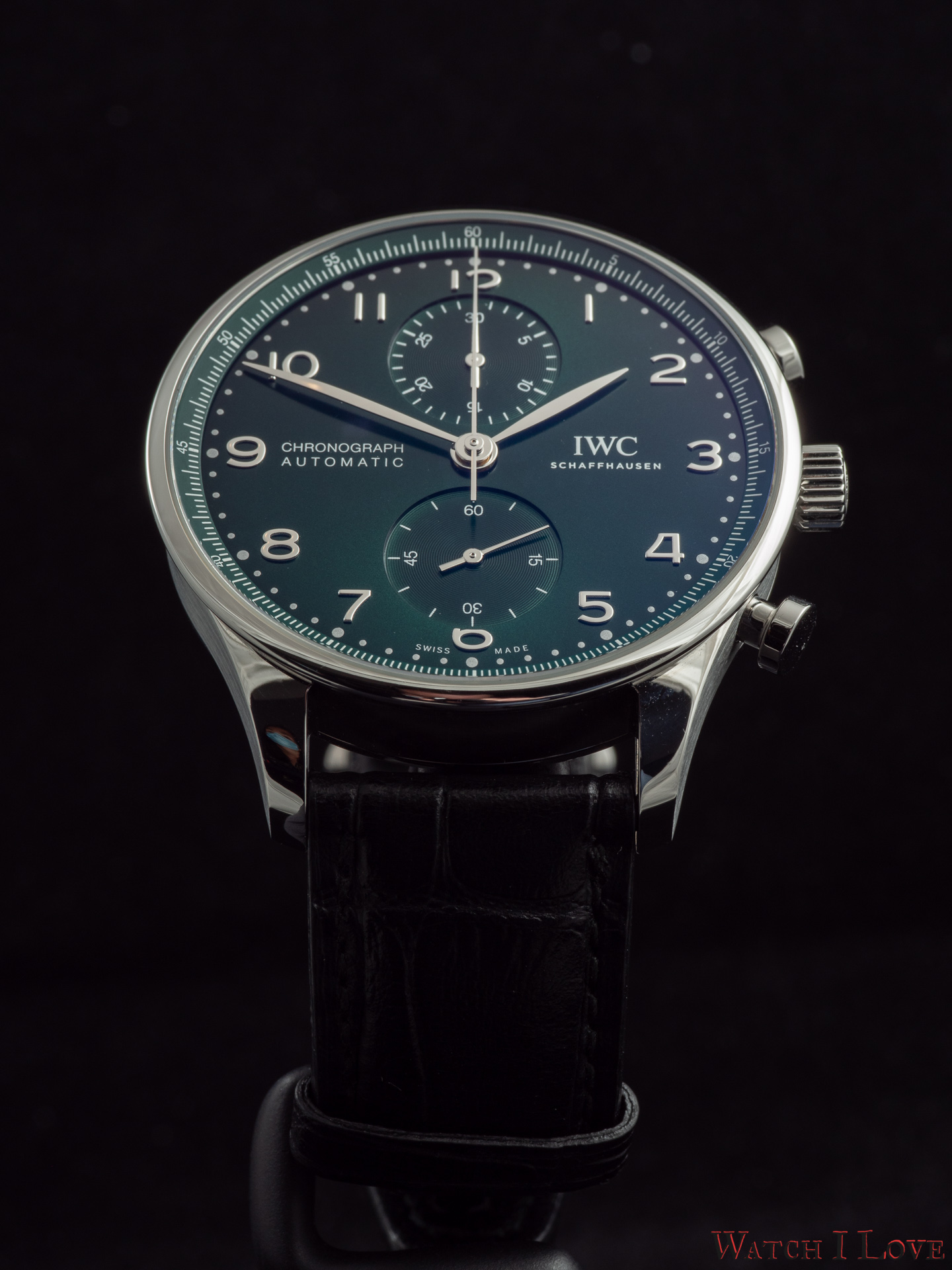 Ref. IW371615 is the modern in-house powered chronograph with a colour twist – green. The pictures do a disservice to a good looking sunray dial. We find again the brushed/polished Portugieser steel case with flat headed pushers.