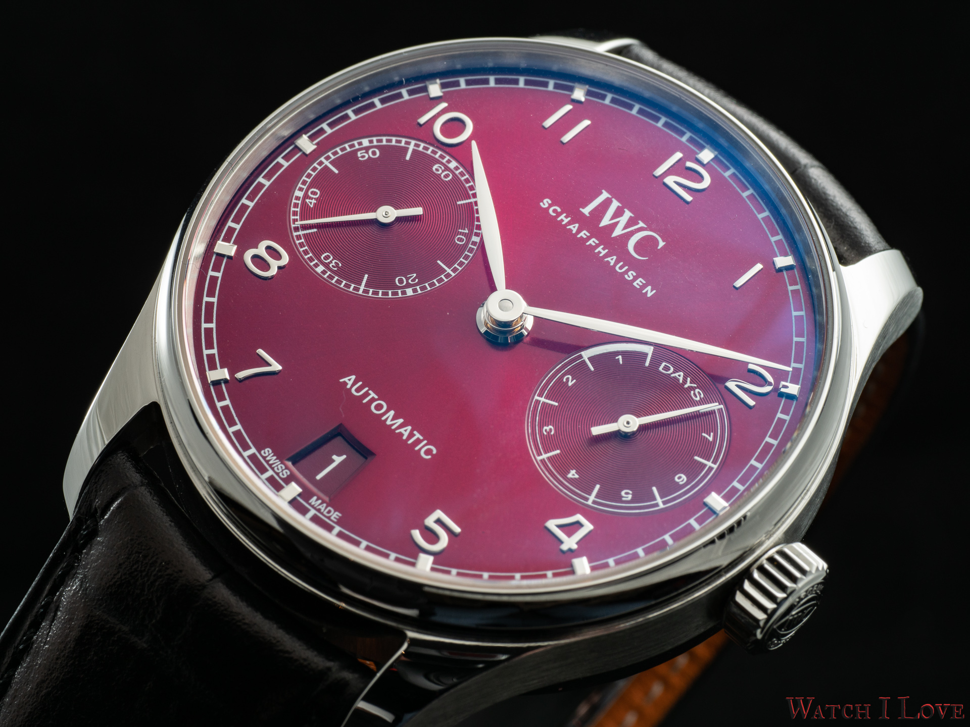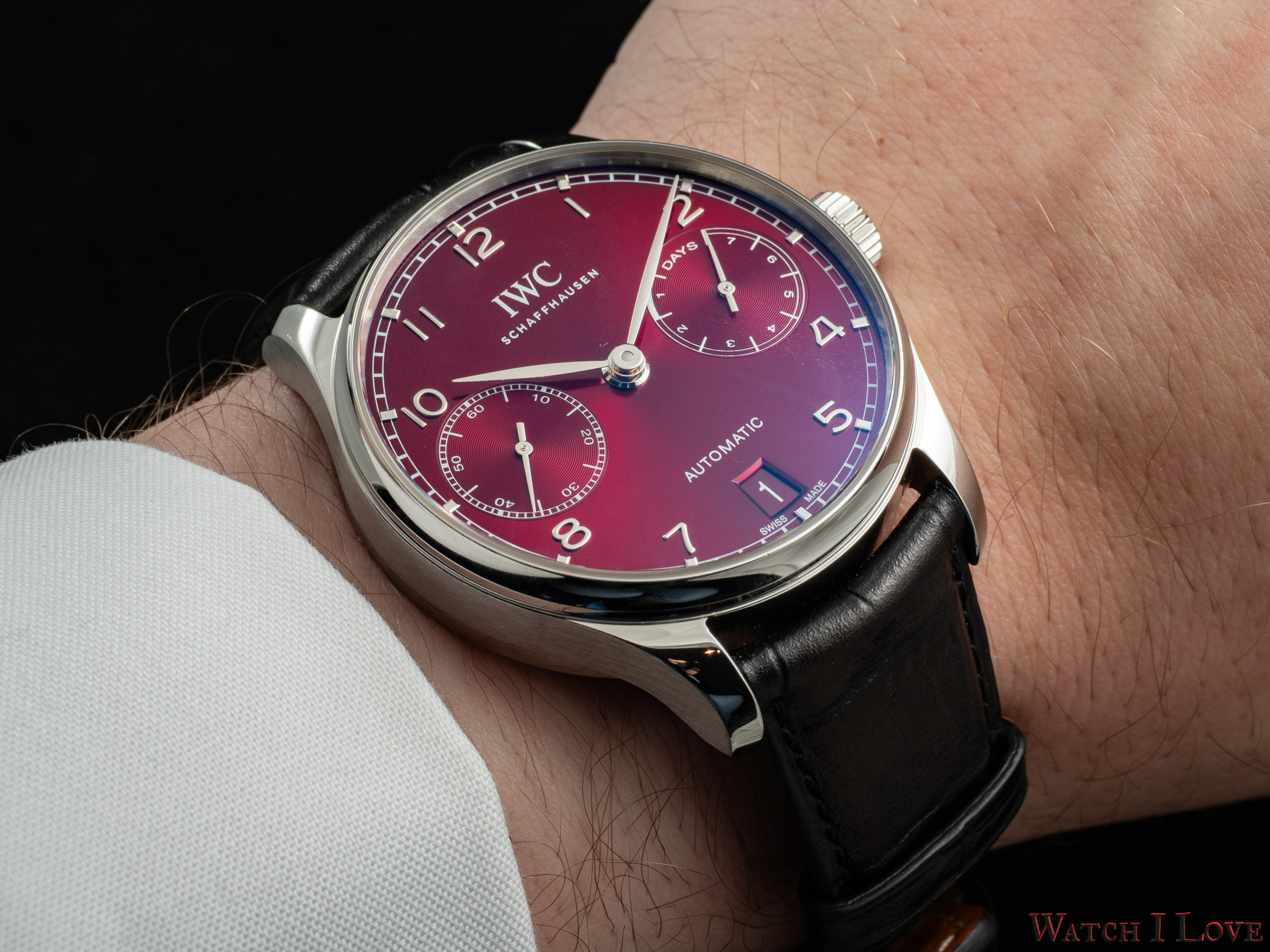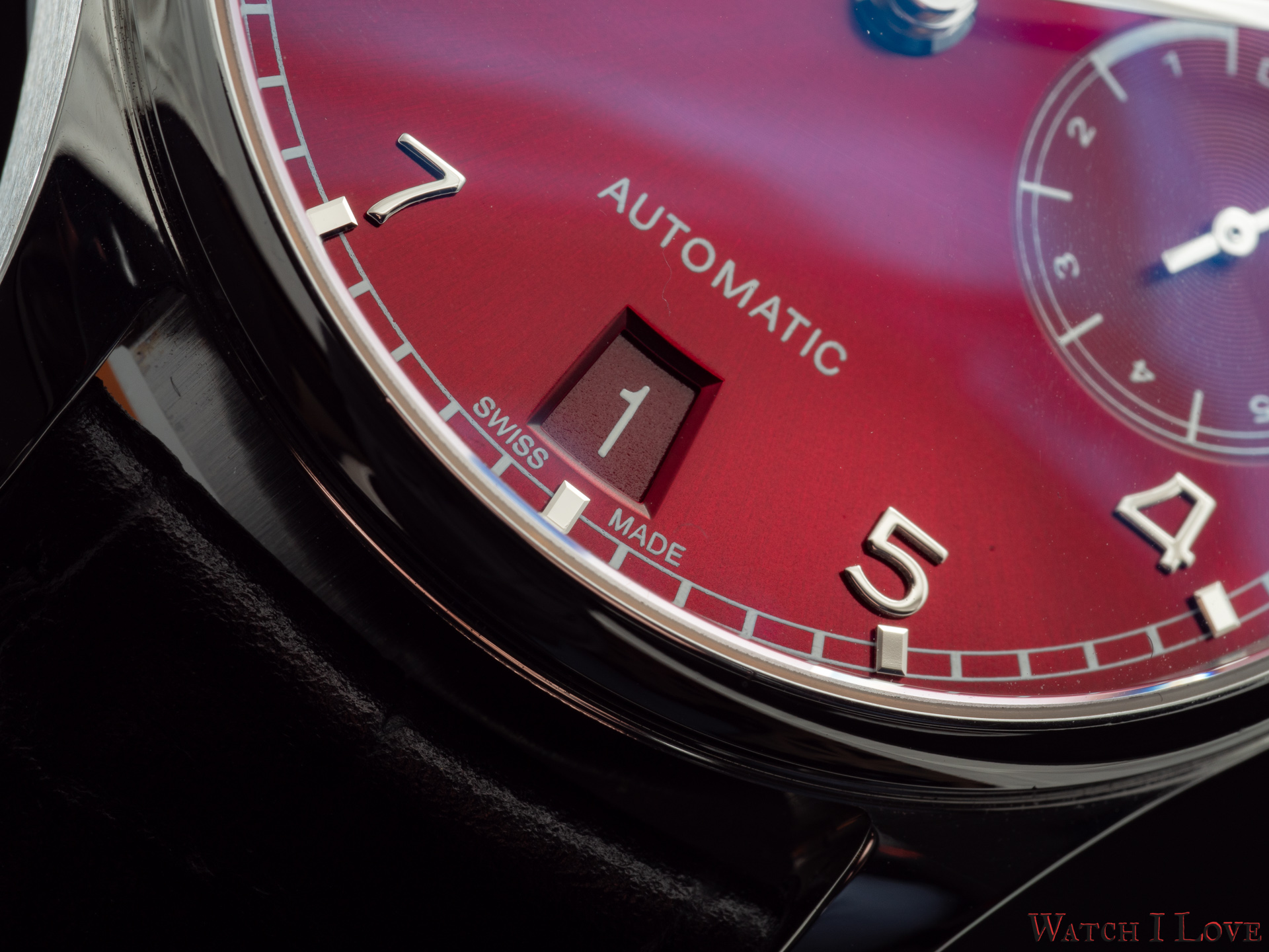The lower side of the dial shows in a proper colour scheme the date. Note the Portugieser traditional rhodium-plated hands and appliques.