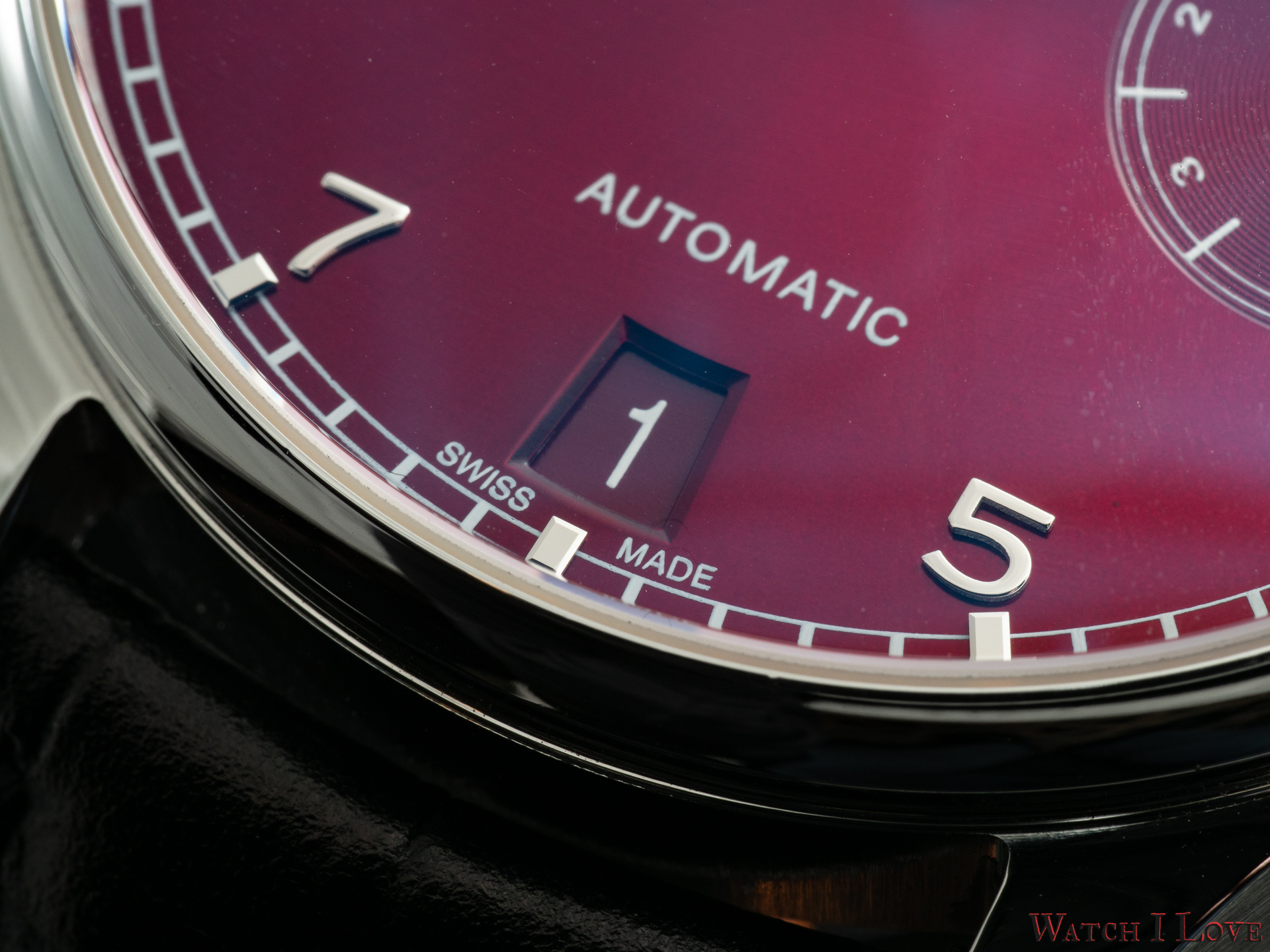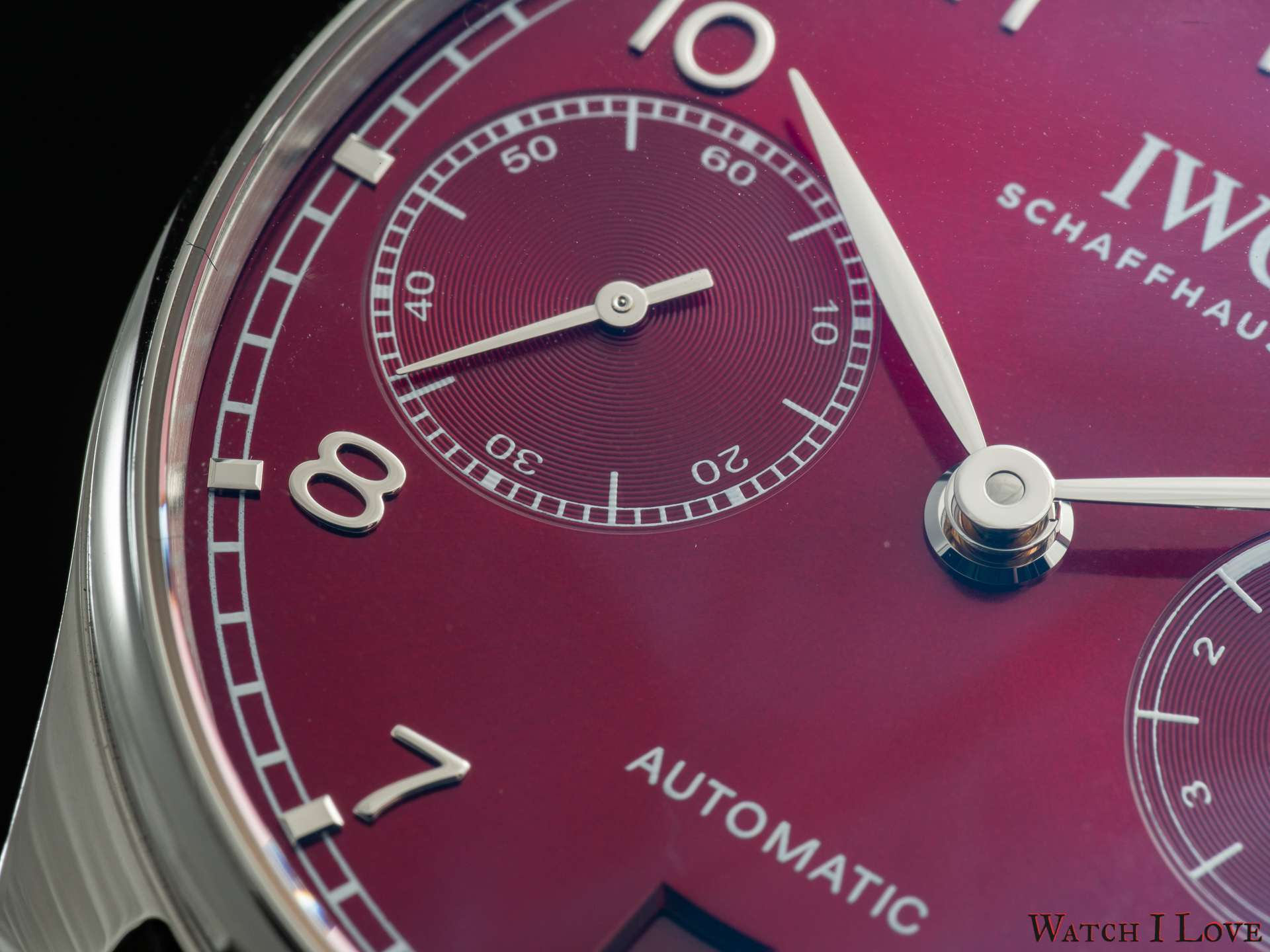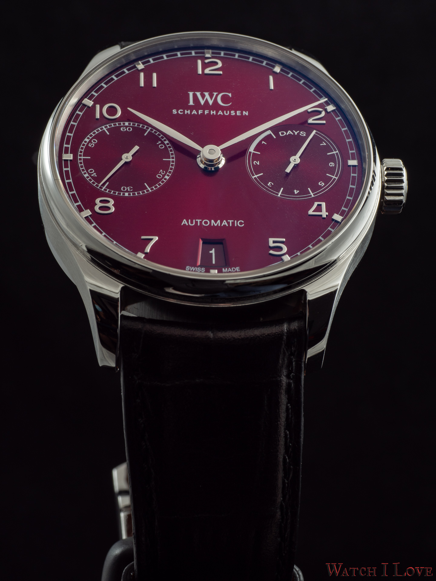 The lower side of the dial shows in a proper colour scheme the date. Note the Portugieser traditional rhodium-plated hands and appliques.