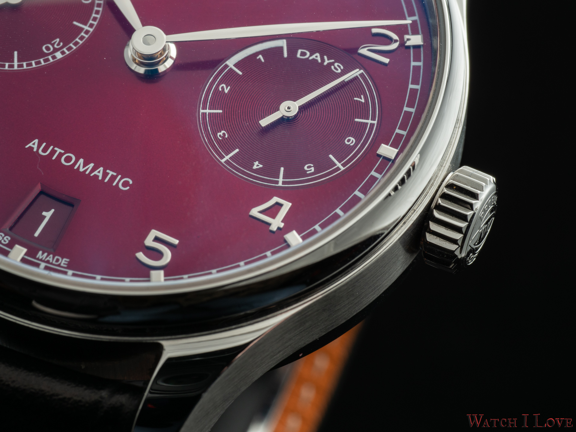 - Materials: Stainless steel case, burgundy dial, rhodium-plated hands and appliques, black alligator leather strap