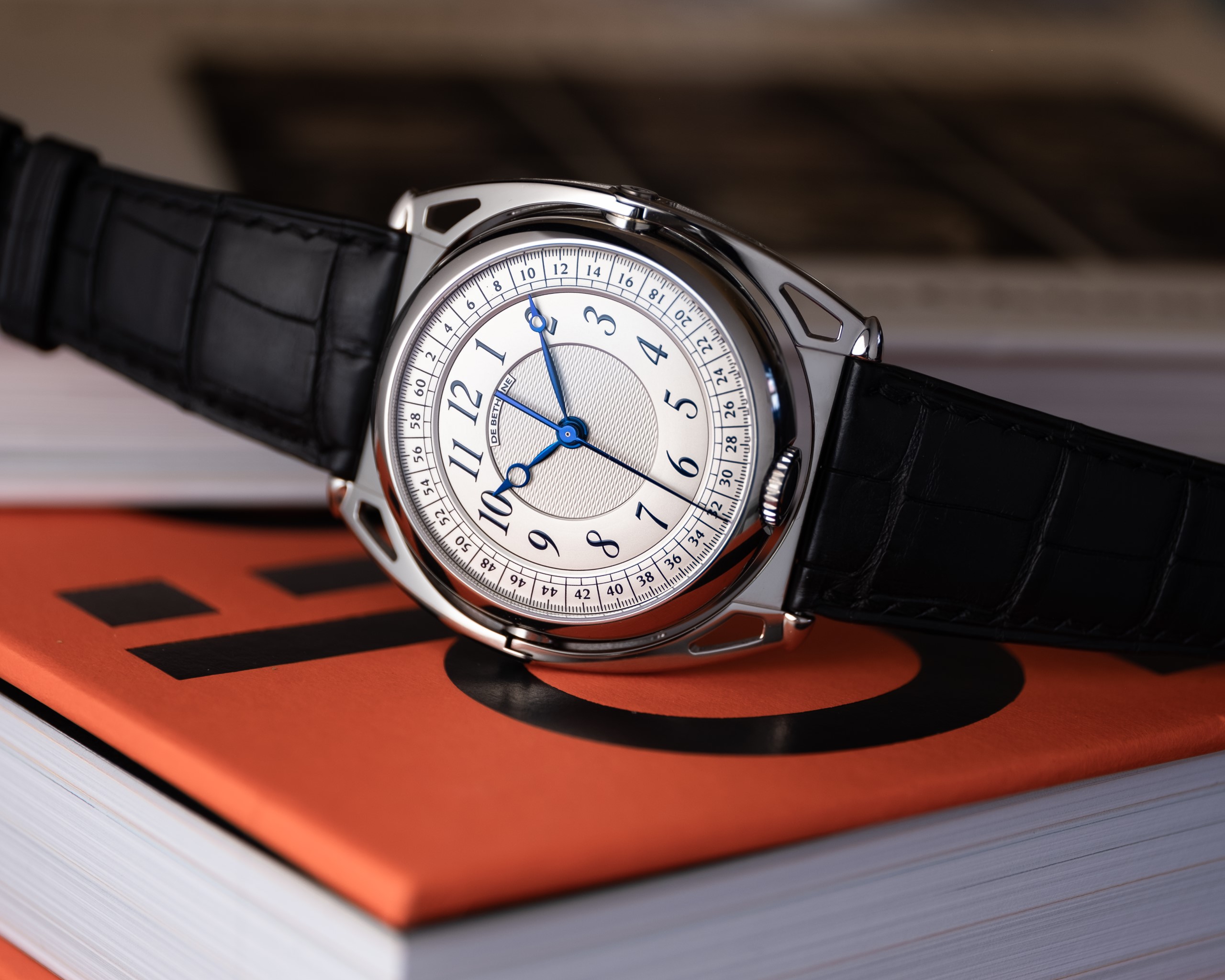 Thanks to a cam, a small “notch” allows the watch case to be instinctively and perfectly positioned in line with the floating lugs. The round case rotates on its central axis and can be positioned, front or back, in a delightfully easy, smooth and entirely natural way.