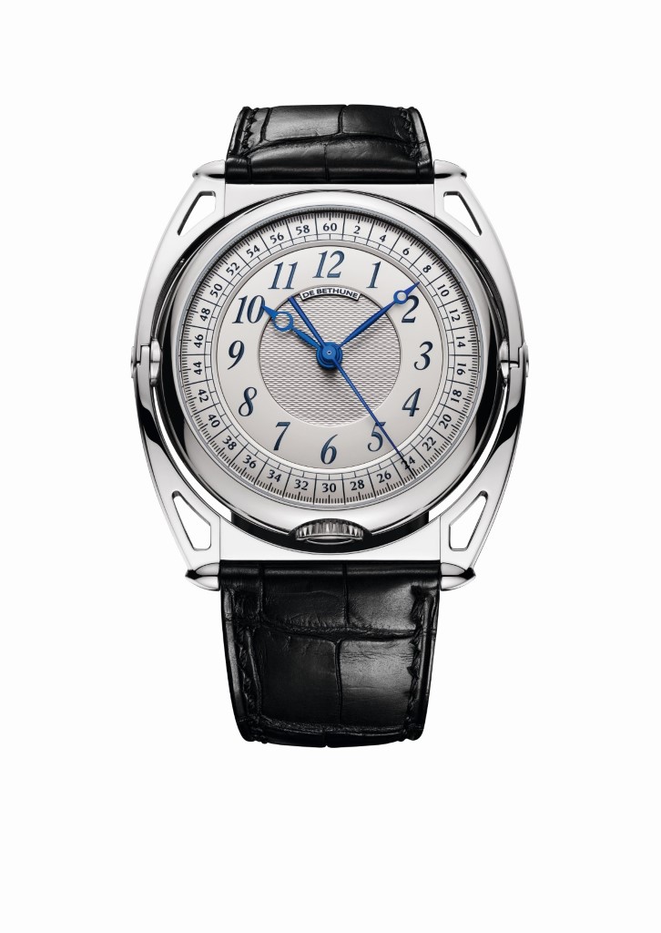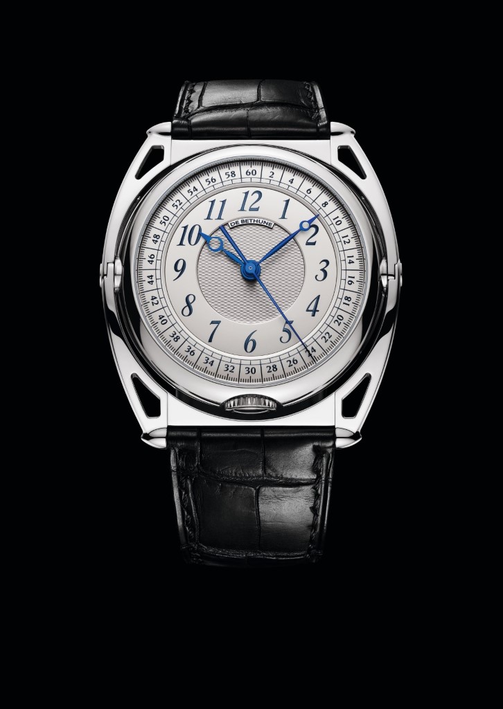 The other side reveals a dial based on more traditional aesthetic inspiration, with a finely hand-guilloché central part surrounded by the numerals already featured on the dials of De Bethune models such as the DB8 and DB10. The tourbillon with its seconds has vanished, and on this face the hours, minutes and more surprisingly the seconds hands are all centrally positioned. This represents an extremely subtle technical challenge that is not necessarily perceptible at first glance, and therein lies the elegance of this timepiece.
