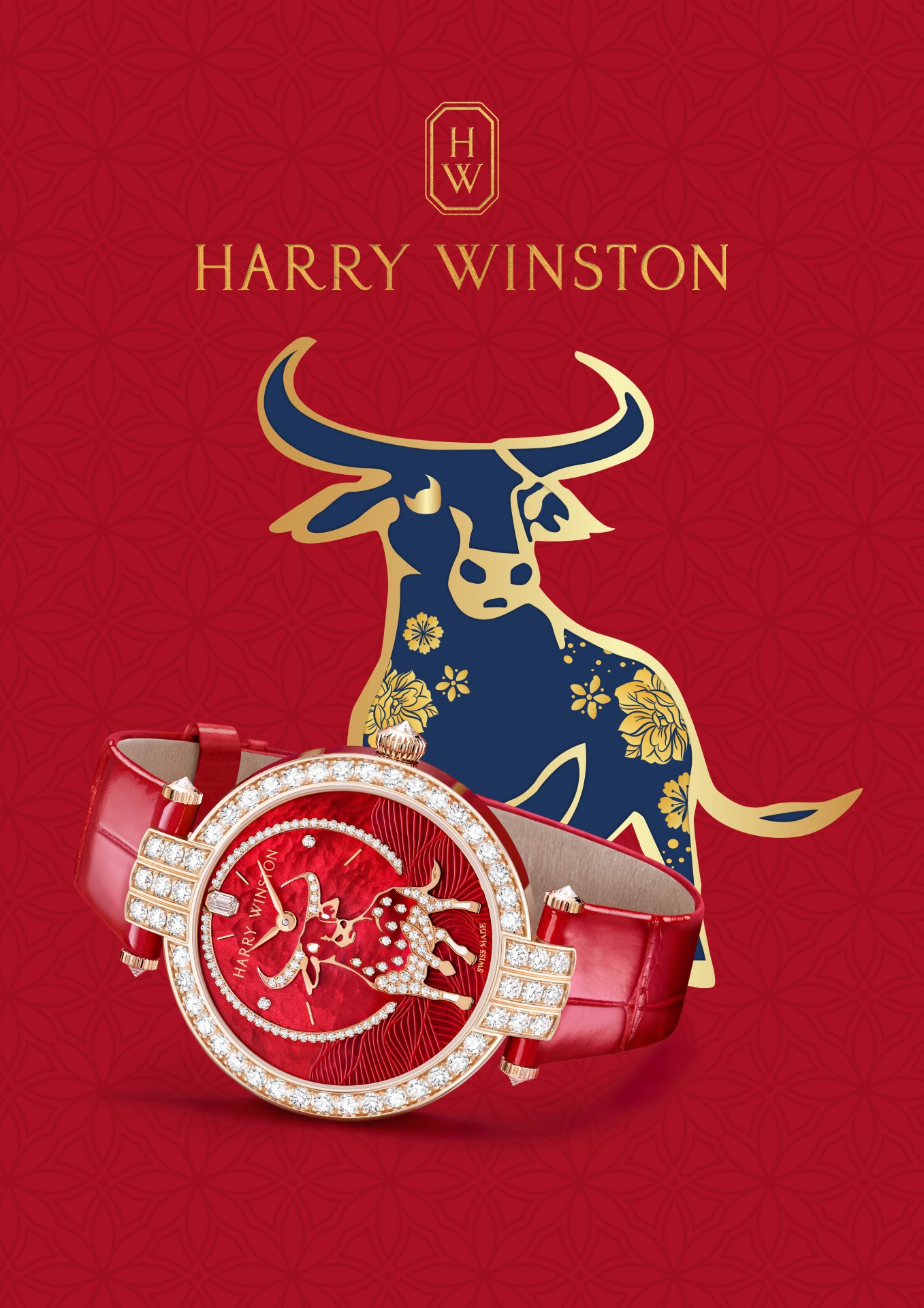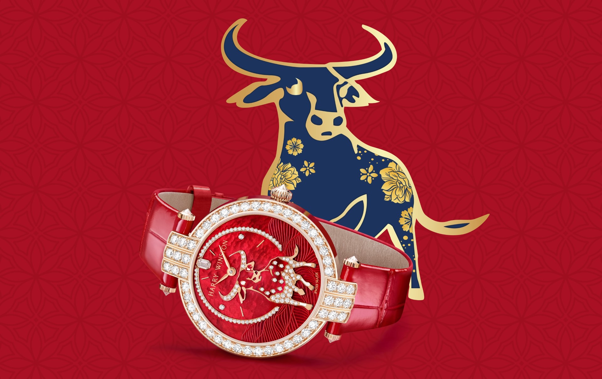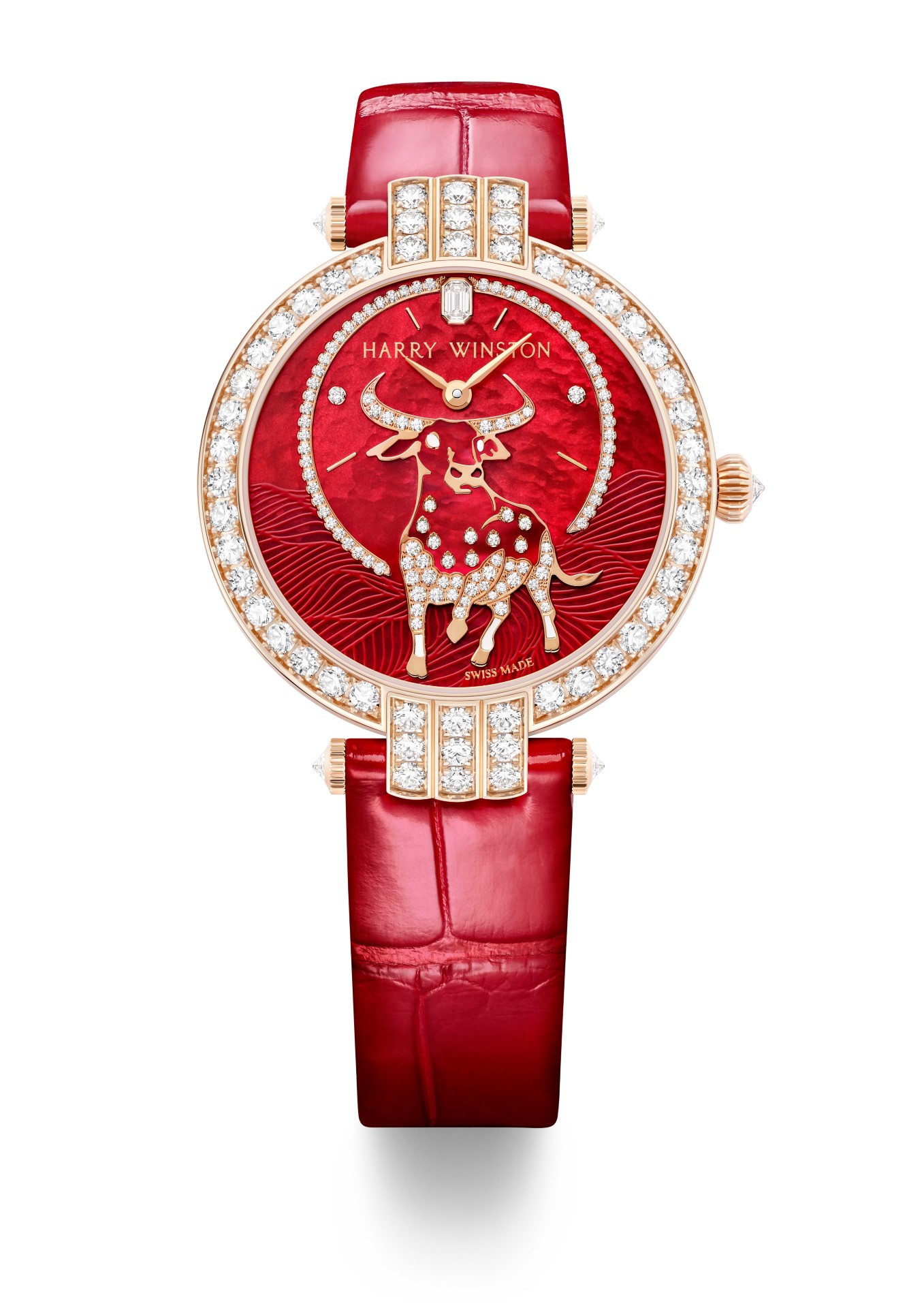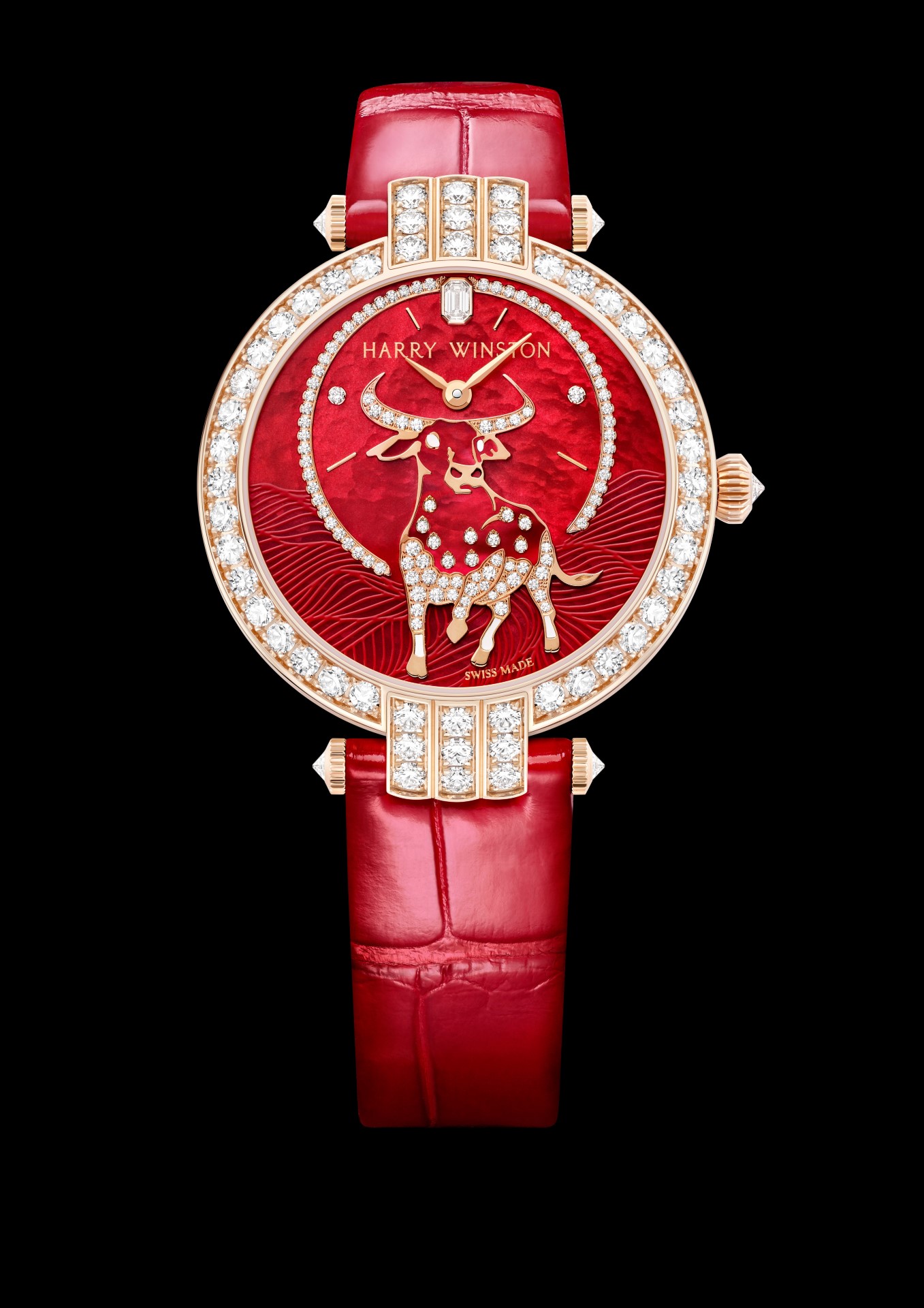 Harry Winston celebrates the Year of the Ox with a captivating rose gold timepiece from the Premier collection. Emblazoned with the powerful figure of an ox dominating a vivid red mother-of-pearl landscape, the dial sparkles with the radiance of Harry Winston diamonds – Harry Winston Premier Chinese New Year of the Ox Automatic 36mm.