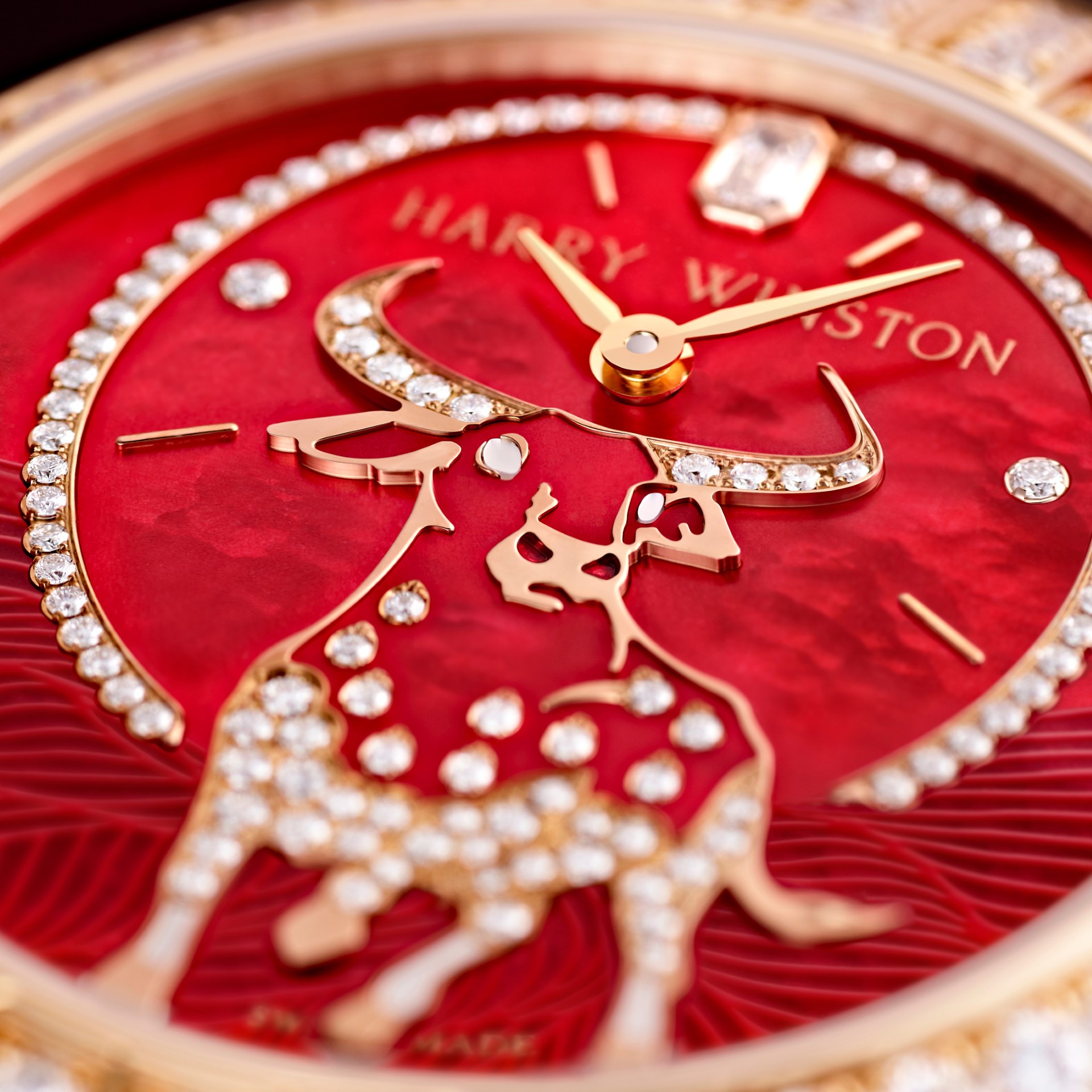 With its left hoof in mid-air and its tail swaying in motion as it charges across the red landscape, the Ox is portrayed with striking realism on the dial. The muscular silhouette of the animal, with its characteristic curved horns, strong muzzle and mighty chest, is drawn in 18-karat rose gold and then applied to the dial. Diamonds play a principal key role in the composition, and Harry Winston’s gem-setters have highlighted the horns and animated the Ox’s body with touches of light. The hours and minutes are excentered and placed just below the large emerald-cut diamond at 12 o’clock; a direct reference to Mr. Winston’s favorite diamond cut. The chapter ring framing the Ox is also set with diamonds and punctuated with two brilliant-cut diamond indexes, and four applied rose gold hour markers.