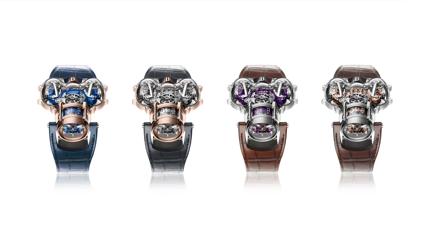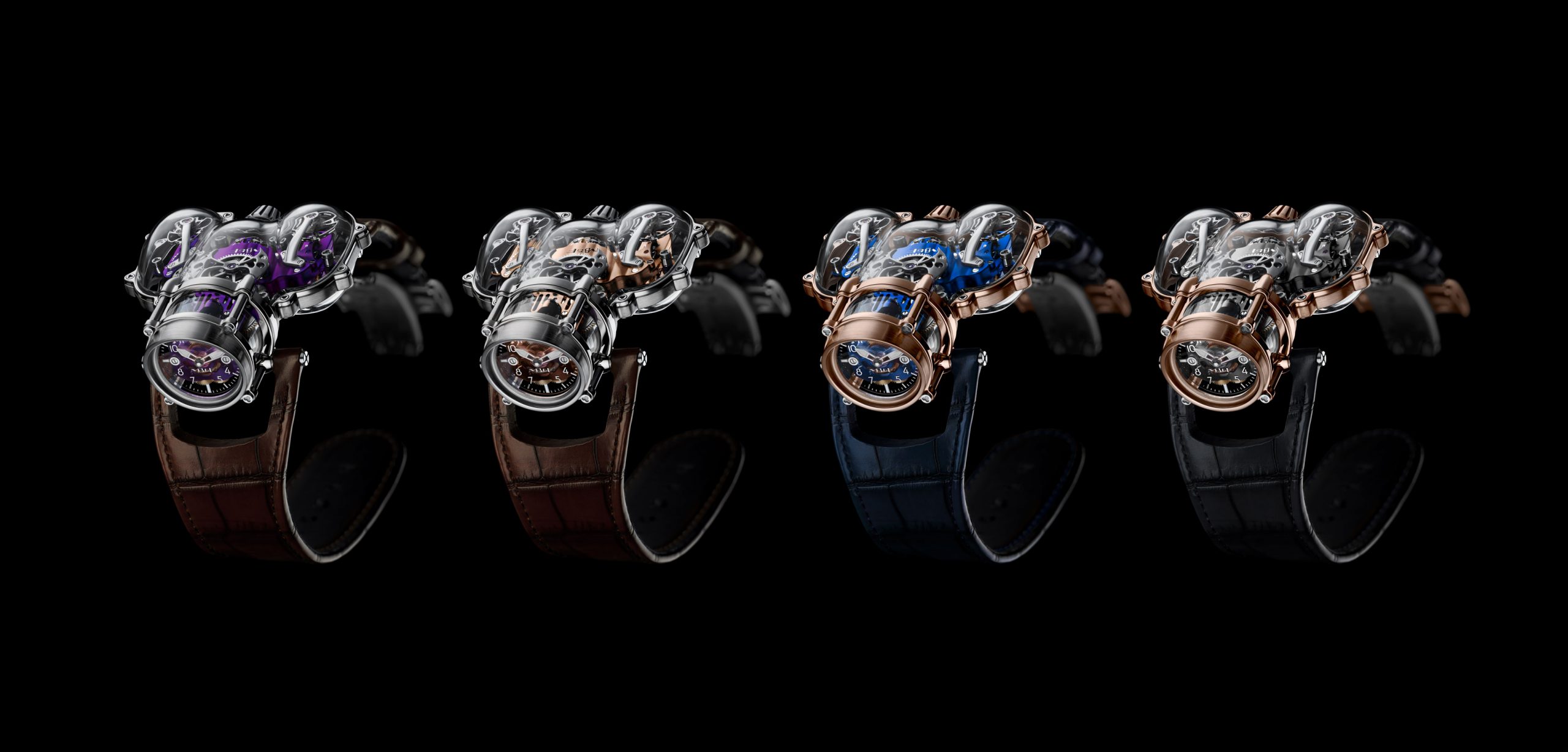MB&F Horological Machine N°9 ‘Sapphire Vision’ comes in four editions, each limited to only five pieces: two editions with 18K red gold frame, combined with a NAC-coated black or a PVD-coated blue engine; and two editions with 18K white gold frame, featuring a PVD-coated purple or a red gold plated engine.