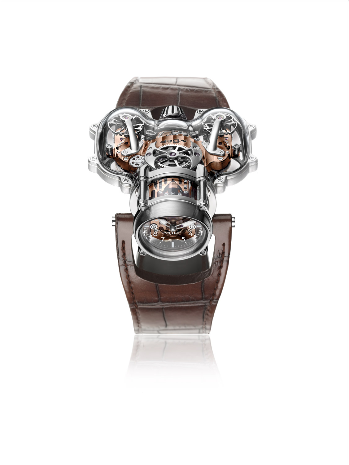 In 2007, MB&F unveiled its first Horological Machine, HM1. HM1’s sculptured, three-dimensional case and beautifully finished engine (movement) set the standard for the idiosyncratic Horological Machines that have followed – all Machines that tell the time, rather than Machines to tell the time. The Horological Machines have explored space (HM2, HM3, HM6), the sky (HM4, HM9), the road (HM5, HMX, HM8) and the animal kingdom (HM7, HM10).