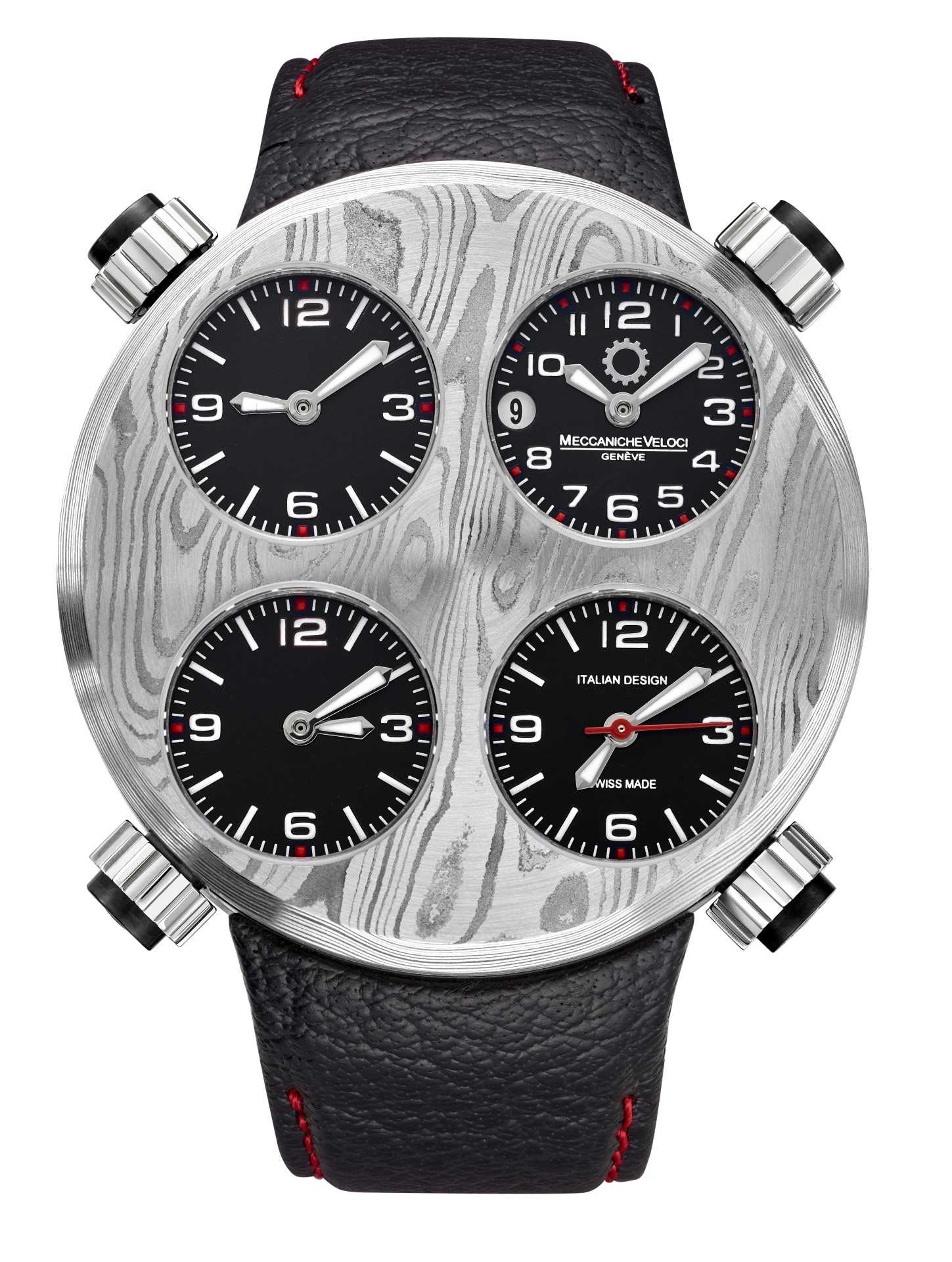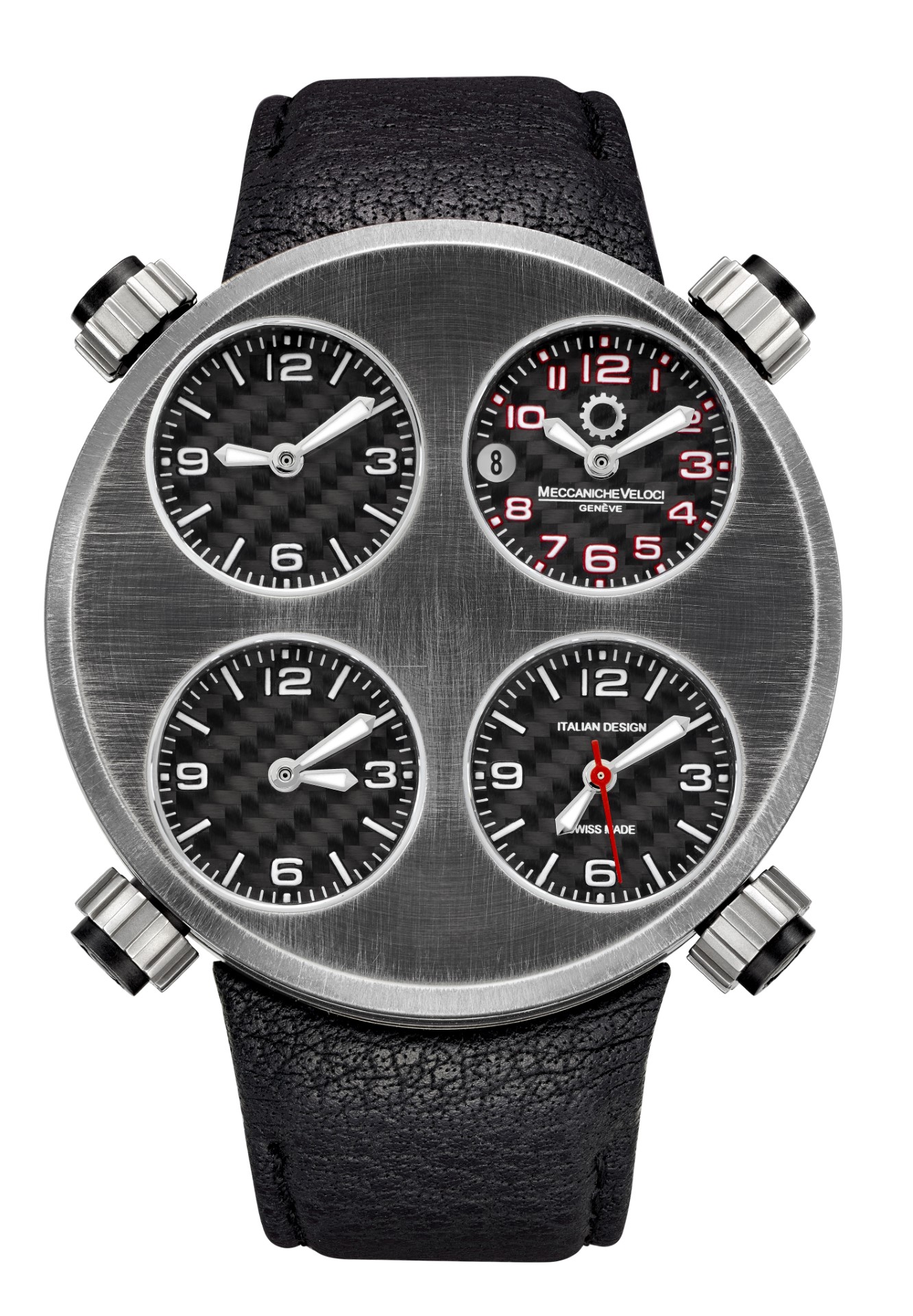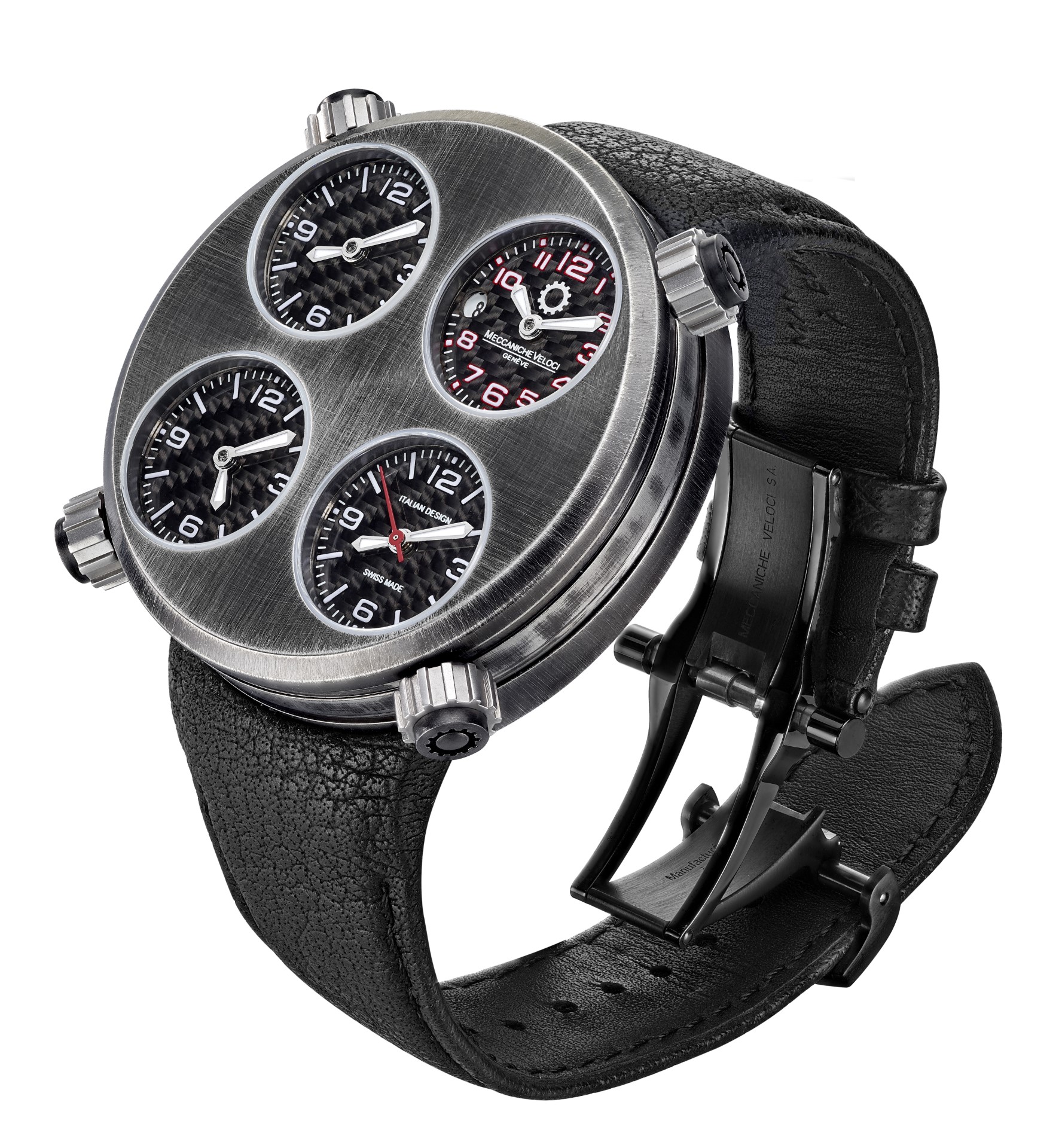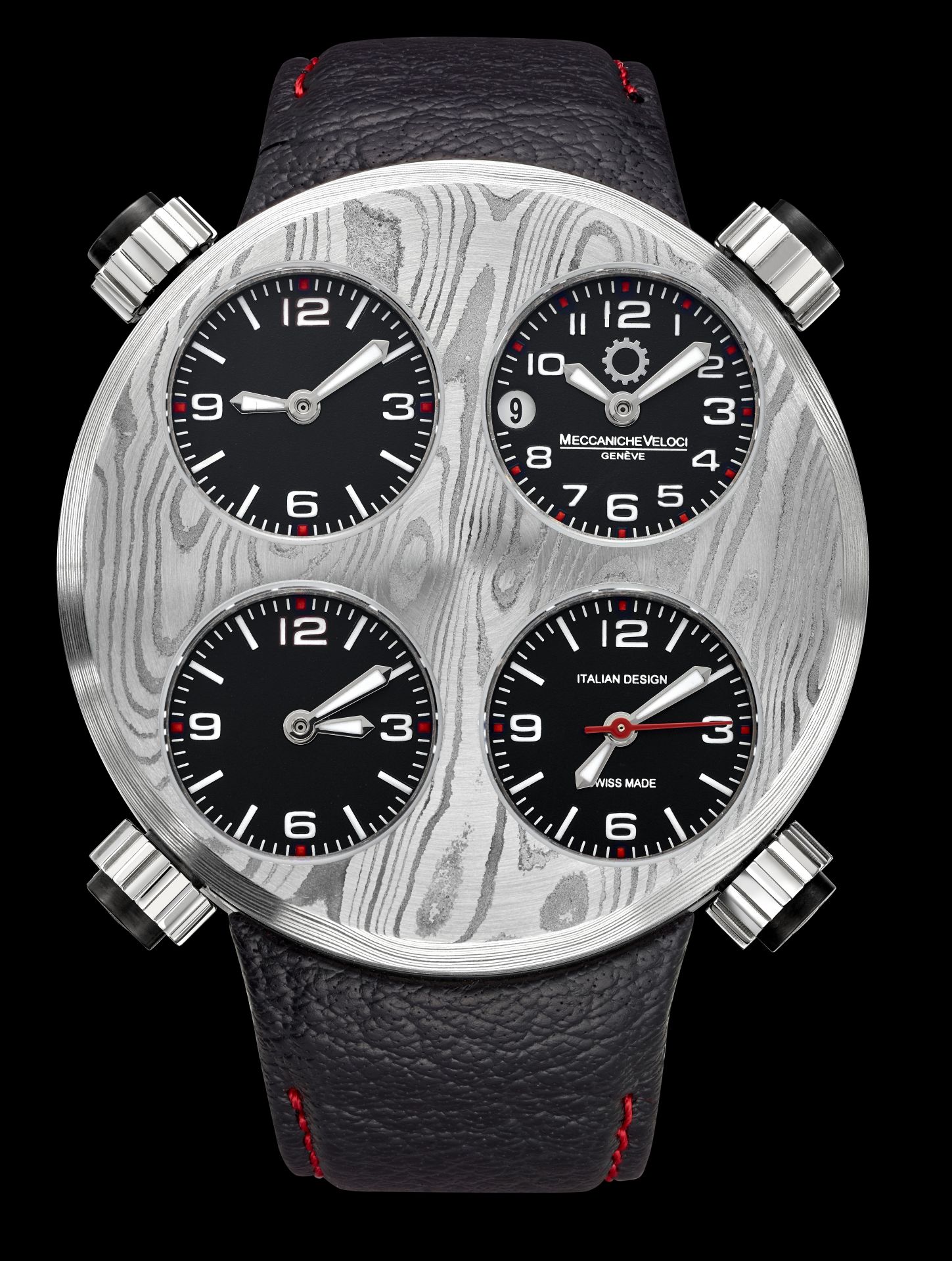 The metal of the 49 millimeter case and of the bezel shows a texture characterized by irregular “waves” that create shiny and opaque effects. In this unreleased background stand out the distinctive four matt black dials, each one indicating minutes and hours, while the date and the red seconds hand are located on the bottom right dial and top right dial. The functions of every single dial are regulated via their corresponding crowns.