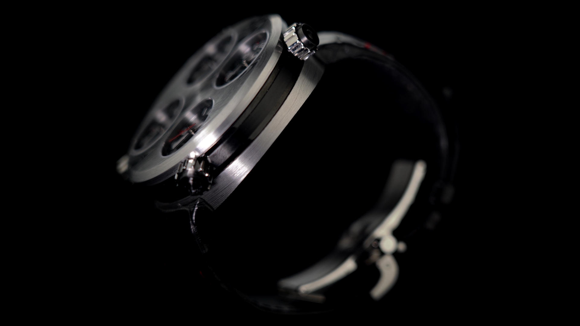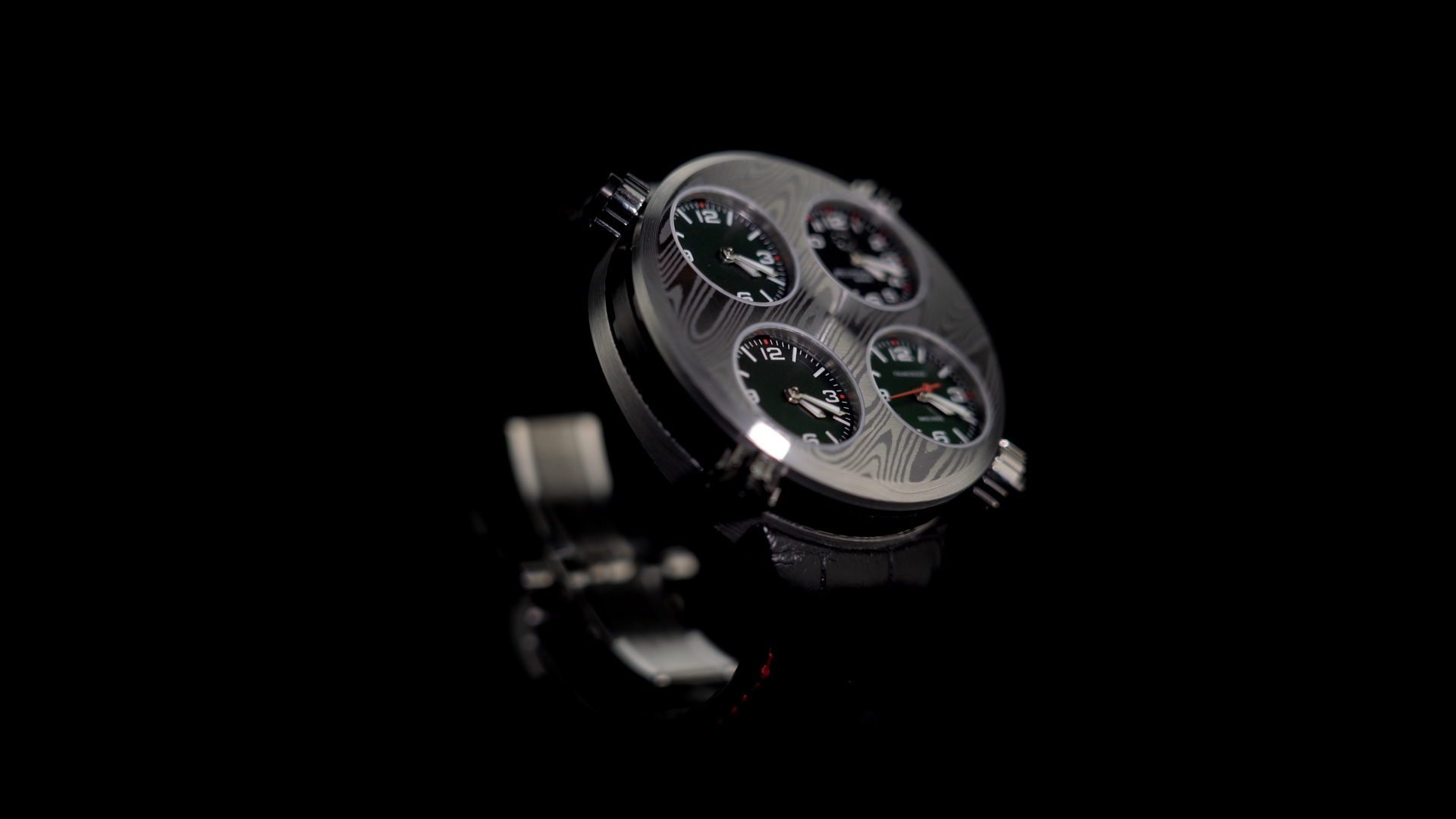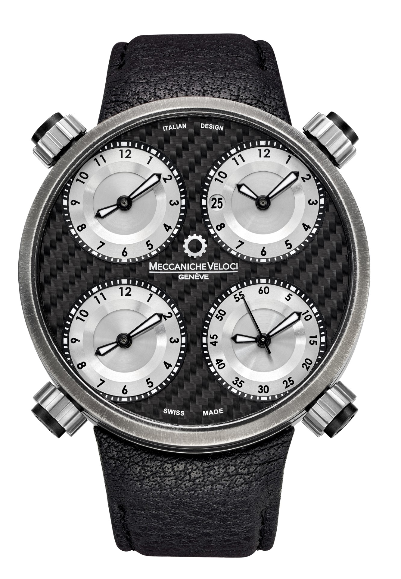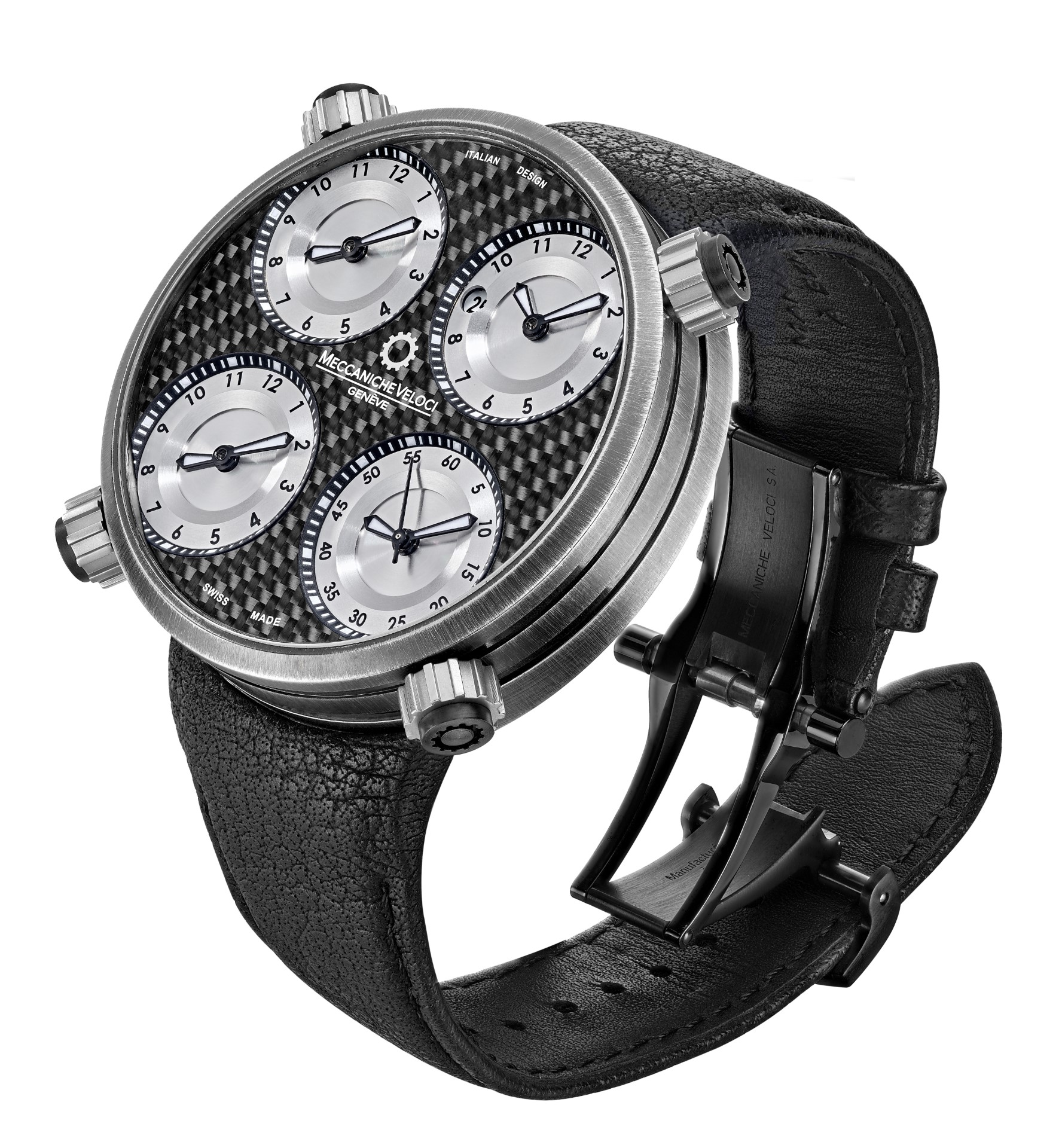 The metal of the 49 millimeter case and of the bezel shows a texture characterized by irregular “waves” that create shiny and opaque effects. In this unreleased background stand out the distinctive four matt black dials, each one indicating minutes and hours, while the date and the red seconds hand are located on the bottom right dial and top right dial. The functions of every single dial are regulated via their corresponding crowns.