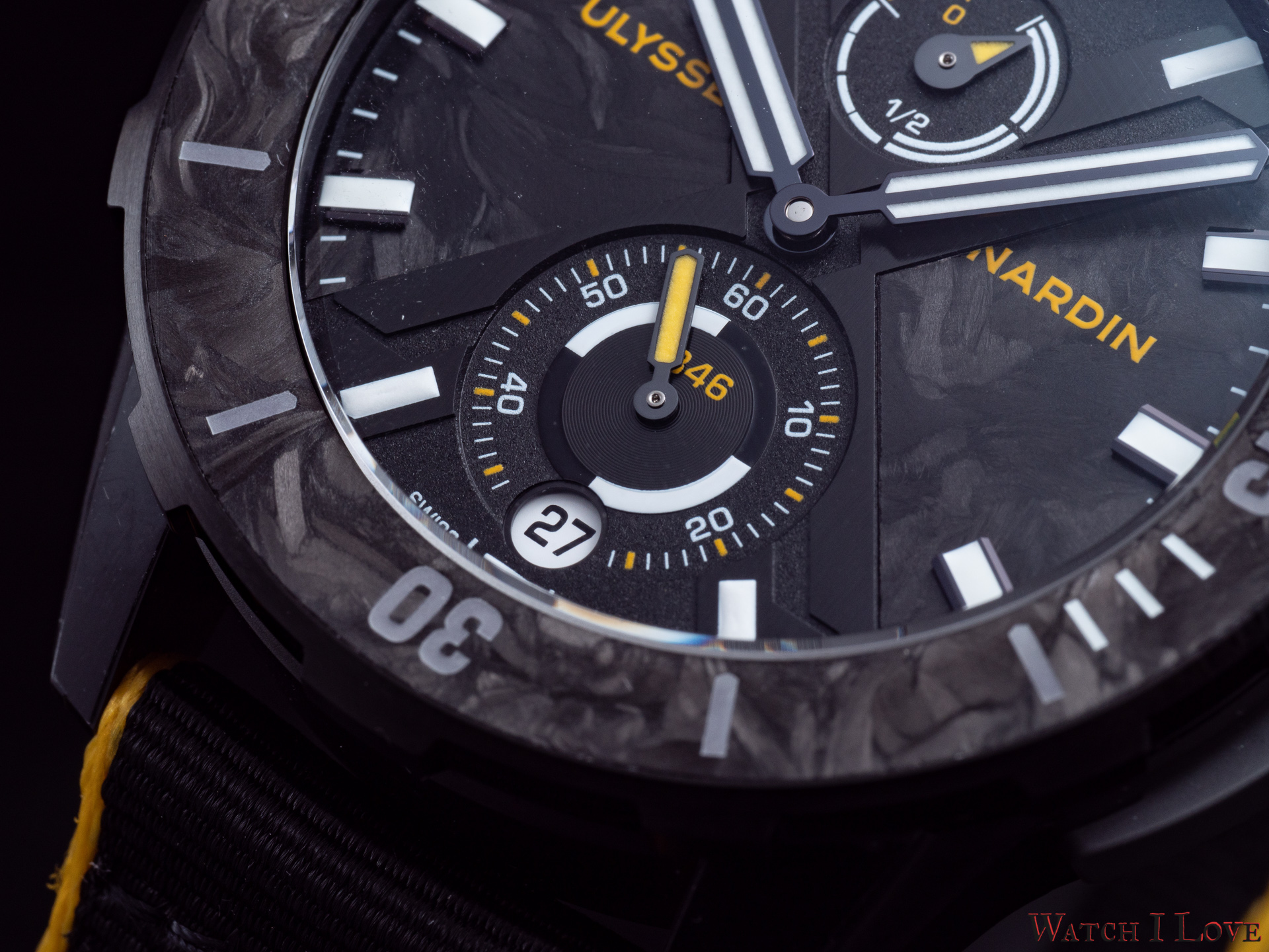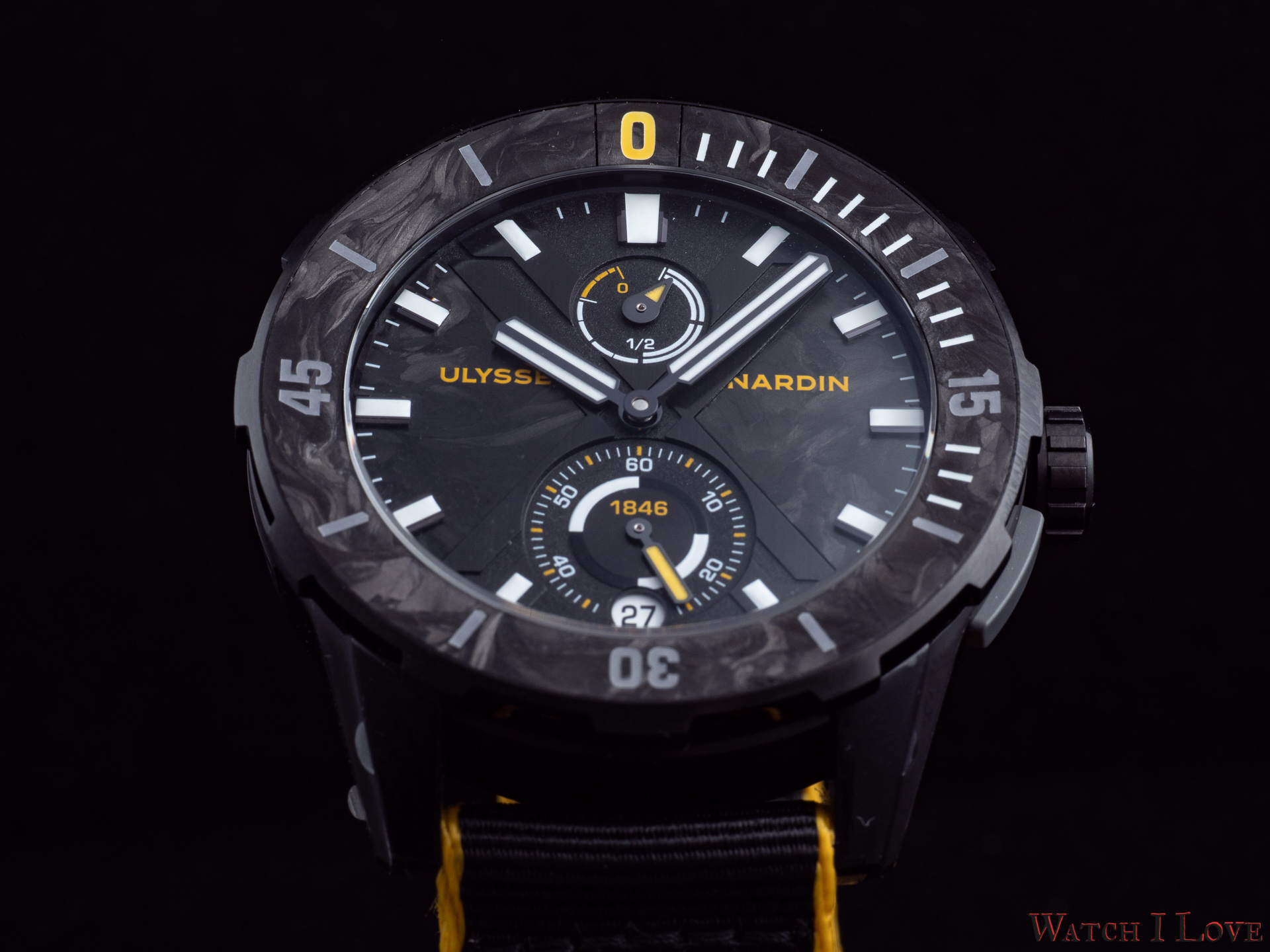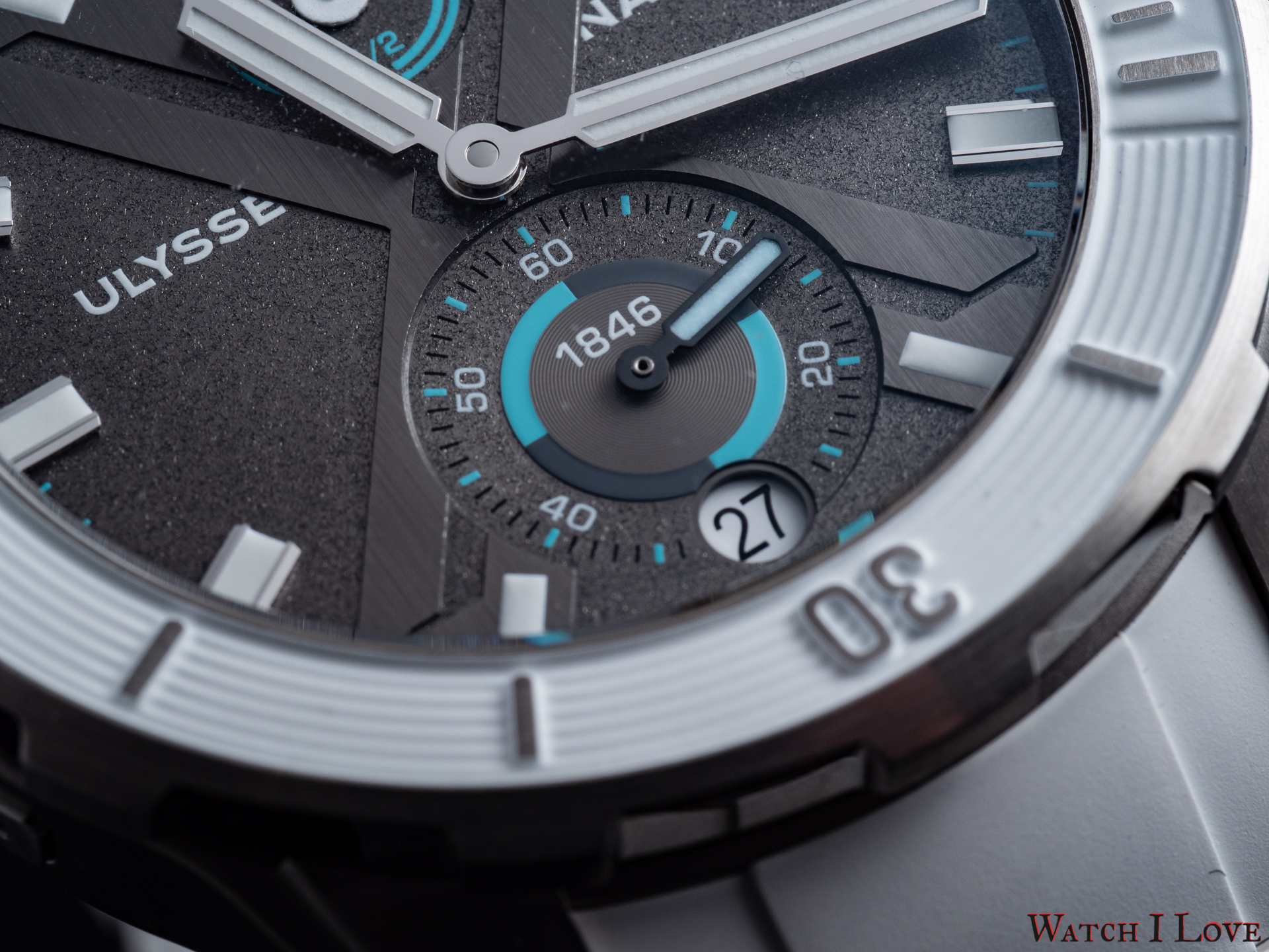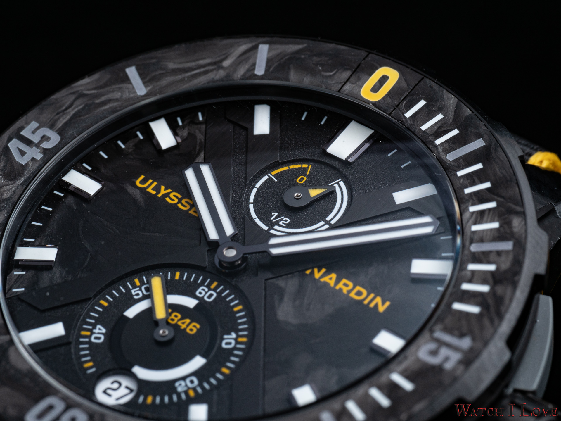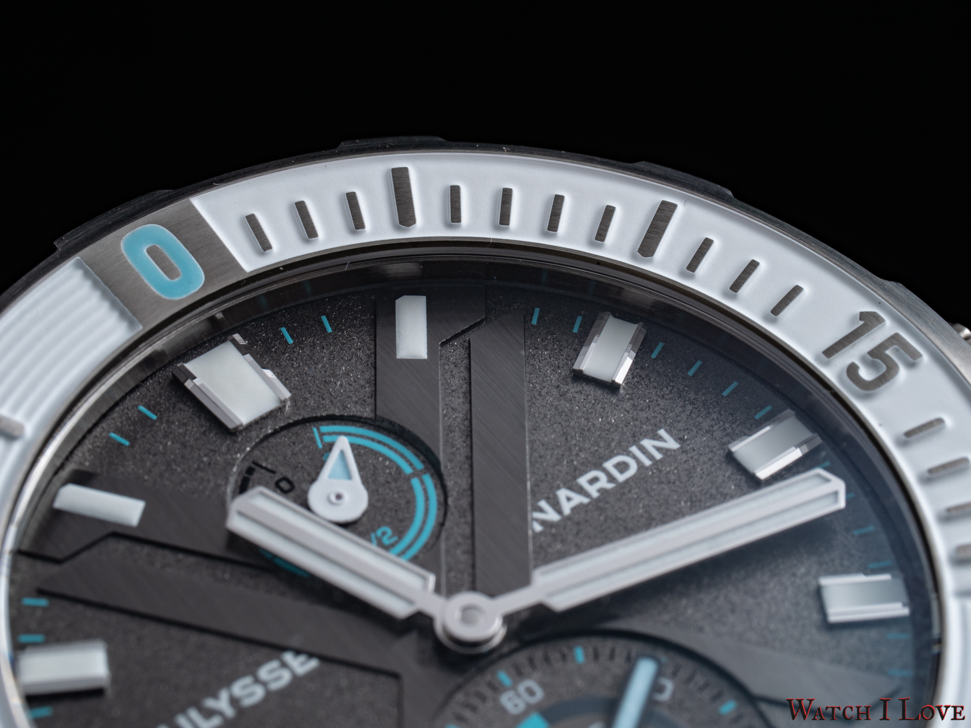 Ulysse Nardin Diver X Cape Horn presents some carbon insert on the dial and on the bezel. The indexes are also blackened. The luminescent was kept the same as on the other two Diver X variants. All the details are kept the same, including the circular pattern present on the running seconds sub-dial.