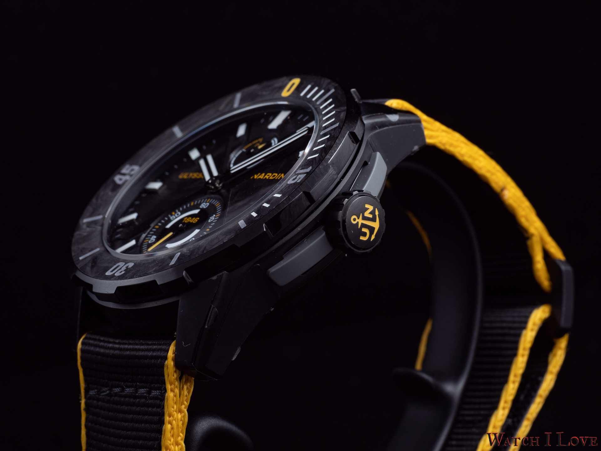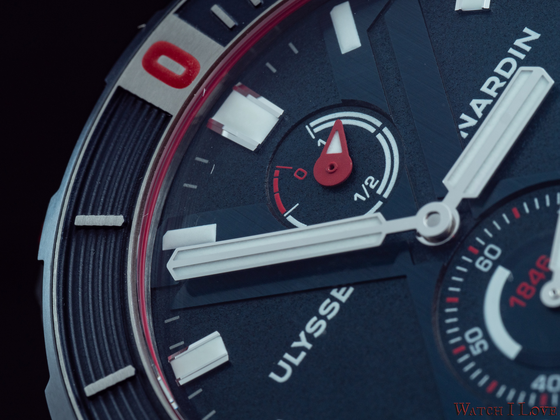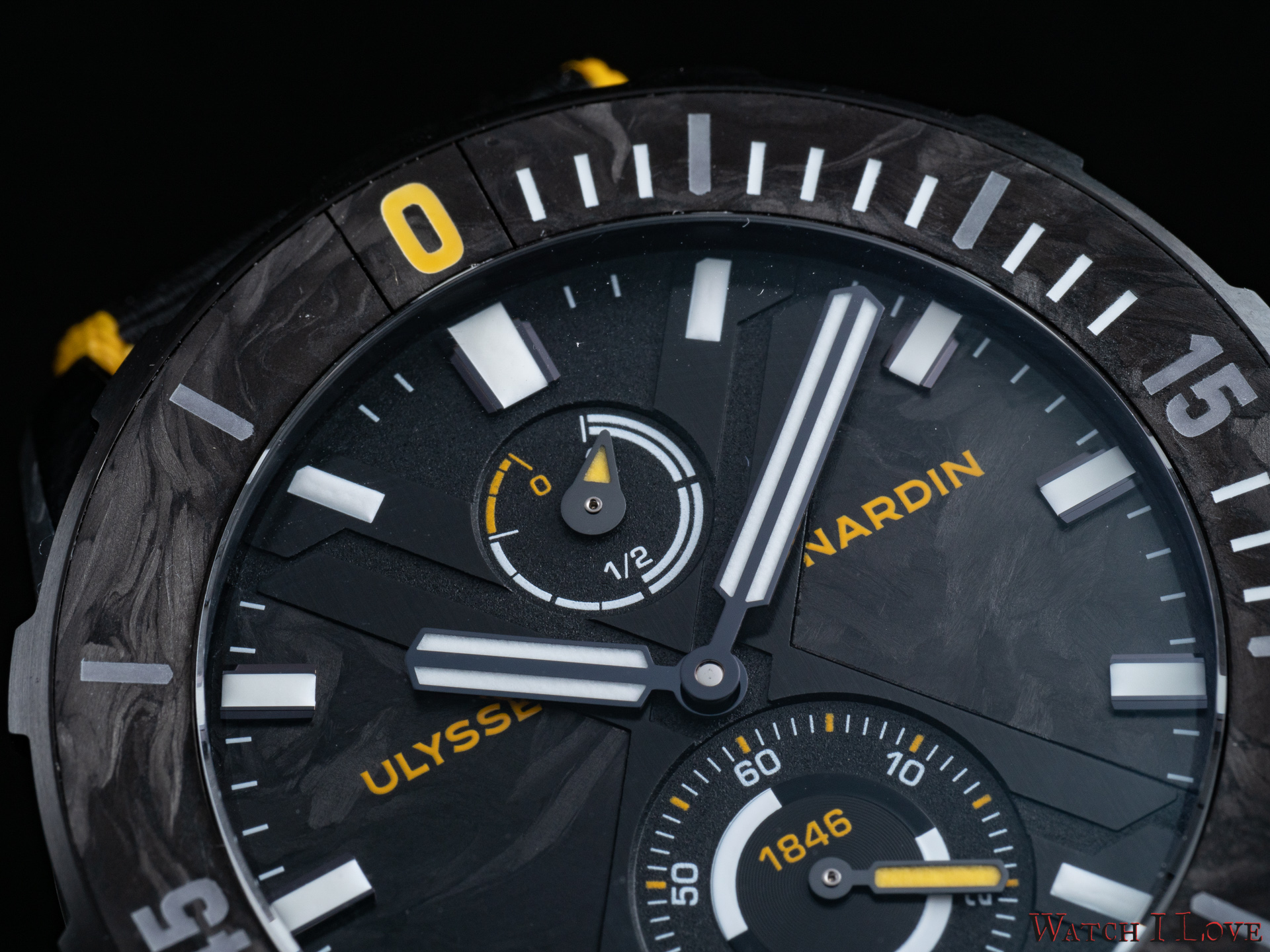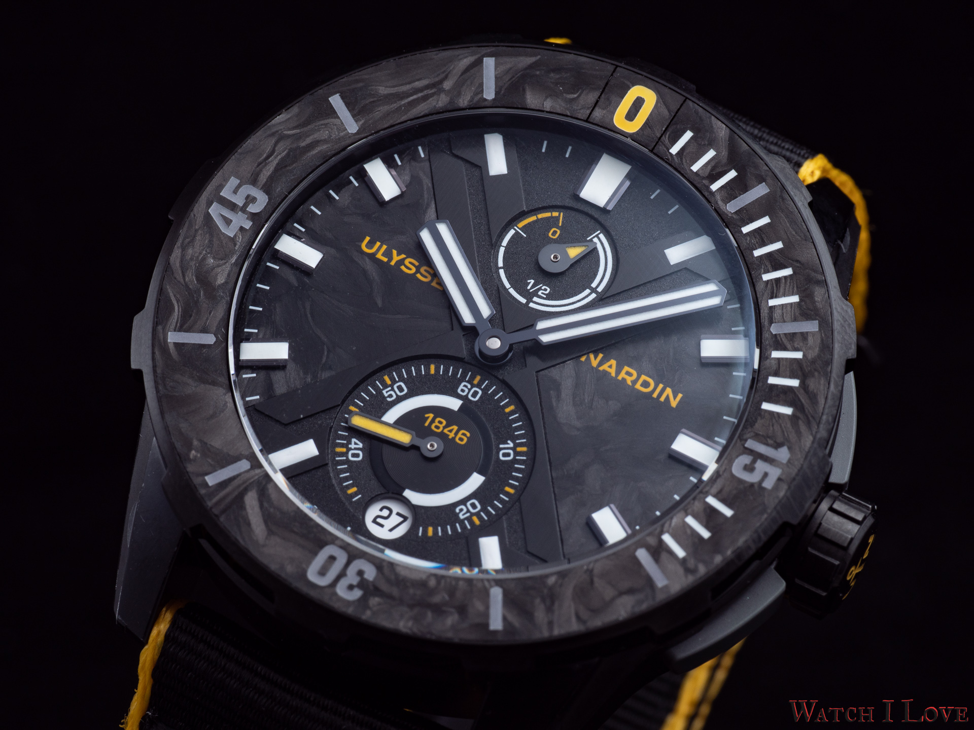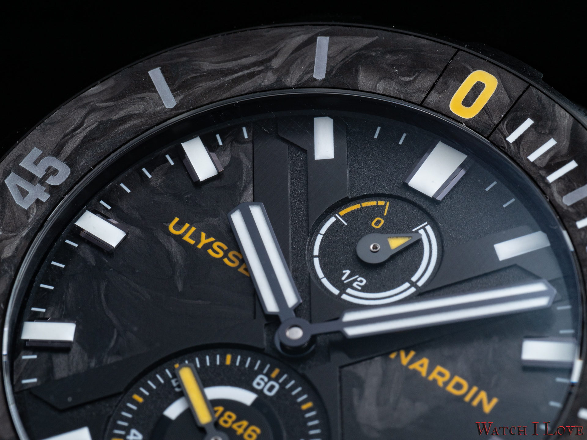 Ulysse Nardin Diver X Cape Horn presents some carbon insert on the dial and on the bezel. The indexes are also blackened. The luminescent was kept the same as on the other two Diver X variants. All the details are kept the same, including the circular pattern present on the running seconds sub-dial.