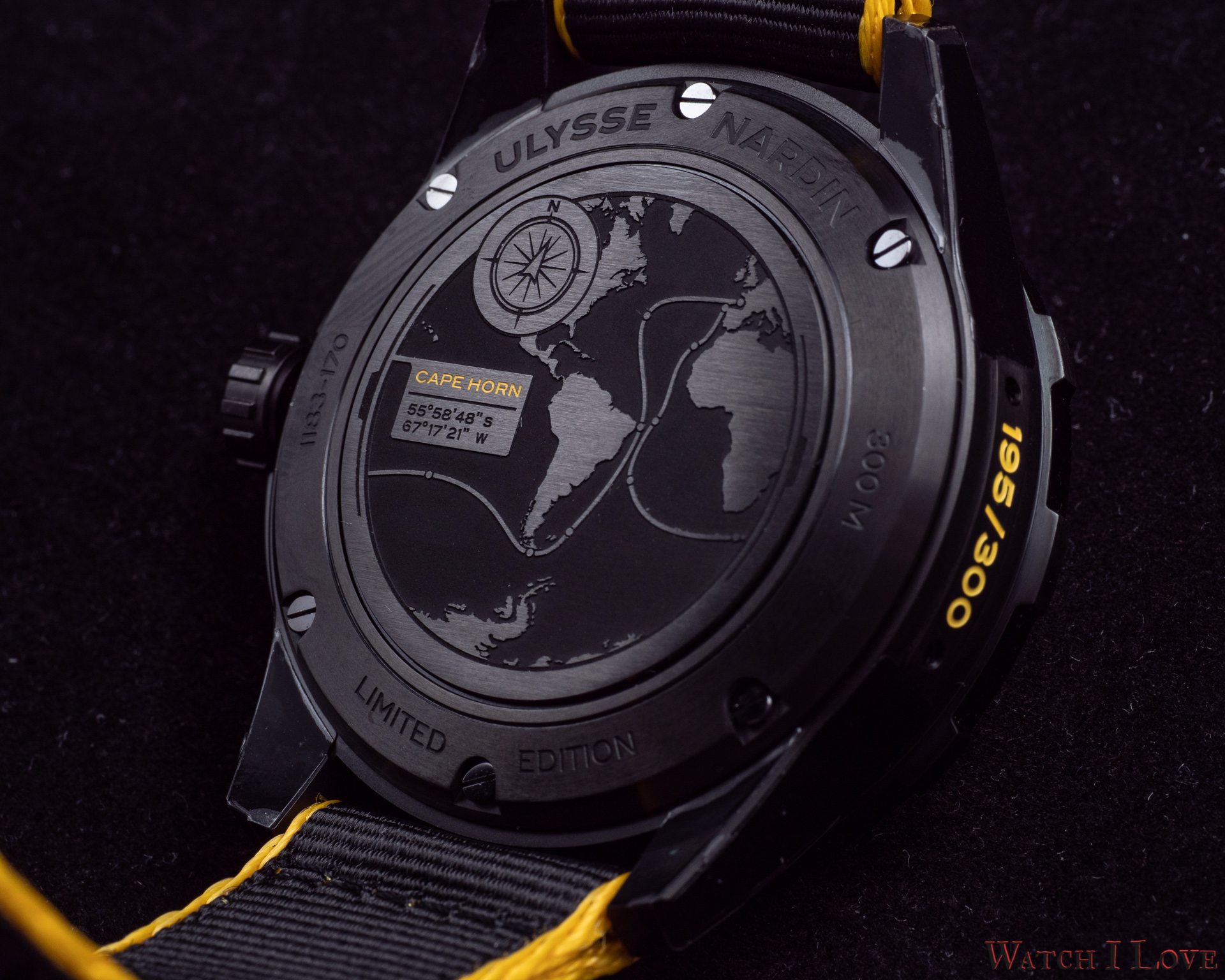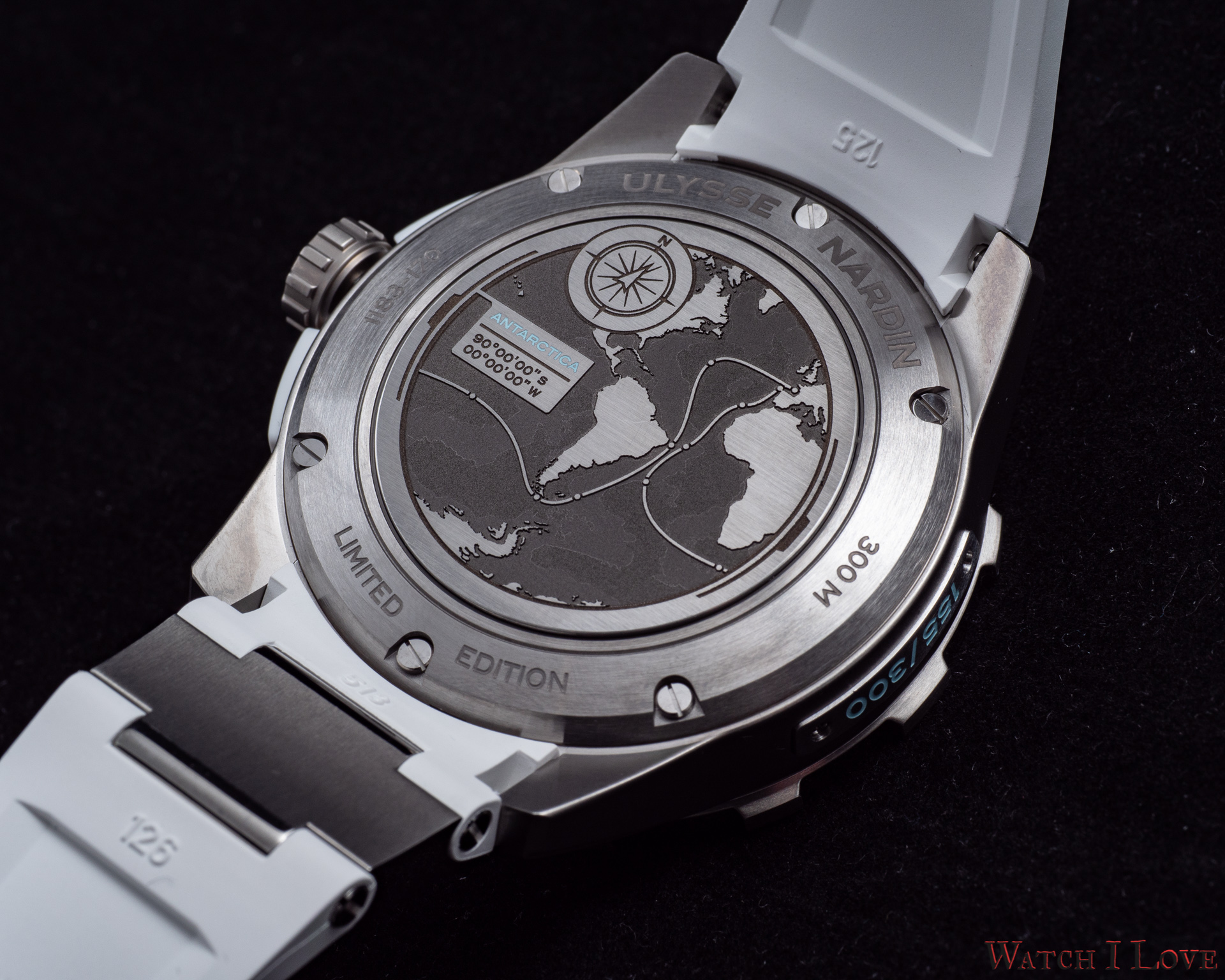 The watch case also features a screw plate with the watch number in the limited edition – this is now a standard between Ulysse Nardin pieces. The back of the watch is decorated with the coordinates of the Antarctic Continent: 90° latitude (with no longitude necessary for the landmass located at the southernmost tip of the Earth) and also with the route of the Vendée Globe sailing race.